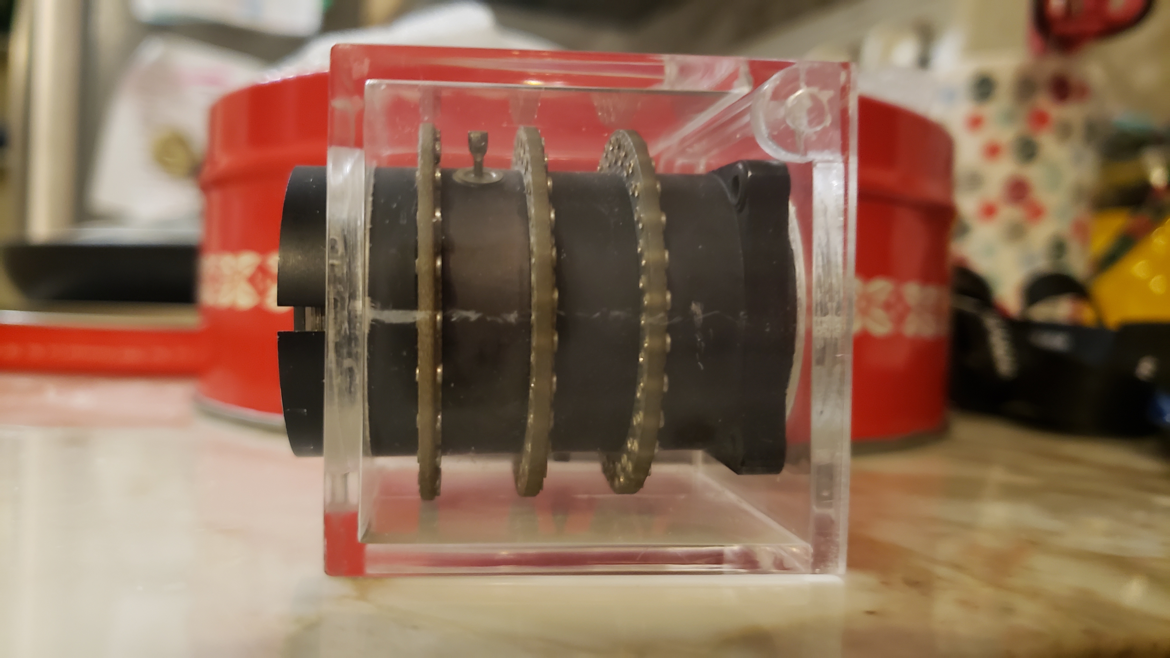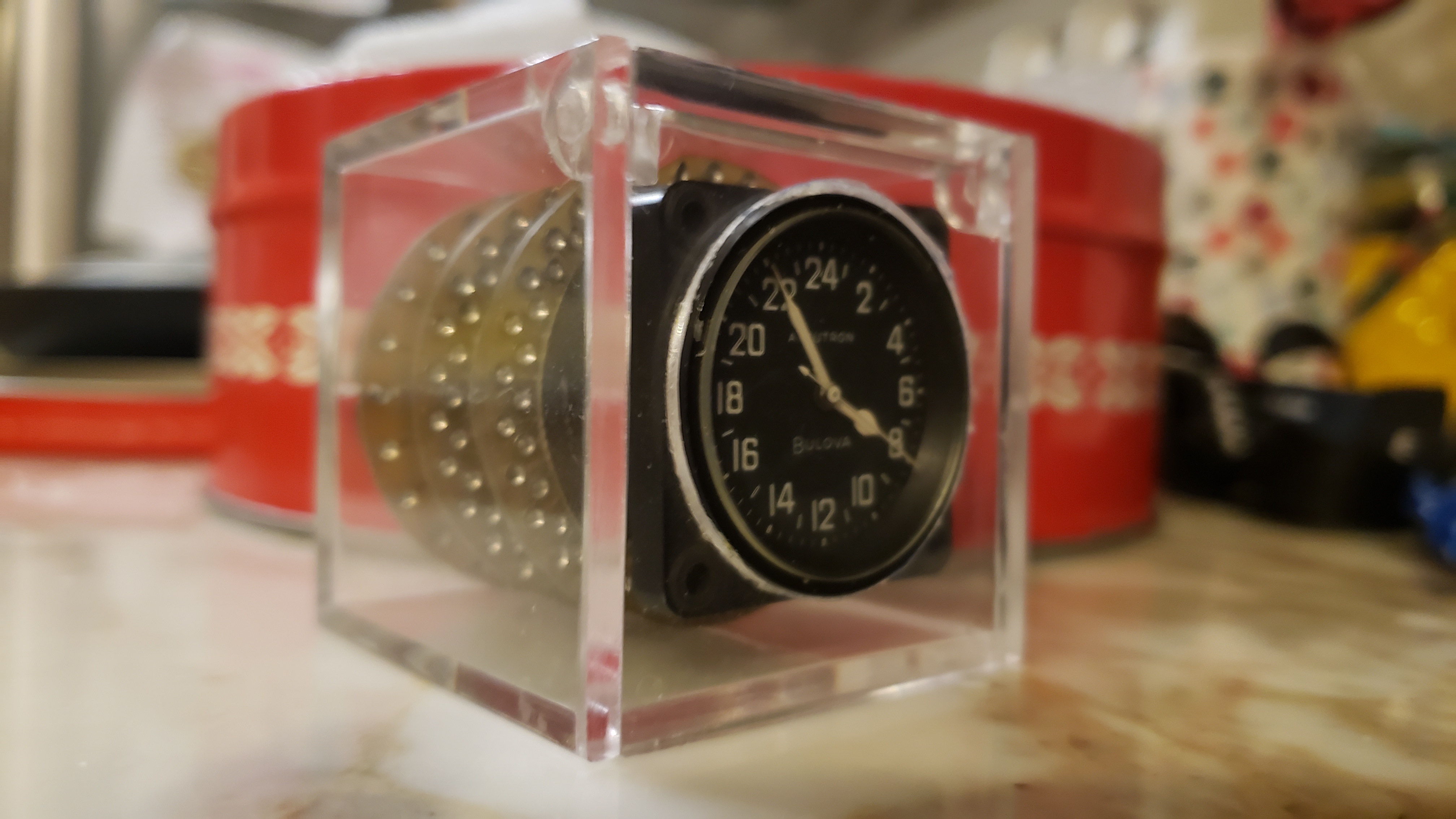 ·A gent put this on ebay, and I had to bite. This is the only other one I've seen that you can even find a picture of. All of the timer clocks were specialty orders, but this one was likely one of the more expensive variants. It weighs 116 grams. If you ordered just the clock and one module it is 65 grams and each additional module ordered is 25 grams. This clock has 3 modules. Each module has fins with wire contact points for hours, minutes, and seconds based on the number of holes. The seller got it at an estate auction and the gent's name didn't pull up anything important. The tag says it came from the Naval Ordnance Laboratory which closed down in the early 90s. The seller and the estate were in Maryland, so I believe the swing tag is true, especially since Bulova made instrument clocks and trigger timer switches for every military ordnance department. This timer clock was never installed in anything since there is no residual solder on any of the contact points. I also made a little case for it so I can protect the fins.