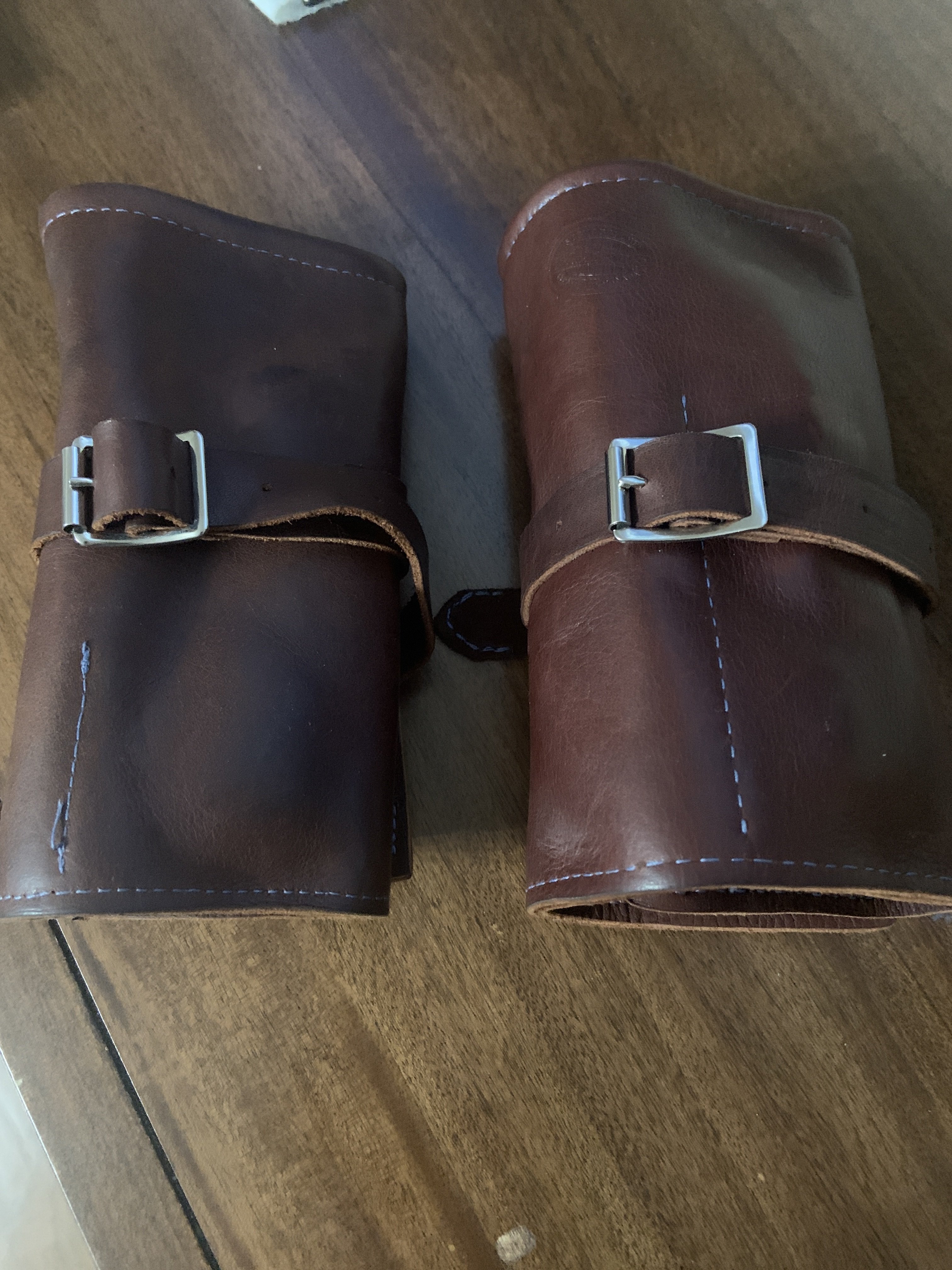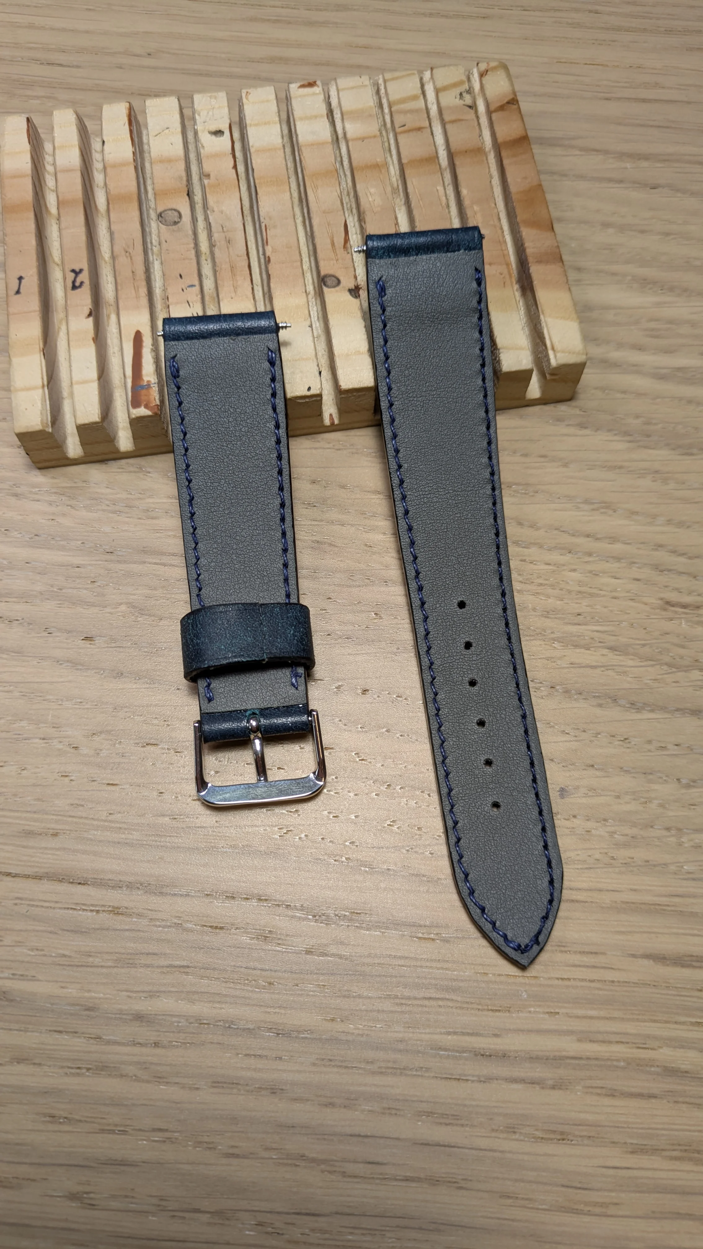 Just finished making these 20/18 125/75 straps with Pueblo Sapphire Blue leather, Velodon reinforcement (for the lug ends), Salpa reinforcement to make the straps thicker, and calh skin grey leather as the liner. The stitching is ftom RMLS Masterfil waxed linen thread, 0.45mm.