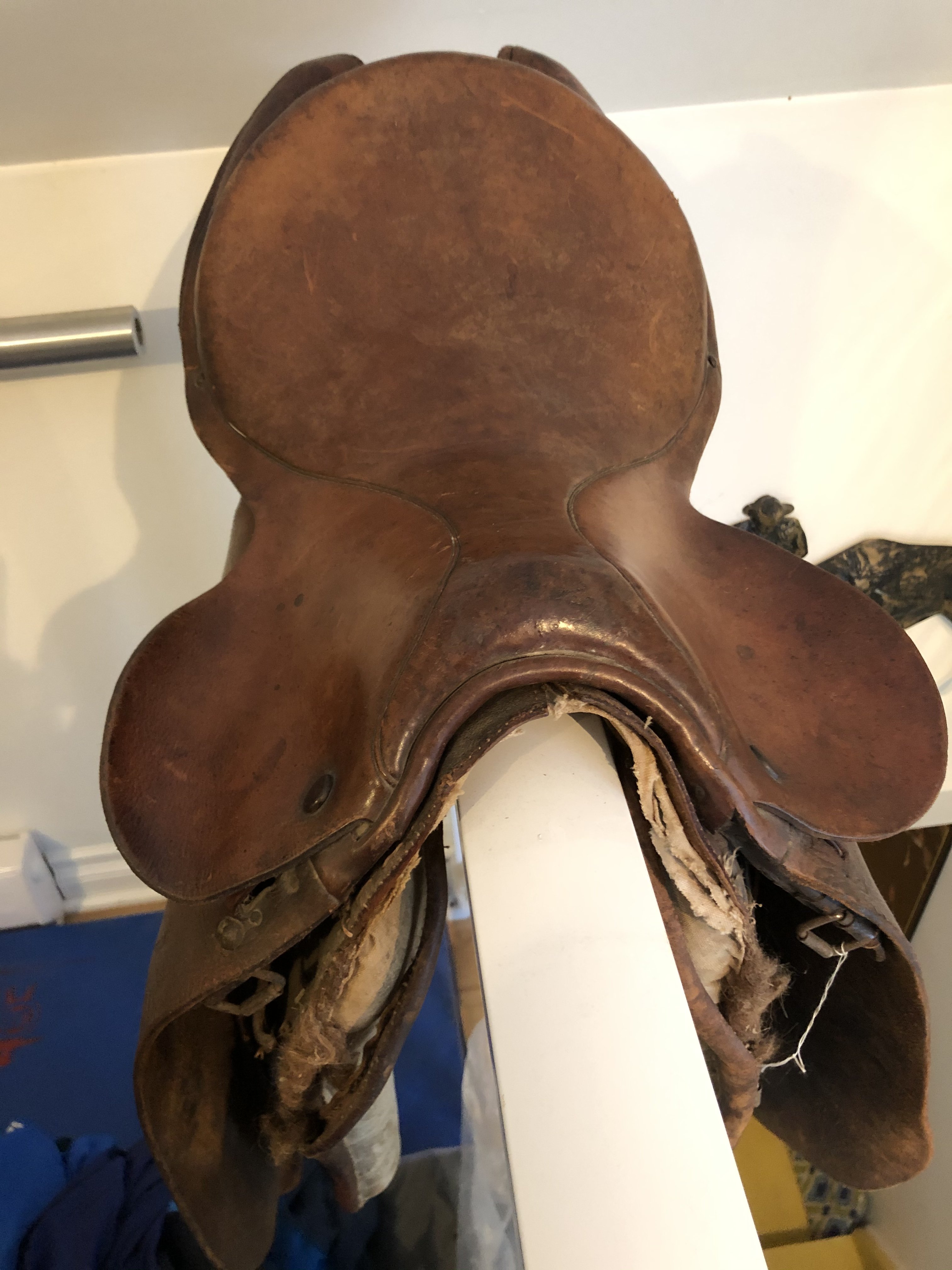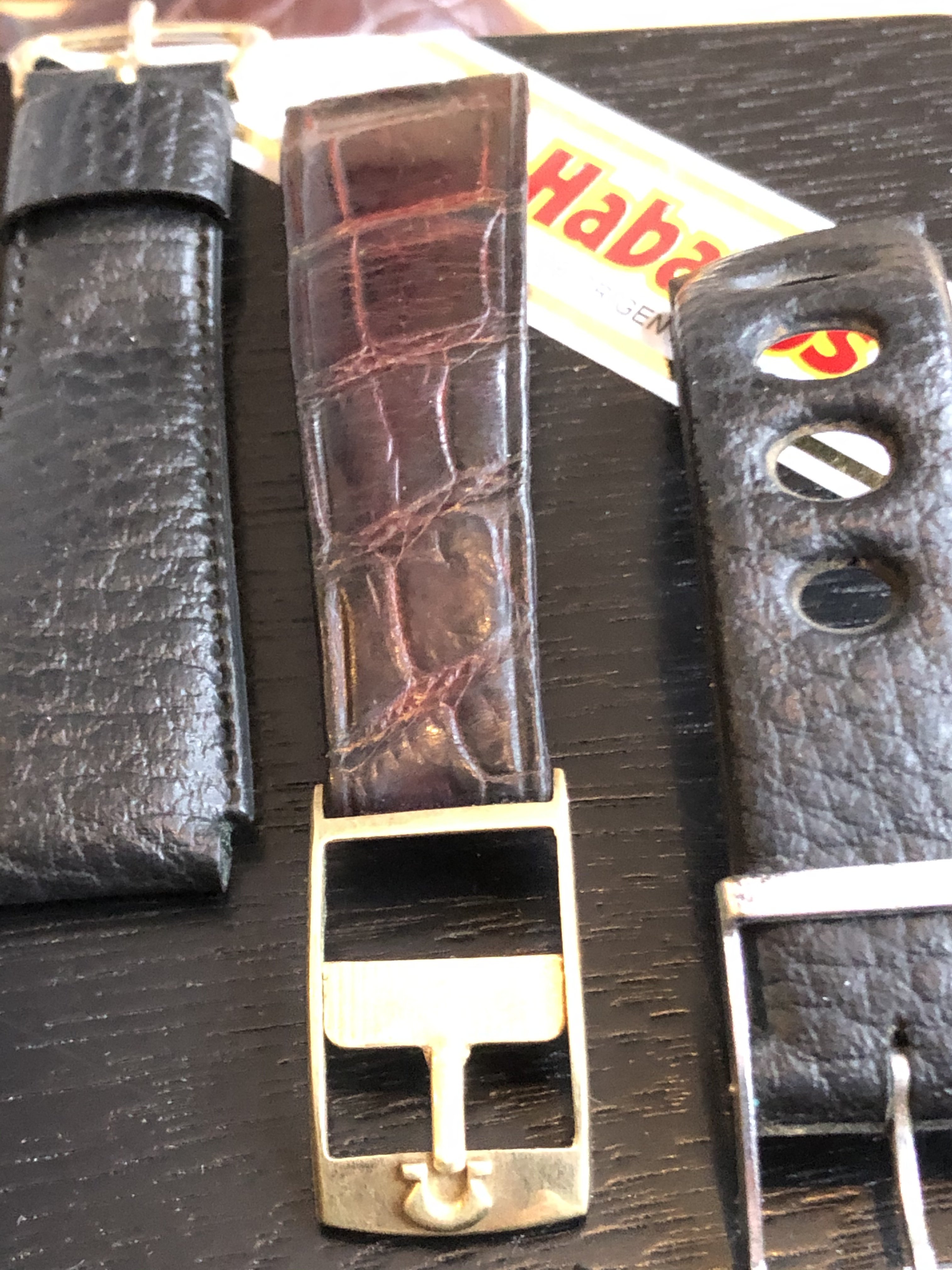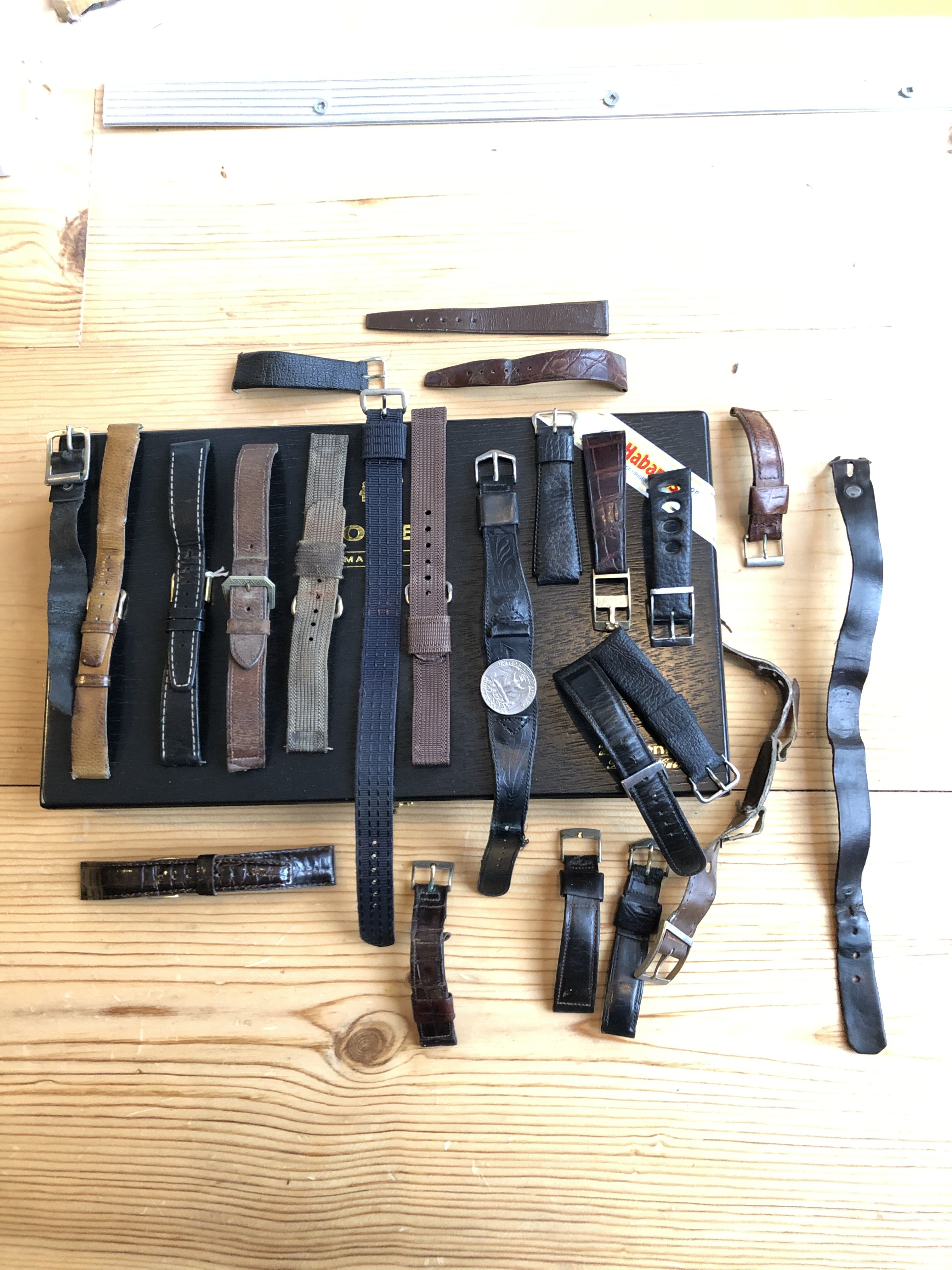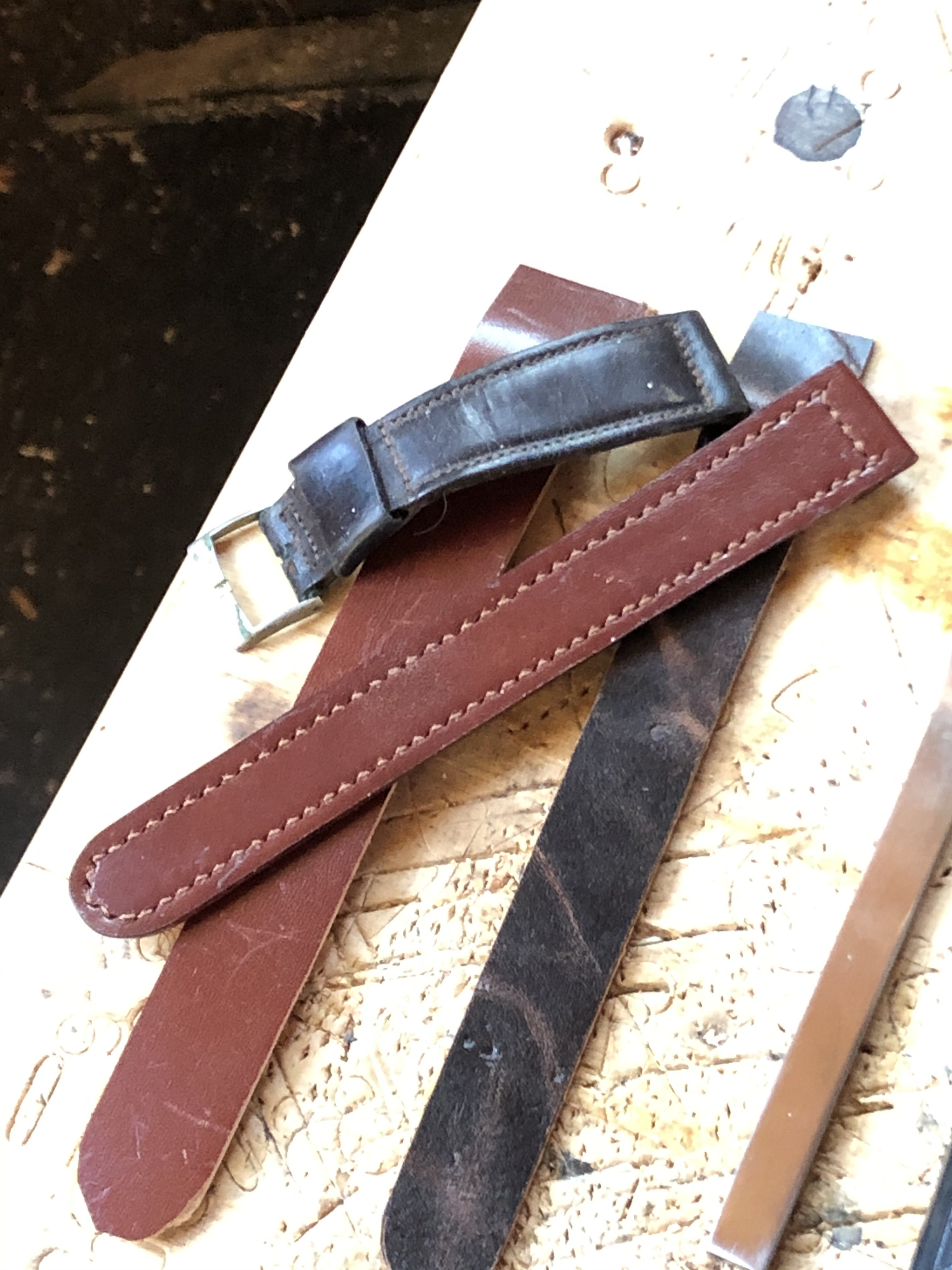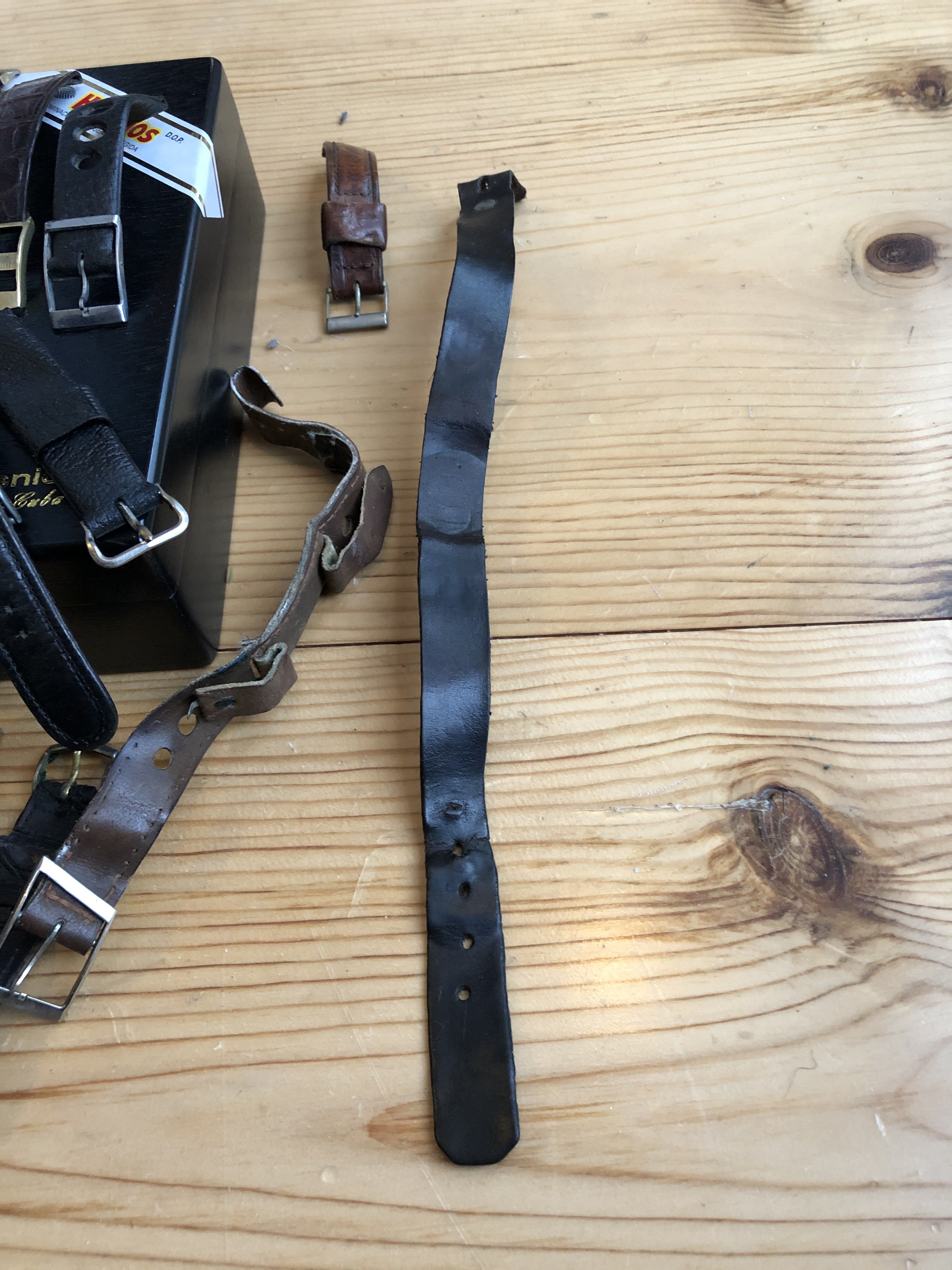 I found some goodies in my jeweller’s office. Nothing of significant value but very educational. My favorite is the long leather strap on the far right. Looks right out of the war. I may use an old saddle (1930s I am told) to make some of these. Looks like one-layer strap with center bar buckle and rivet.
