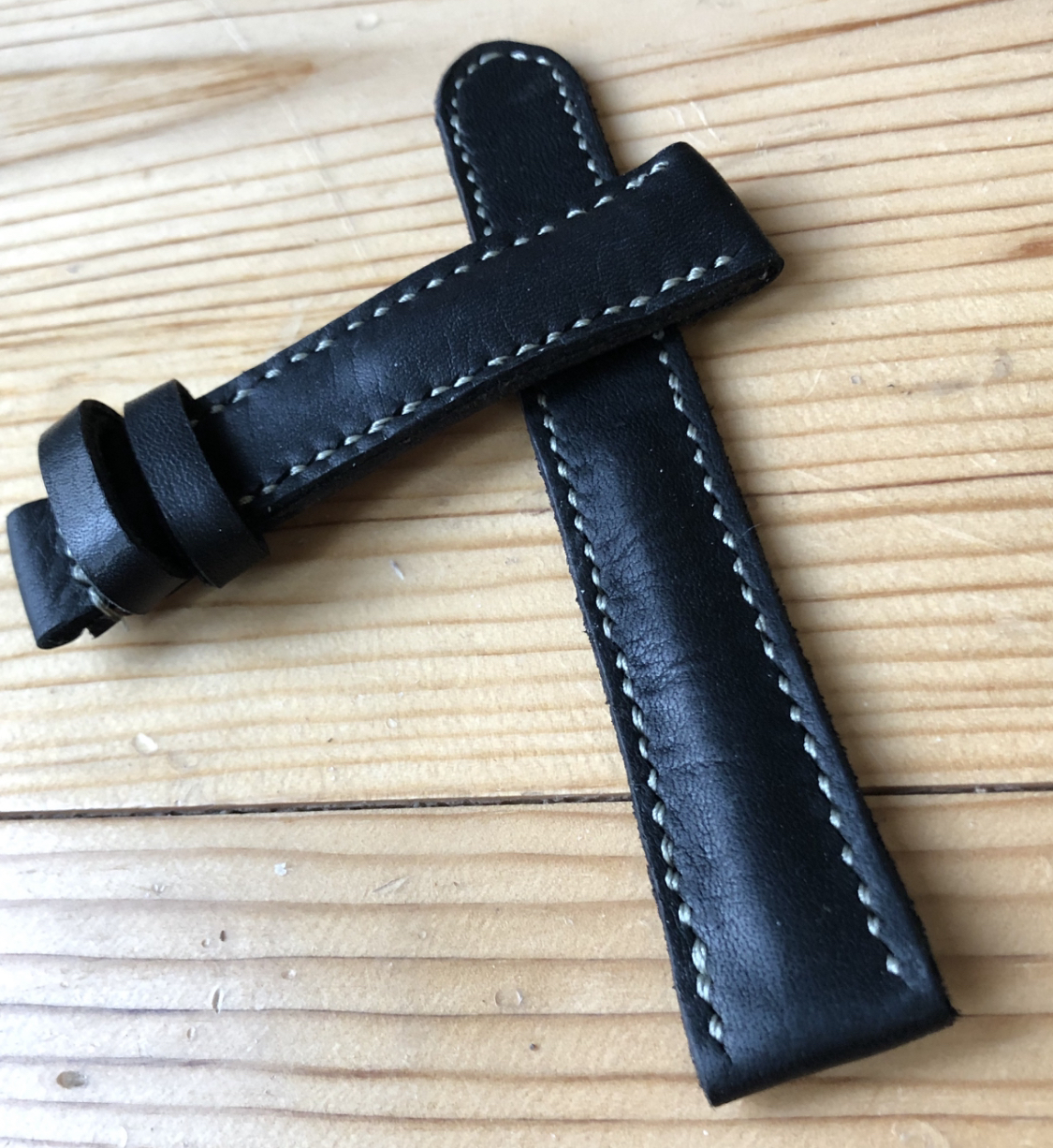 Today I used a $3 purse from Goodwill. Cut it up and used a small piece to make a black 20mm strap with metallic green stitching. I used a brown leather underneath and added a bit of padding. It is as smooth as an old purse! Have a look! I will see what it looks like in the ayem when the sun is shining...