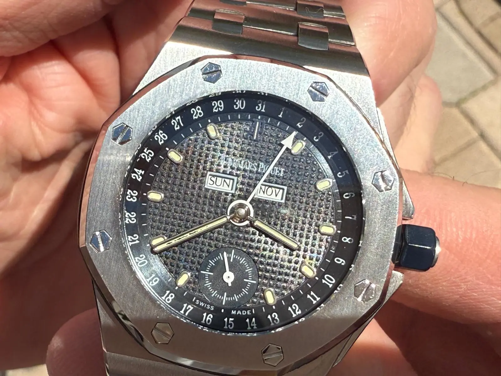 Other than the cracked lume, the watch apparently has no damage and works fine. I wanted to have it stabilized, so I contacted several watchmakers here in the US (LA Watchworks in CA, Zimmerman in PA and Gray & Sons in FL) and all of them refused to take care of this and told me to send it over to AP for a service. I would assume that their decision is based on the lack of availability of AP original parts for independent watchmakers and I understand their decision if this is the case. However, I am quite hesitant to send the watch to AP US, since they will most likely replace the handset and I want to keep the watch as original as possible. I am under the impression that any skilled watchmaker should be able to stabilize the luminous material on the hand but I haven’t been able to find one so far.