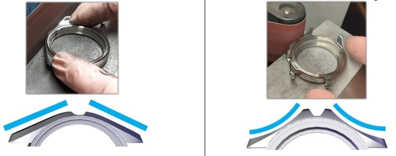 ·For watches with brushed side flanks I use a bench top polishing lathe with a 4 inch Bergeon 6723-240-LP wheel to get a nice brushed finish. However, the wheel is too large to finish case flanks if there are crown guards (like the Seamaster Professional 300m).