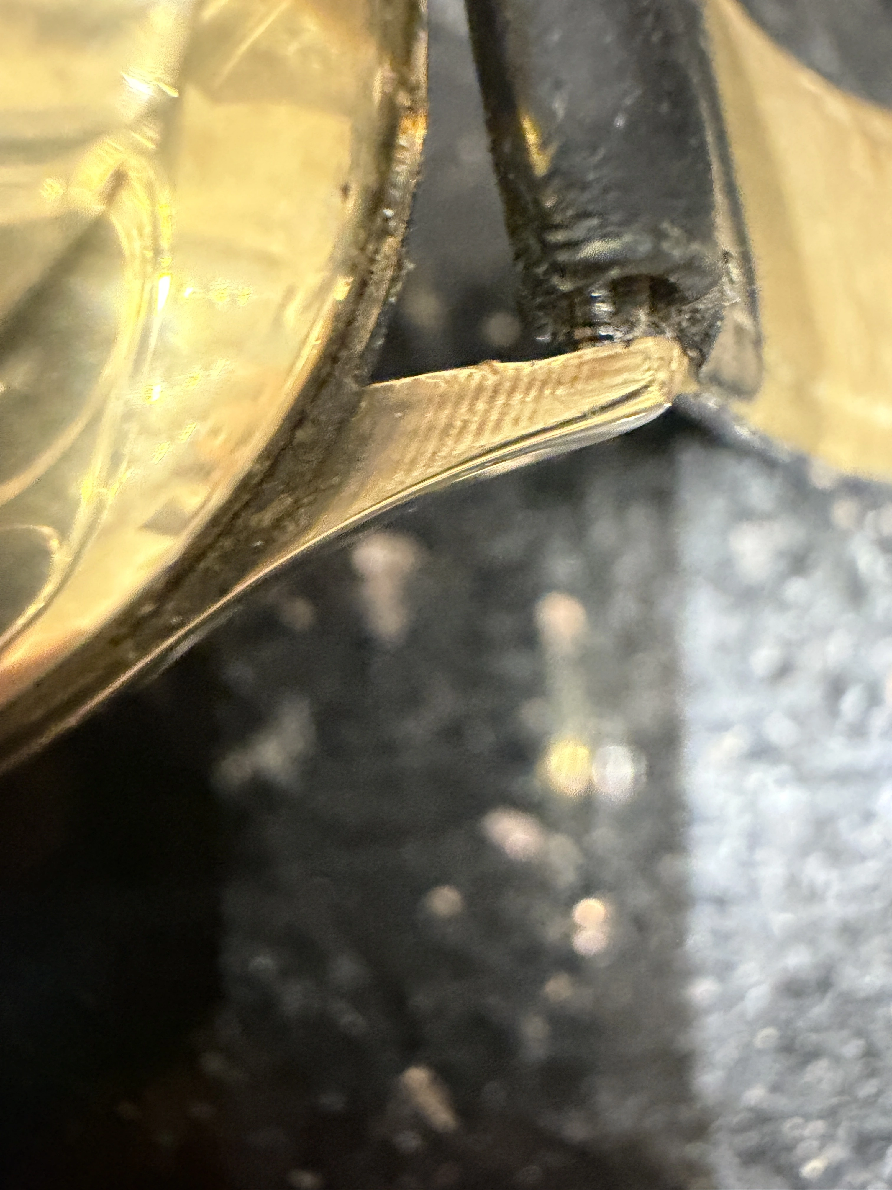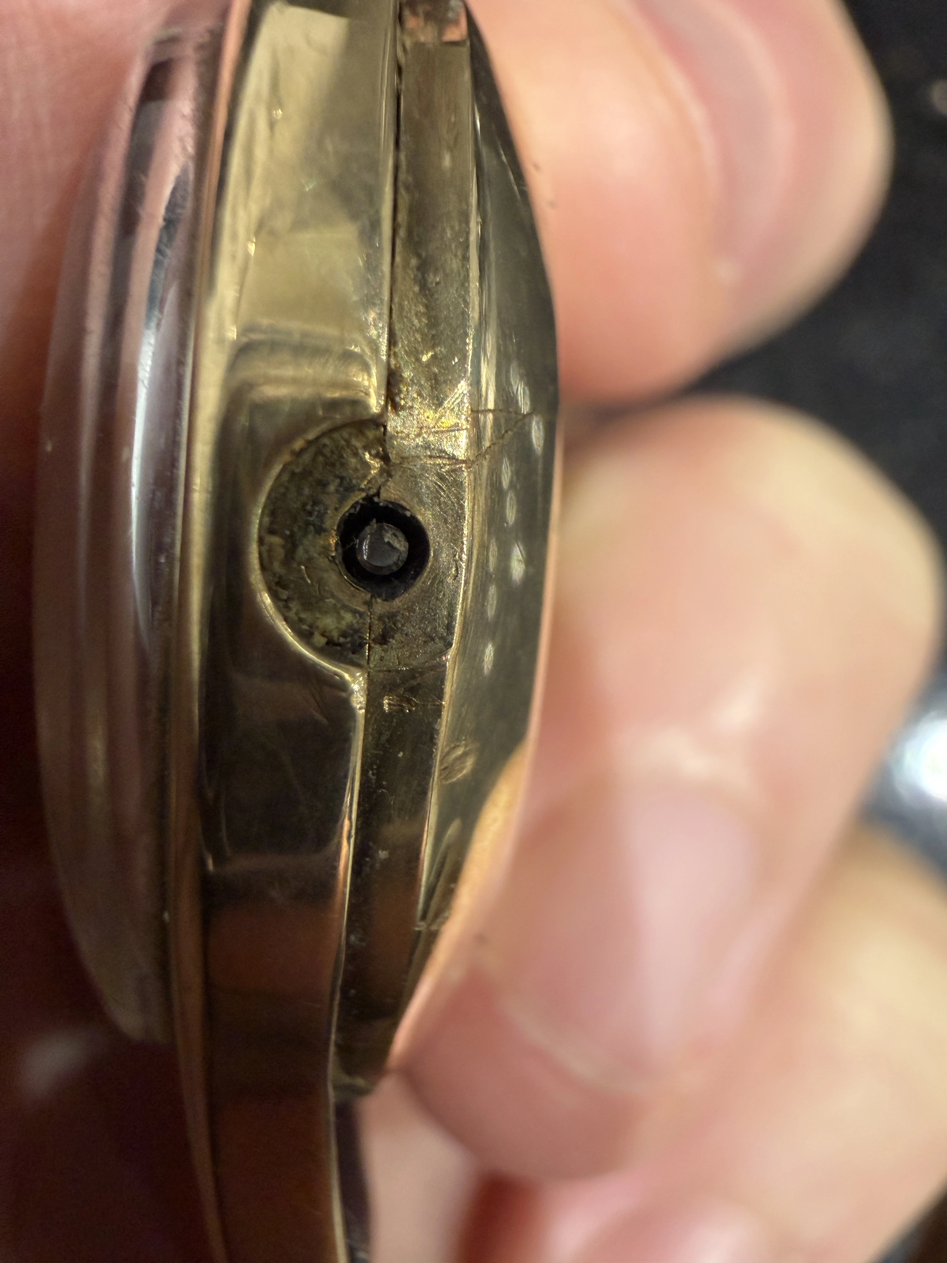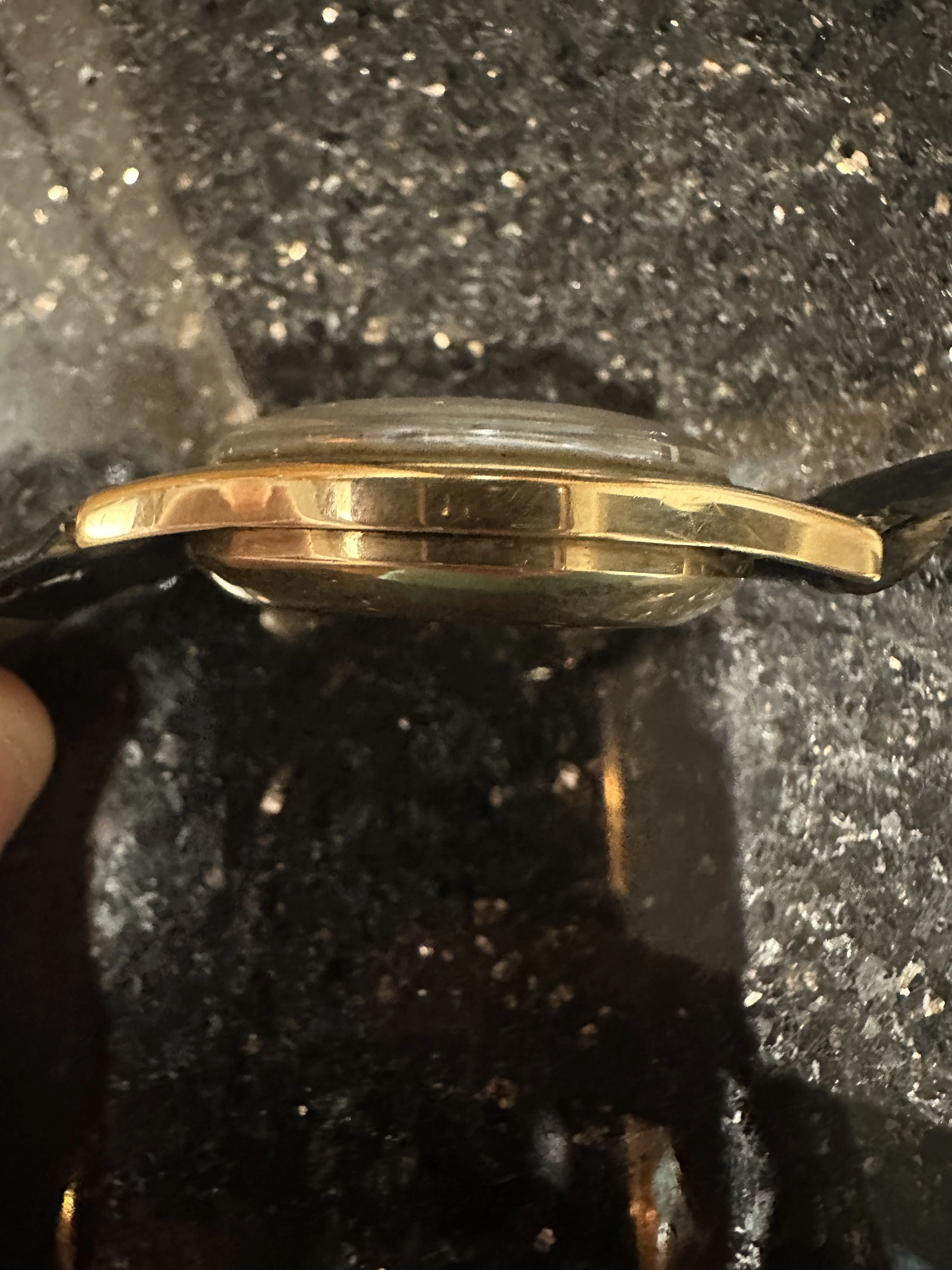 I think it’s either gold filled or plated. Hard to tell, but looks like wear on the upper left lug on the side. Also some green corrosion on the bezel up and left of the crown area.