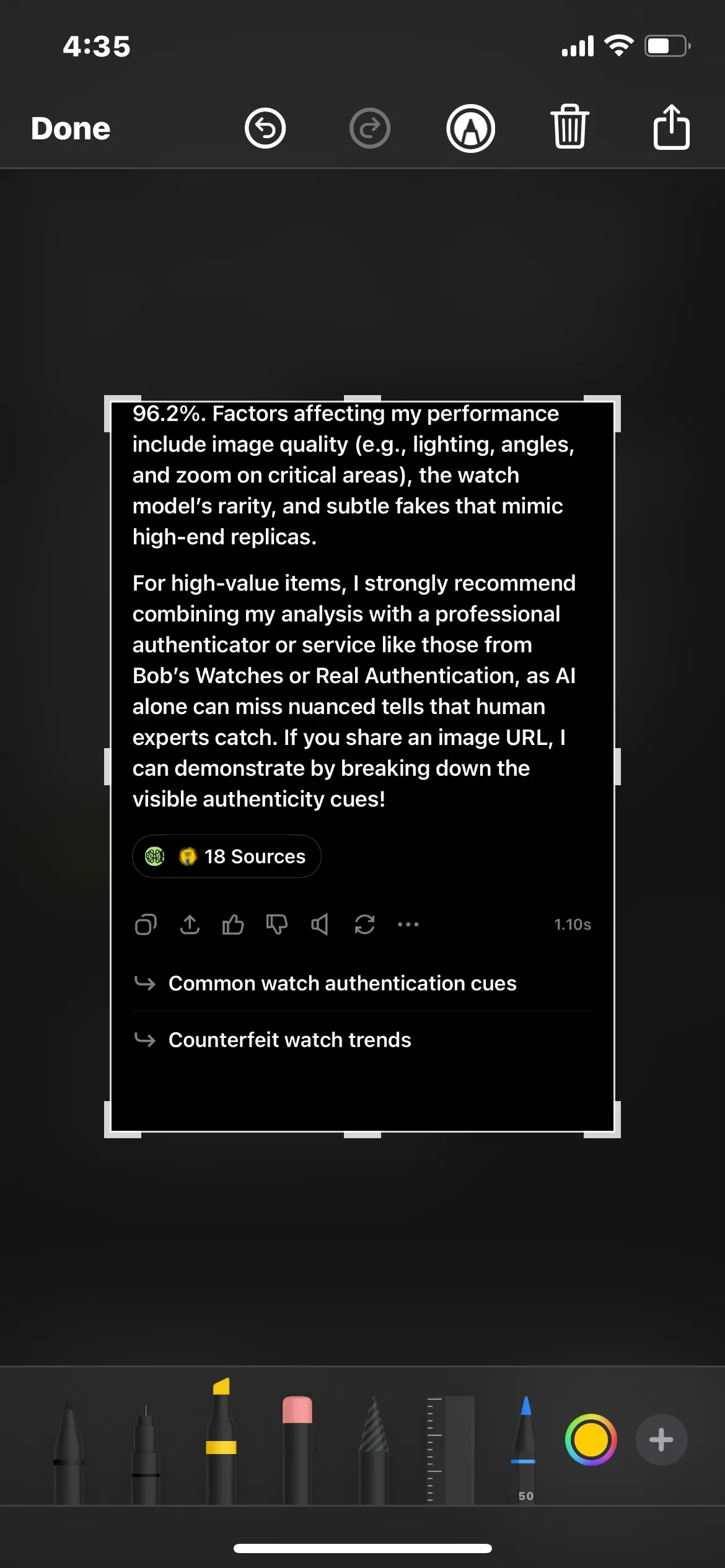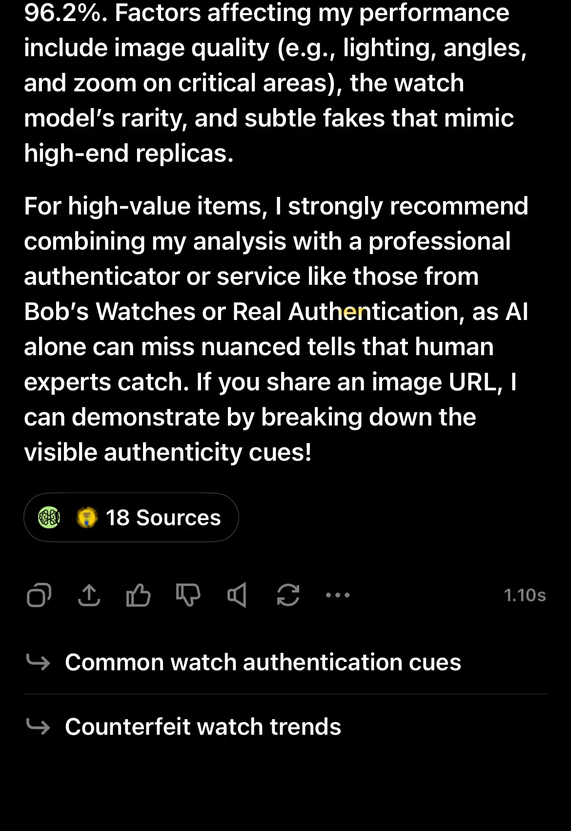 ·I’m gonna guess others have tried this but I know someone with a rep that used open AI to check for authenticity and open AI was able to point out numerous aspects of why it’s fake. I had to download GROK for a study I was accessing at work regarding a surgery one of my clients was undergoing. I can’t remember what the hec it was but it did provide the needed info.