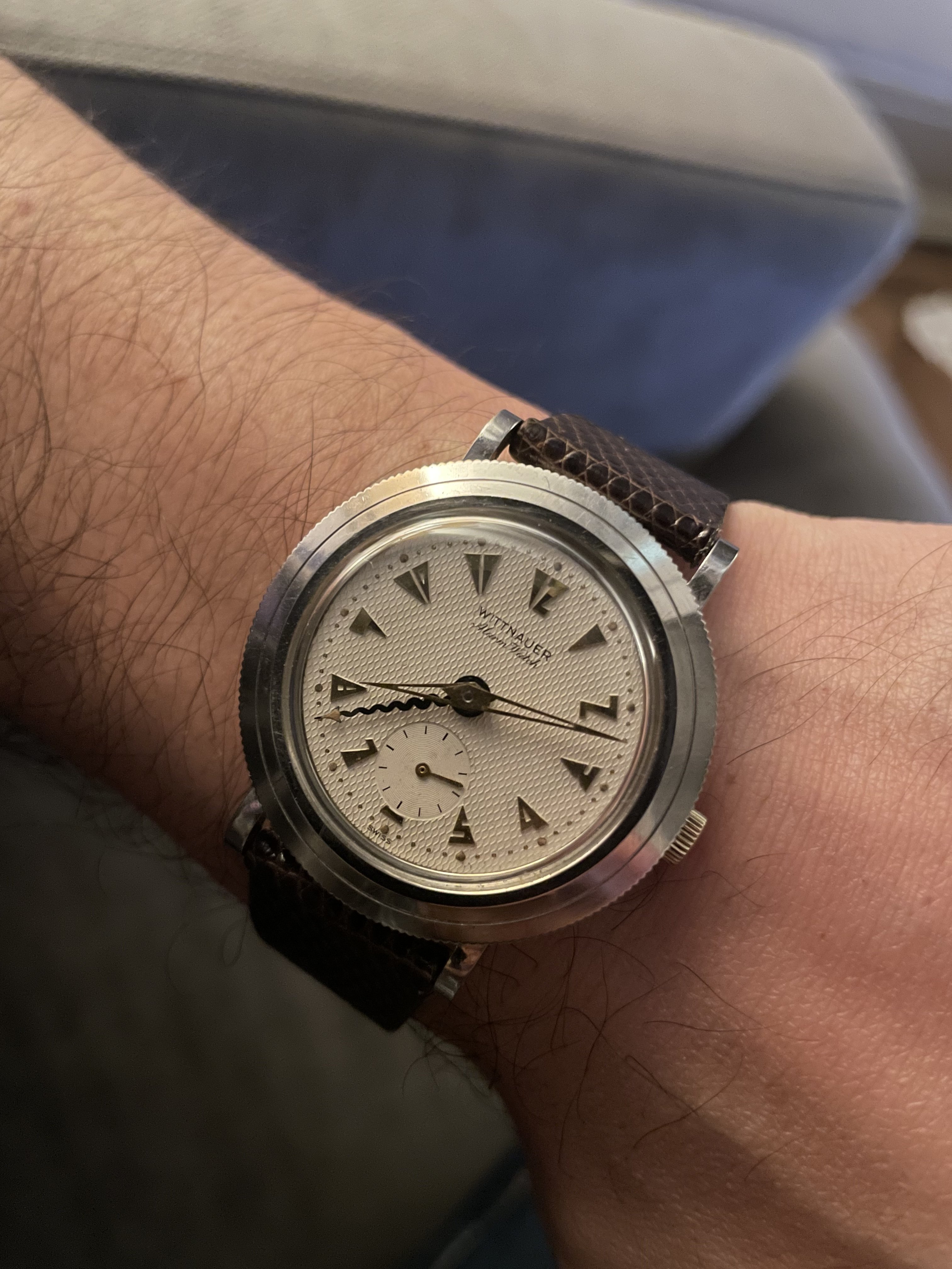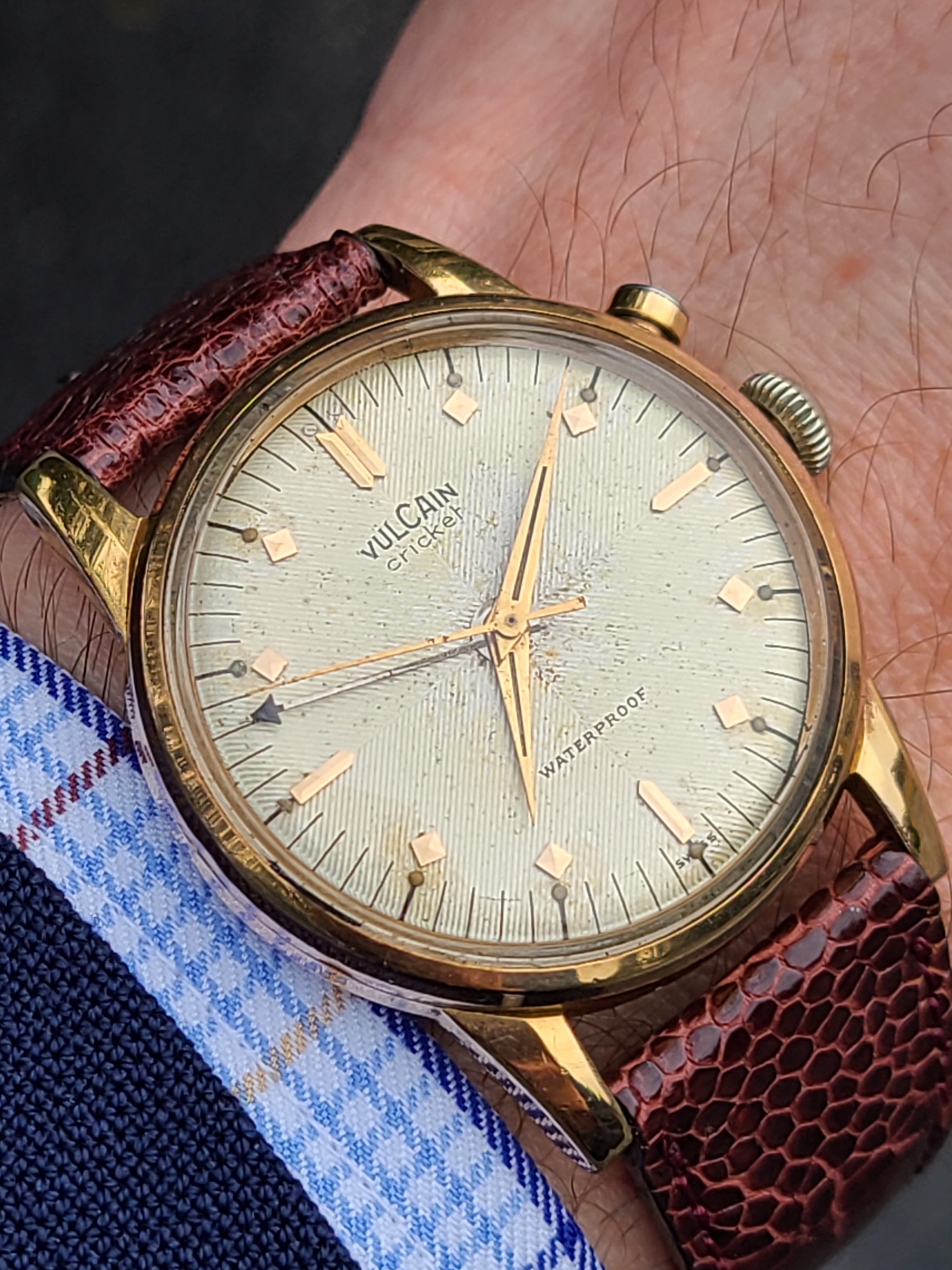 A Vulcain Cricket that was a beloved watch of my uncle, who, knowing my interest in watches, told me stories about the watch but presumed it lost. After my uncle passed, his son found it hidden away in an eyeglass case, long forgotten for over 40 years. My cousin then generously gave the watch to me, because he knew of his father's discussions with me about it.