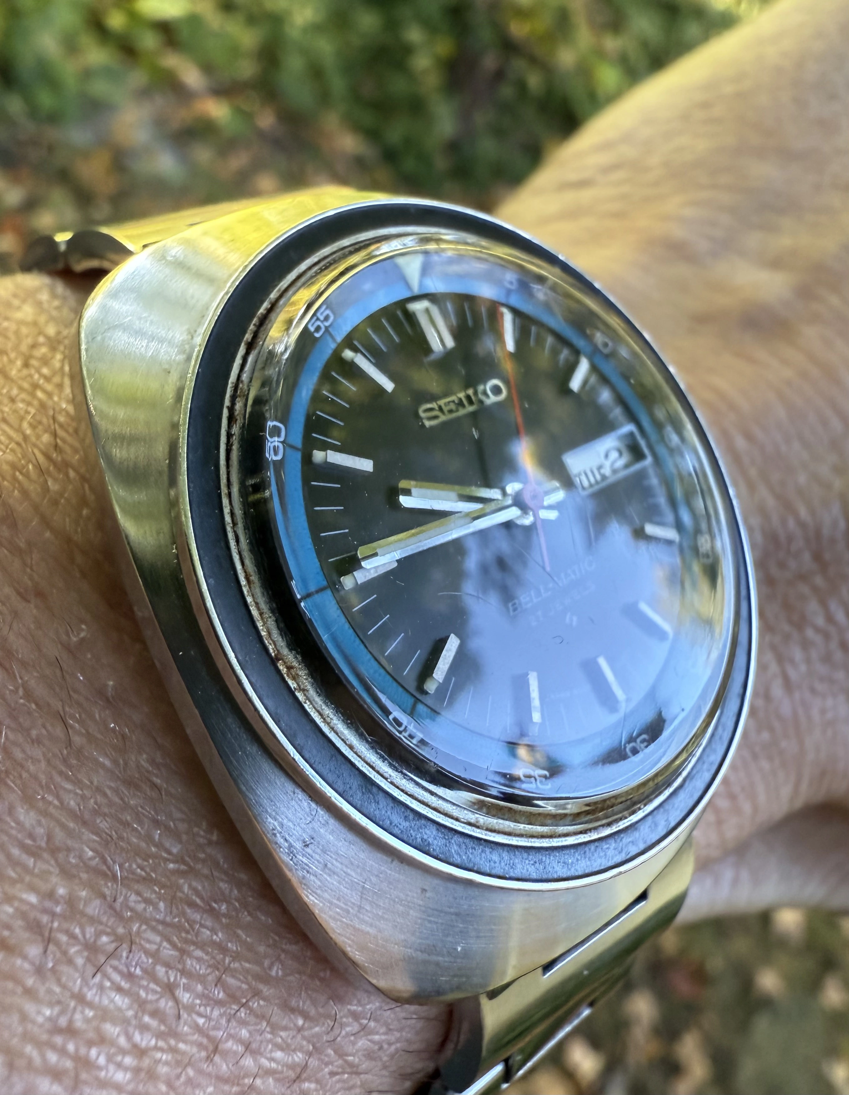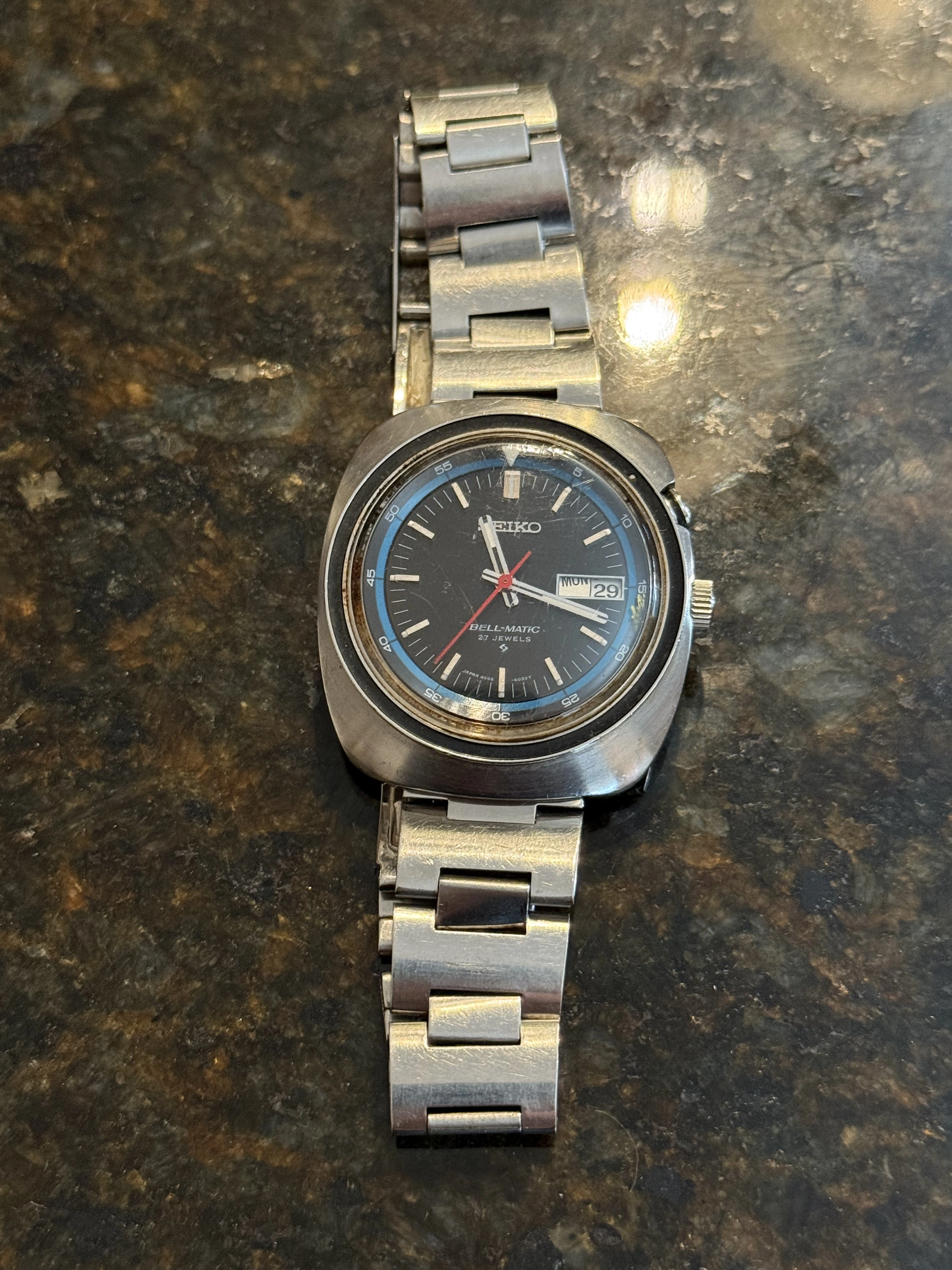 The watch: Seiko Bellmatic with a nice blue accent. Never really paid attention to these so I had no idea of the complications (an extra button?)