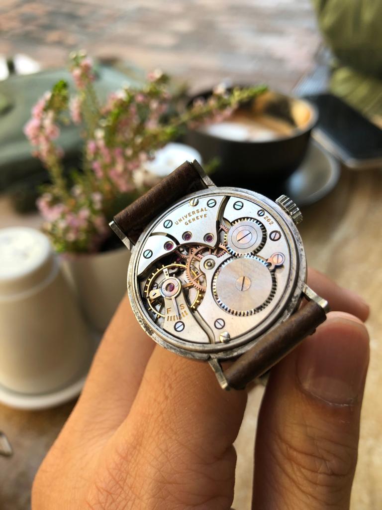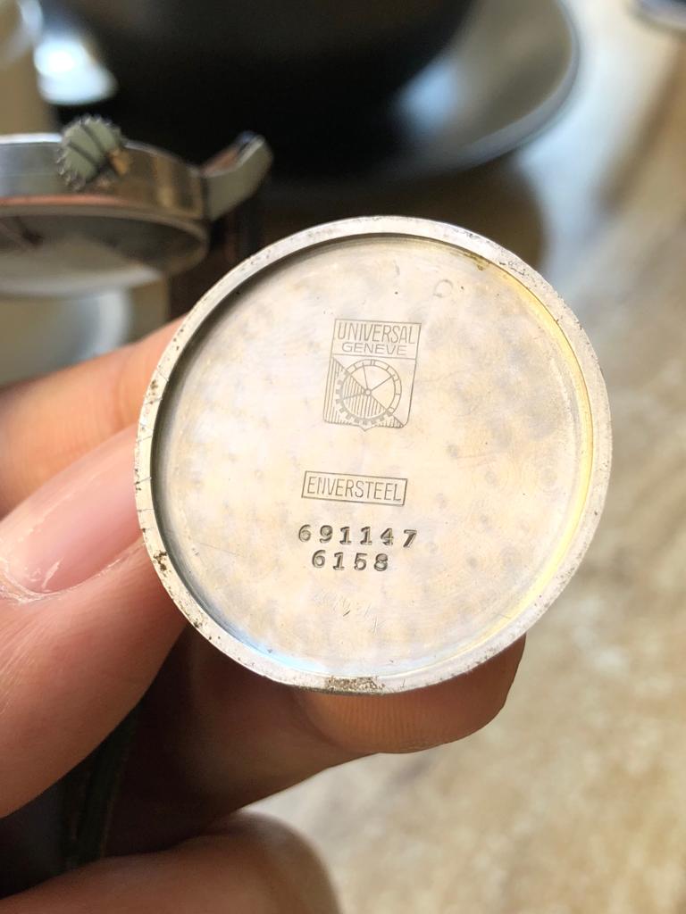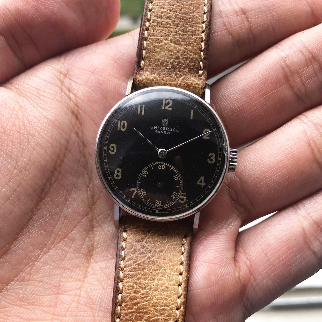 ·New watch always excites me. This time it is a Universal Geneve gilt dial with steel case. It has the old UG logo printed. My research tells me that this logo was used by UG sometime in 1937, which allows me to date this watch to somewhere in the 1930s. I have no expertise to open the case back, so there isn't any shot of the movement.