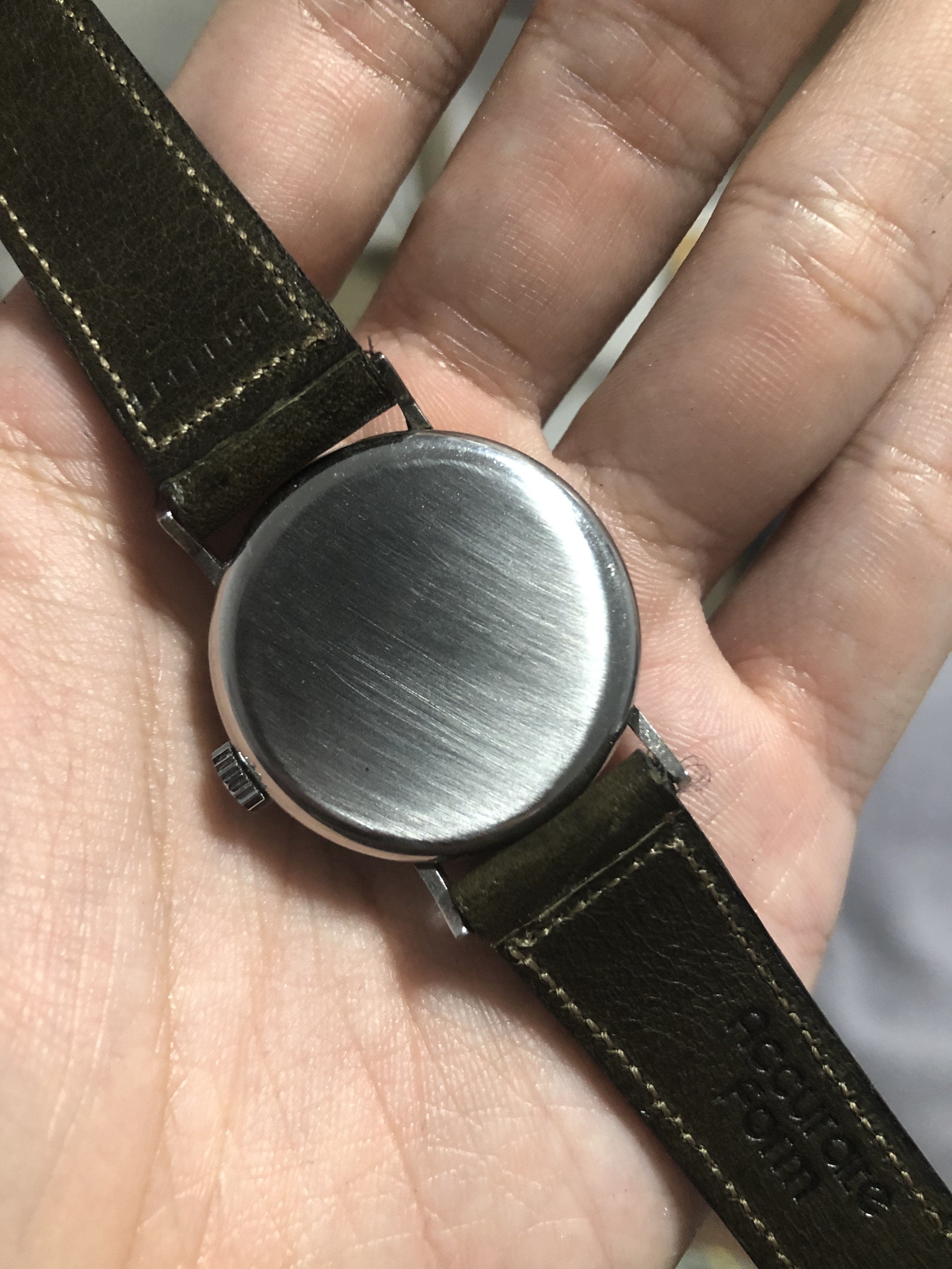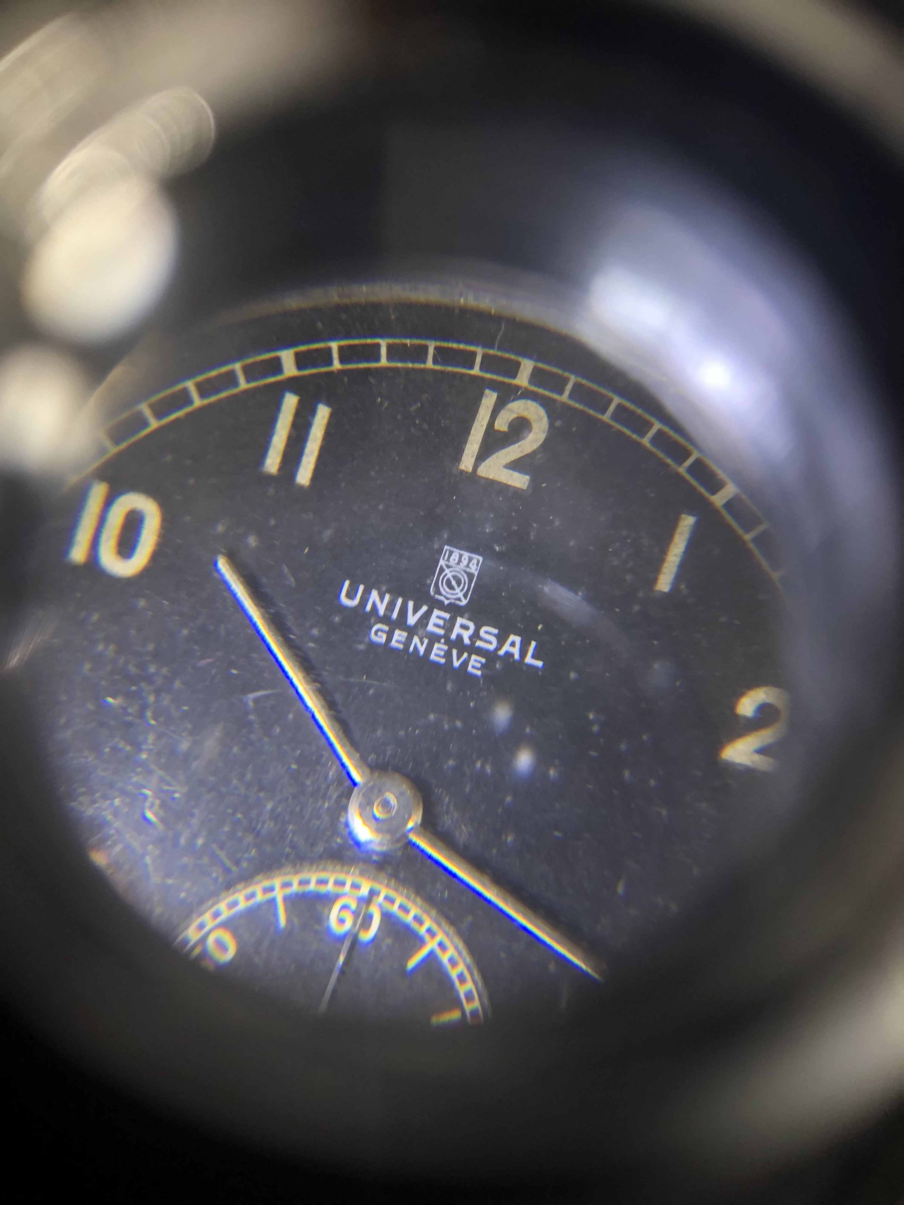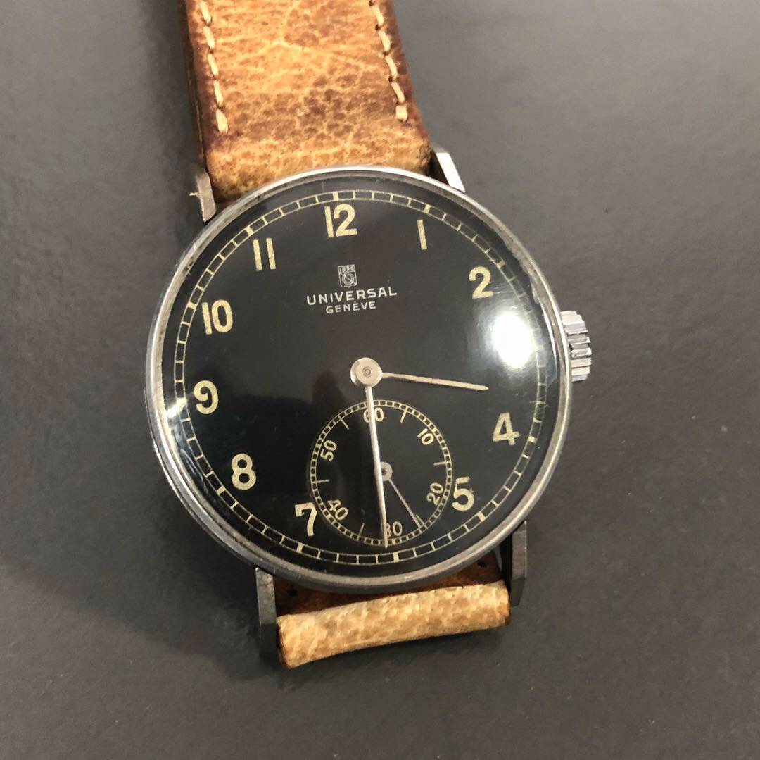 ·New watch always excites me. This time it is a Universal Geneve gilt dial with steel case. It has the old UG logo printed. My research tells me that this logo was used by UG sometime in 1937, which allows me to date this watch to somewhere in the 1930s. I have no expertise to open the case back, so there isn't any shot of the movement.