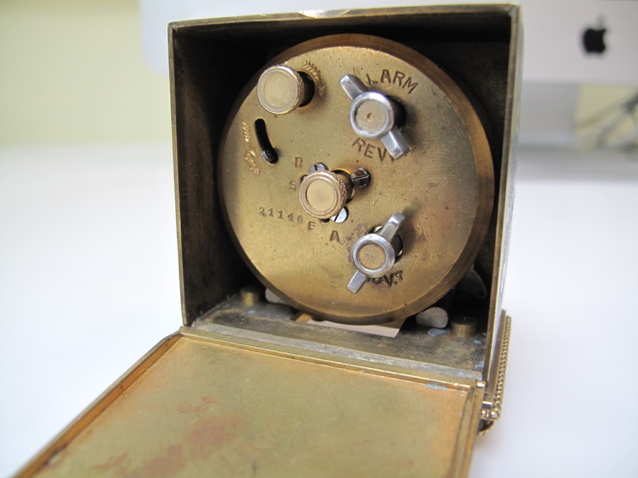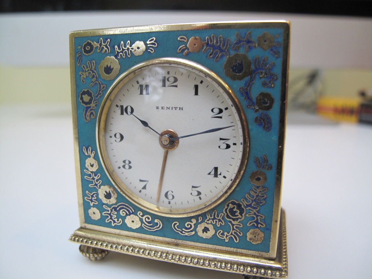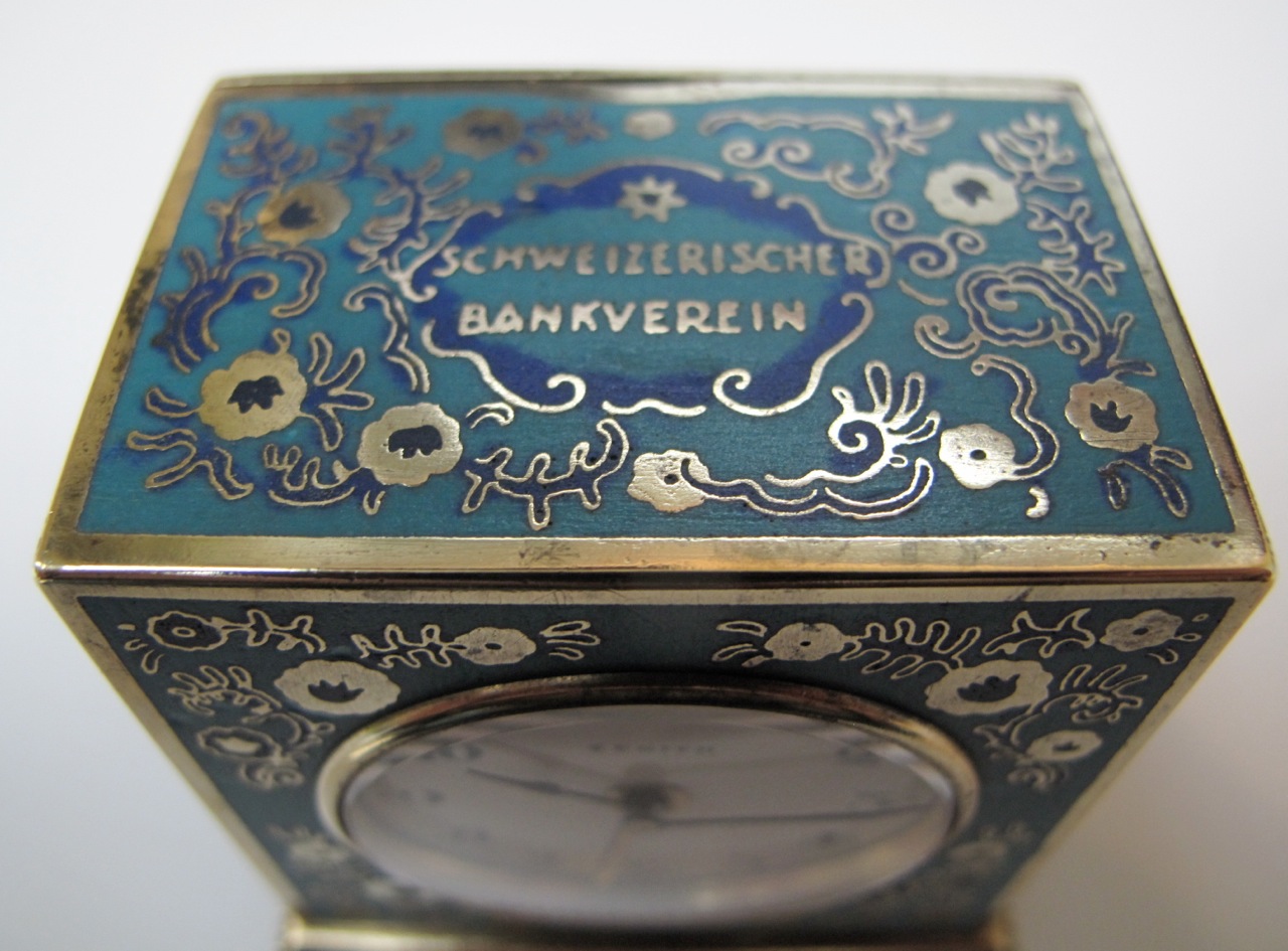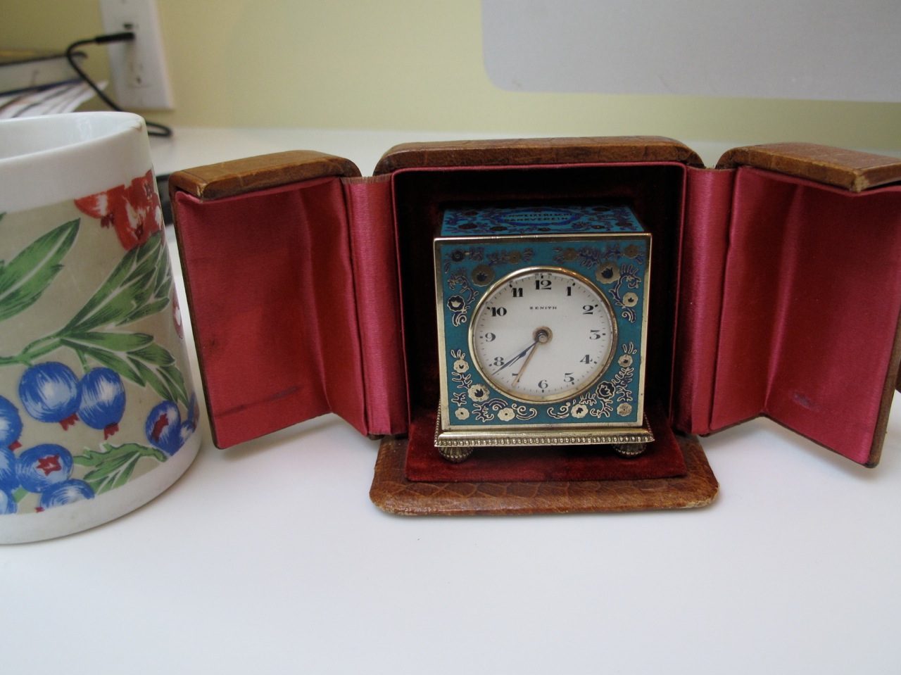 ·A recent acquisition is this charming little travel alarm clock from 1922. Few now can stand the bedside ticking of an alarm clock, as cell phones are much quieter and can be programmed to wake one up more gently. But this is a lovely piece with its original leather traveling case (a coffee mug gives a sense of scale). In bronze with Champleve decoration, it is inscribed 'The Swiss Bank Corporation to its employees to commemorate its fiftieth anniversary, 1872 - 1922', thus ensuring that they would continue to get to work in a timely fashion. Roessler illustrates another example on p. 281. Any other Zenith clocks out there?
