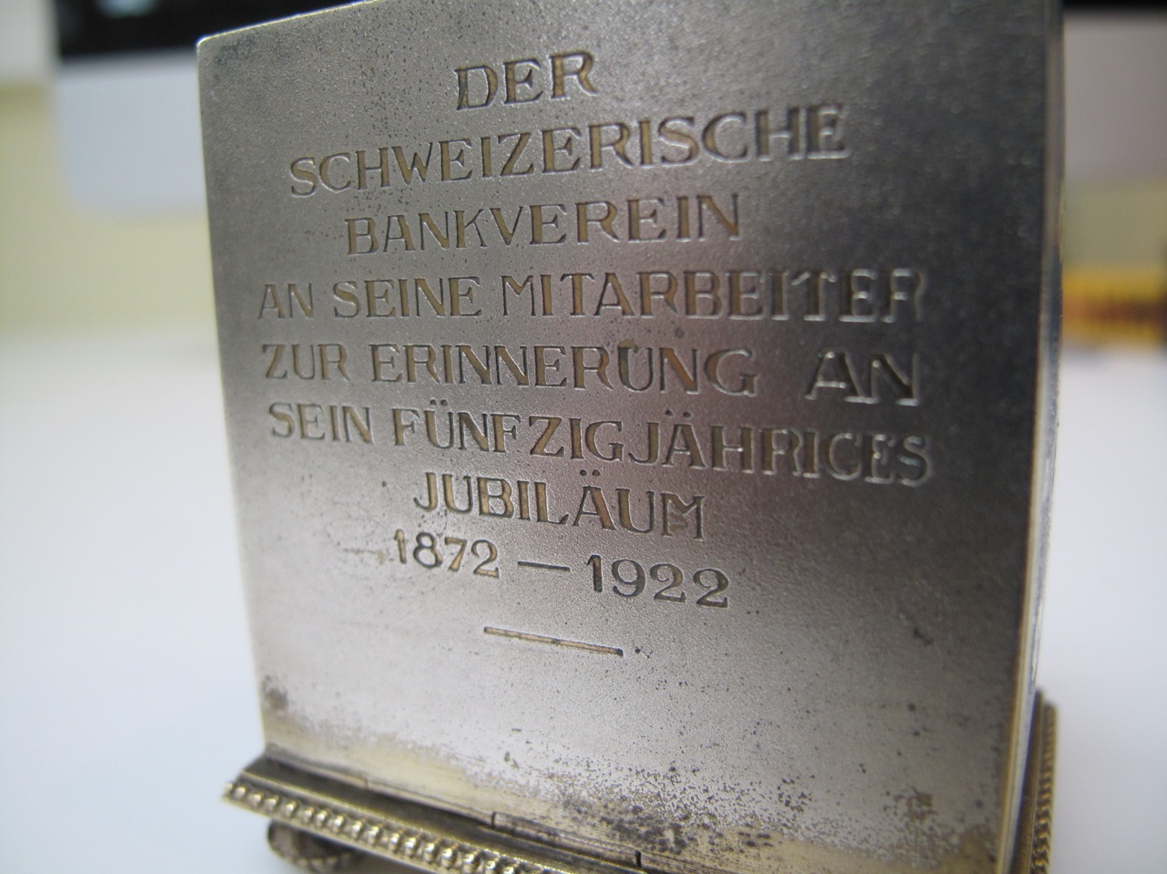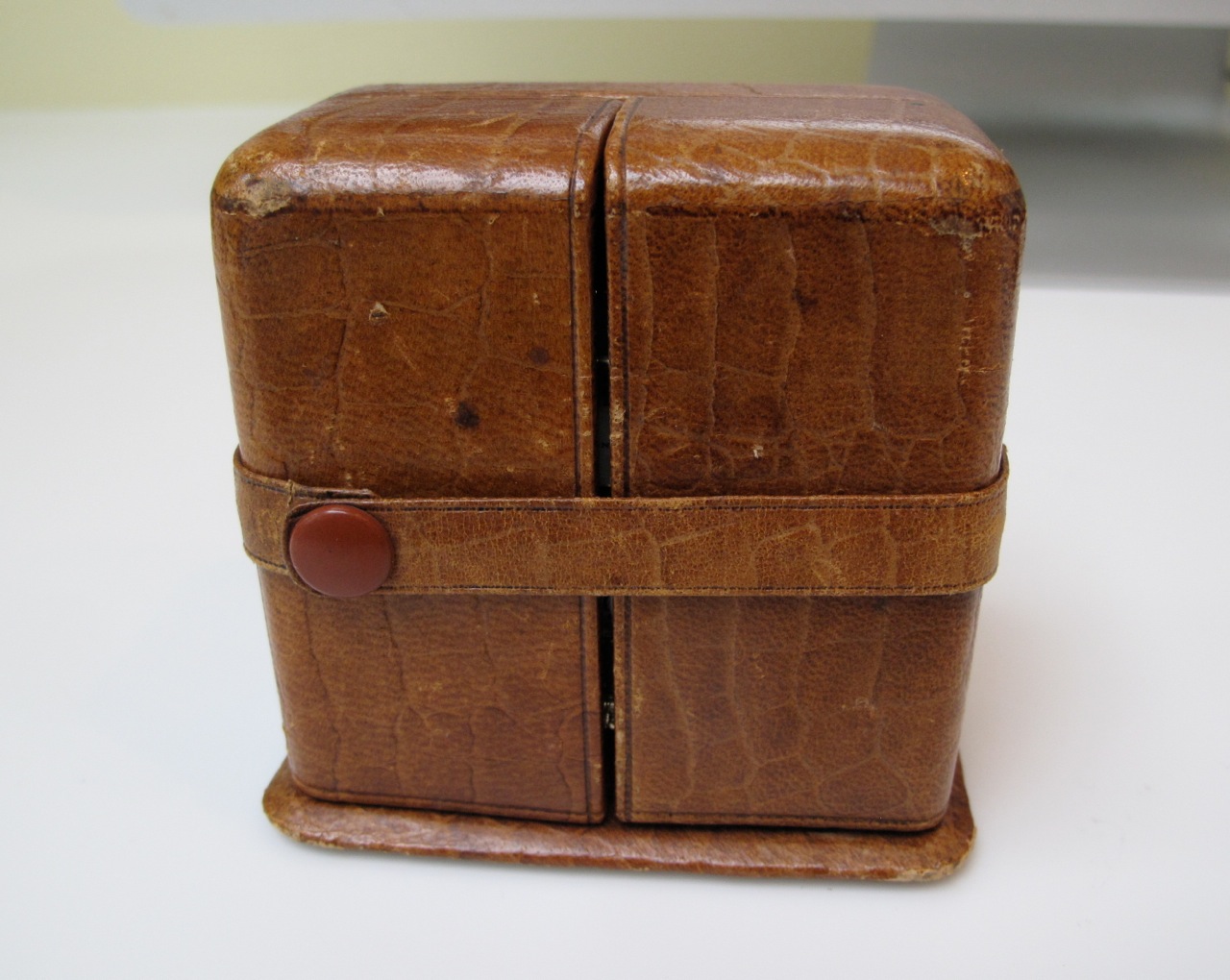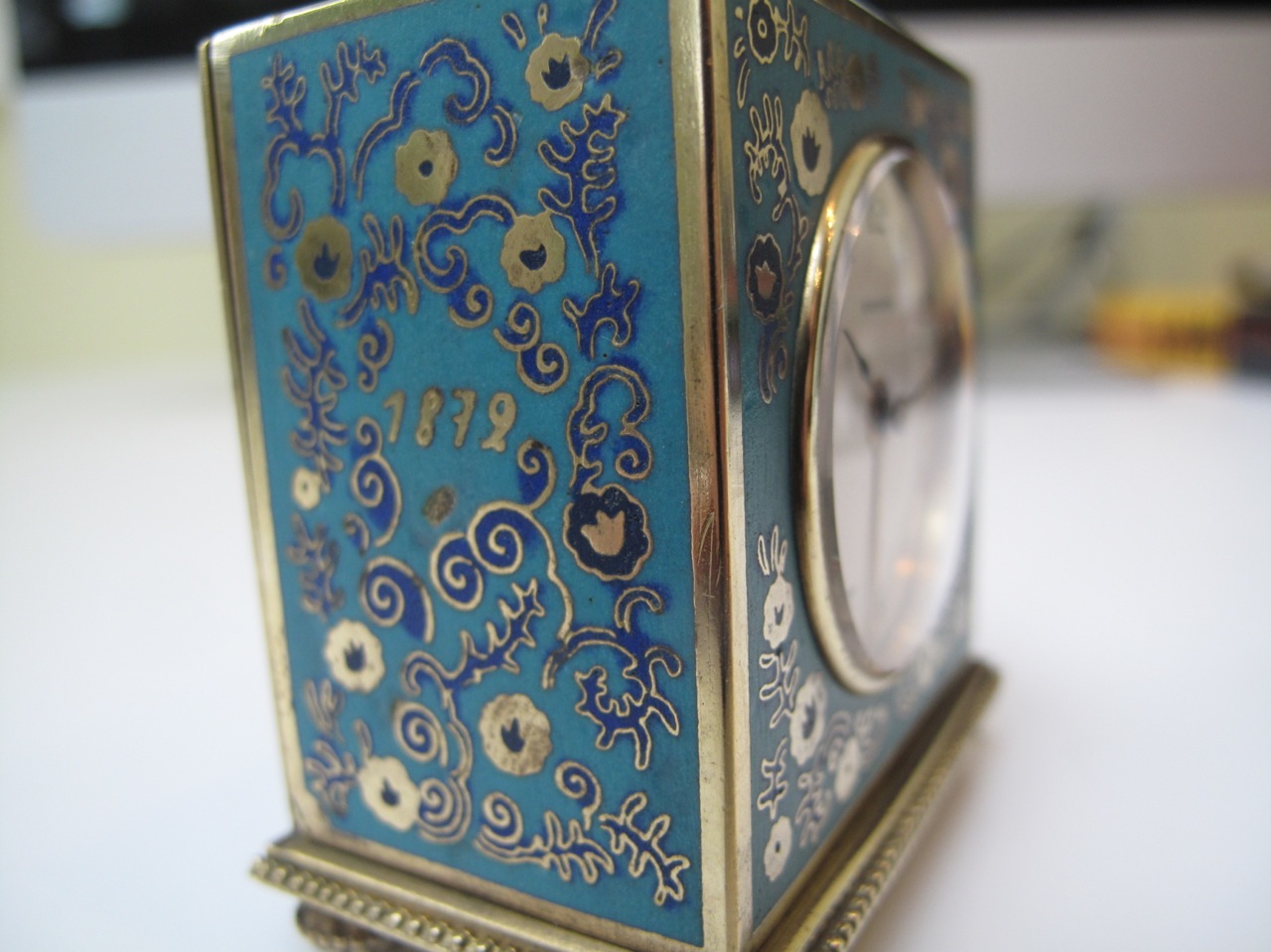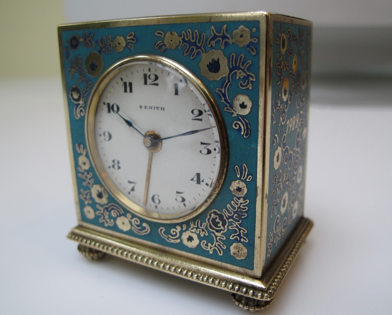 ·A recent acquisition is this charming little travel alarm clock from 1922. Few now can stand the bedside ticking of an alarm clock, as cell phones are much quieter and can be programmed to wake one up more gently. But this is a lovely piece with its original leather traveling case (a coffee mug gives a sense of scale). In bronze with Champleve decoration, it is inscribed 'The Swiss Bank Corporation to its employees to commemorate its fiftieth anniversary, 1872 - 1922', thus ensuring that they would continue to get to work in a timely fashion. Roessler illustrates another example on p. 281. Any other Zenith clocks out there?
