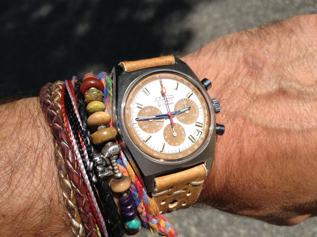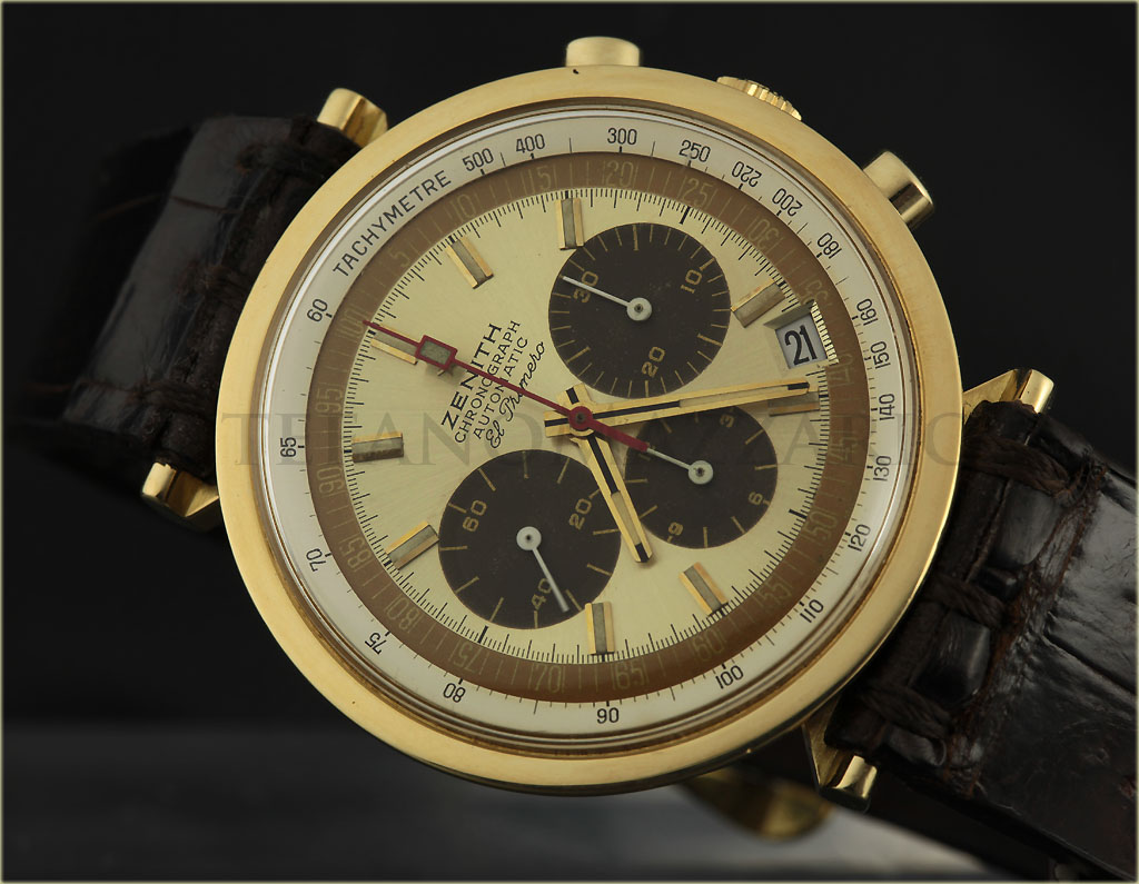 You forgot about the WoC dials - white on cappuccino. I've never seen a silver on fume. The two cappuccino dials I've owned, one with white subdials, the other with silver, are both clearly original in the sense of being 1969-1970ish, not service dials. Nor are they faded fumes. The tropical effect is quite different. Without confirming data from Zenith, I wonder whether trying to match runs is productive given how often dials are switched in and out of cases (I plead guilty). Sometimes you just gotta trust your eyes is what I feel. I think I can tell faded fume from unfaded cappuccino. If fading were the explanation, the ones I've seen would not be so uniform. In fact they are identical. And the only way white would change to silver would be by removing white paint to reveal a metal base, but that would eliminate the numerals, and would show up all over the place. Logic says - three different versions, all original. Plenty of other examples, particularly with the different combos found on the Fernsehers, and the De Lucas.