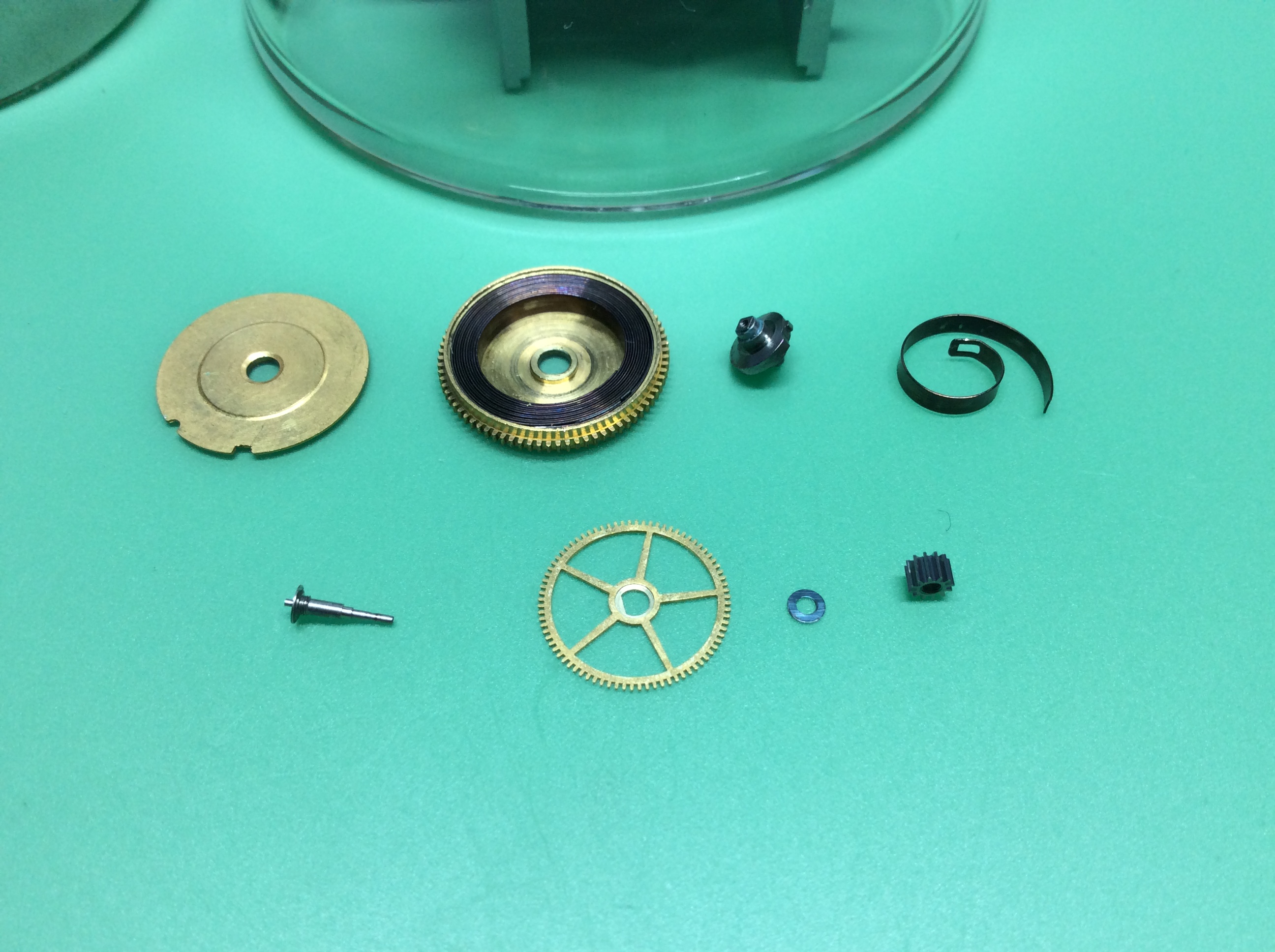To prevent this, (referring to the lower row of items from left to right in the photo below) the centre wheel shaft is keyed to the centre wheel and has a pinion that's screwed on to it (protected by a washer) with a left hand thread. (Correction, this one has a RH thread)