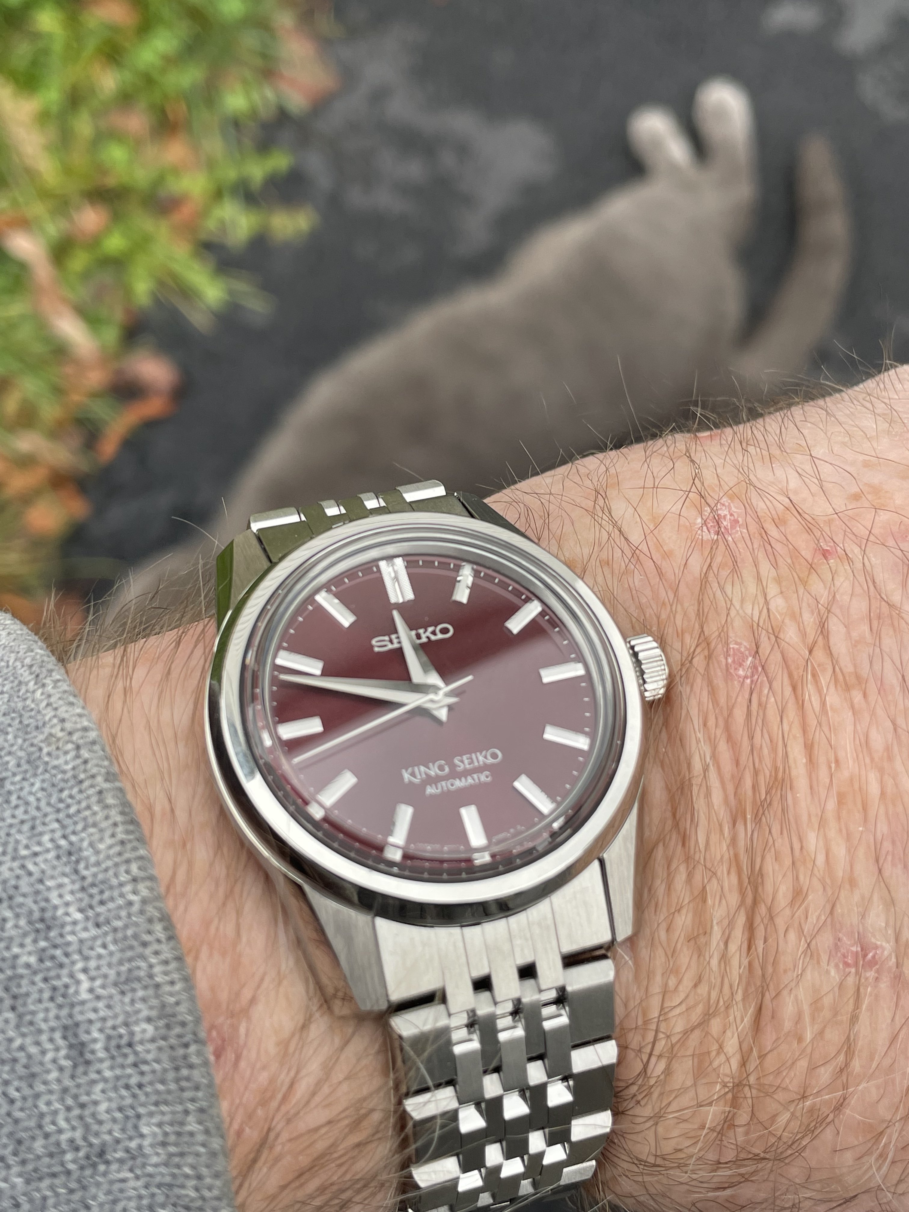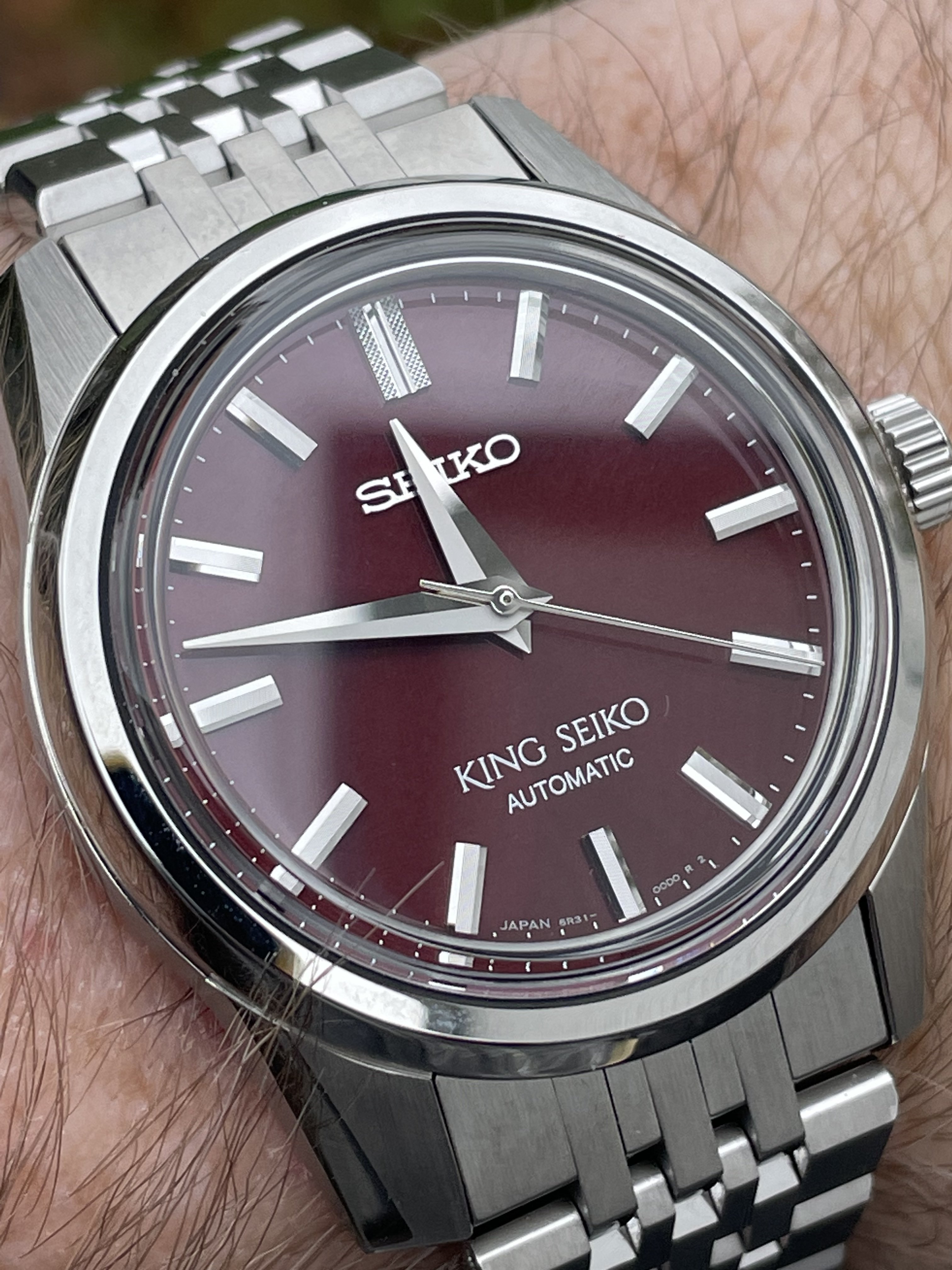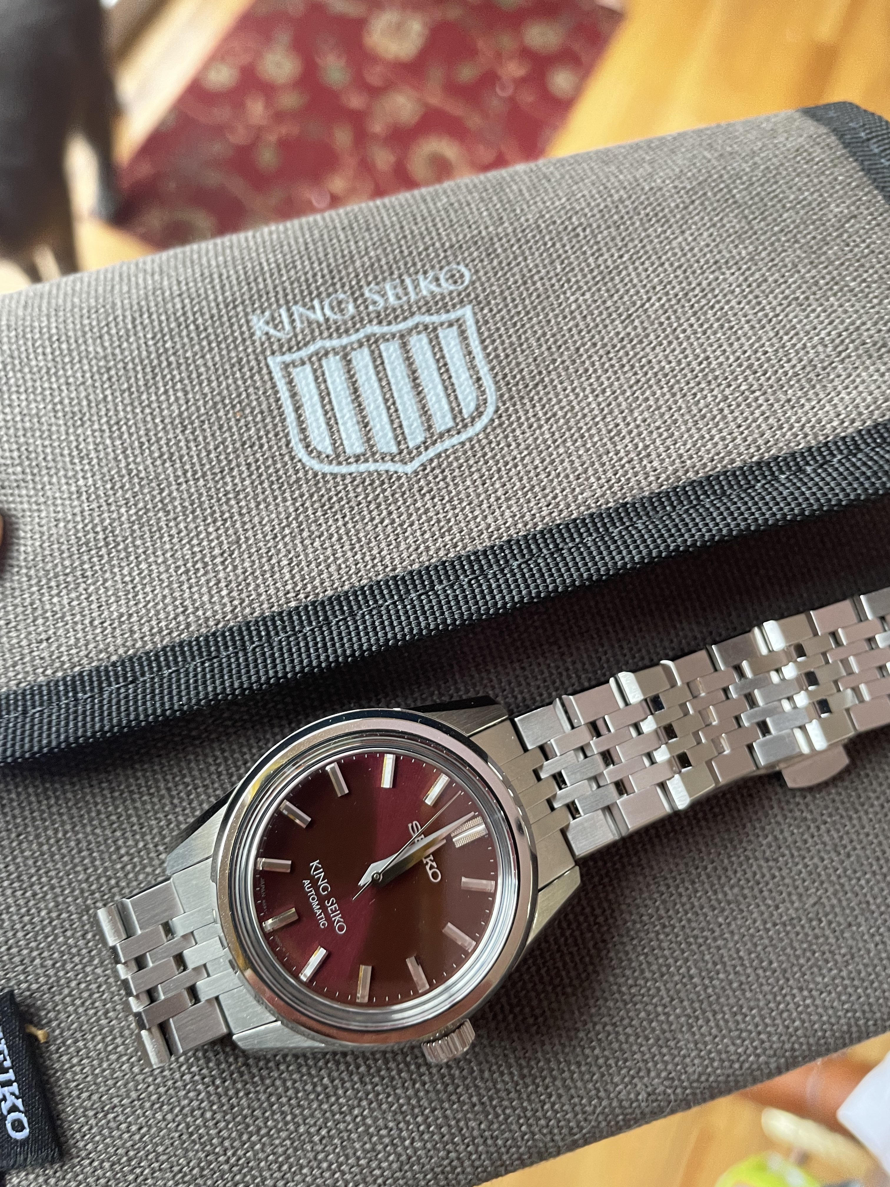 I looked up the seller he was legit so I said wtf and ordered the burgundy dial. First off I didn’t realize the bracelet was collar and pins so it was a battle sizing it. I swore quite a bit. I noticed the burgundy dial looks cool in the sun but no sun today.