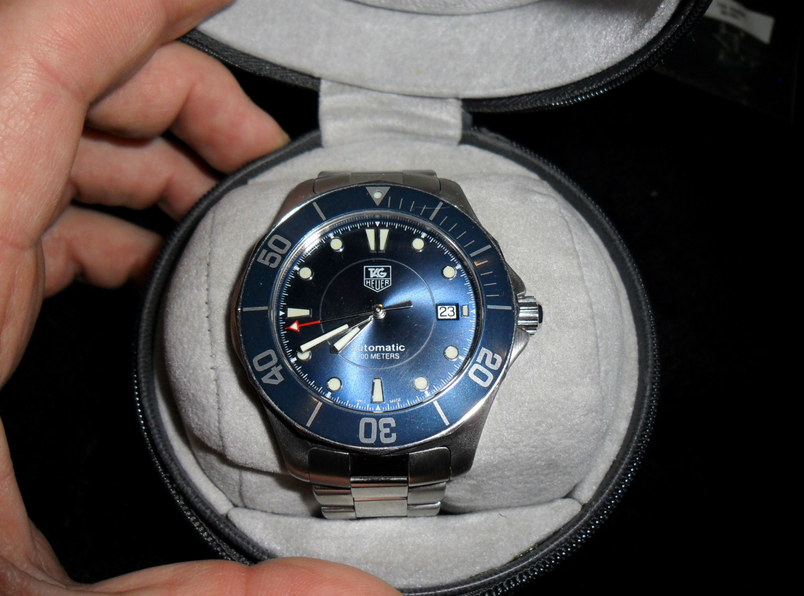 My brother asked me to get another blue TAG, and since its being replaced anyway to make it an upgrade... so I went and bought this, a TAG Heuer WAB2011 Aquaracer automatic (ETA movement). What we're going to do this time around is put it on a nylon NATO strap so he can't fiddle with the clasp or lose it swimming, and give him the bracelet when he's older.