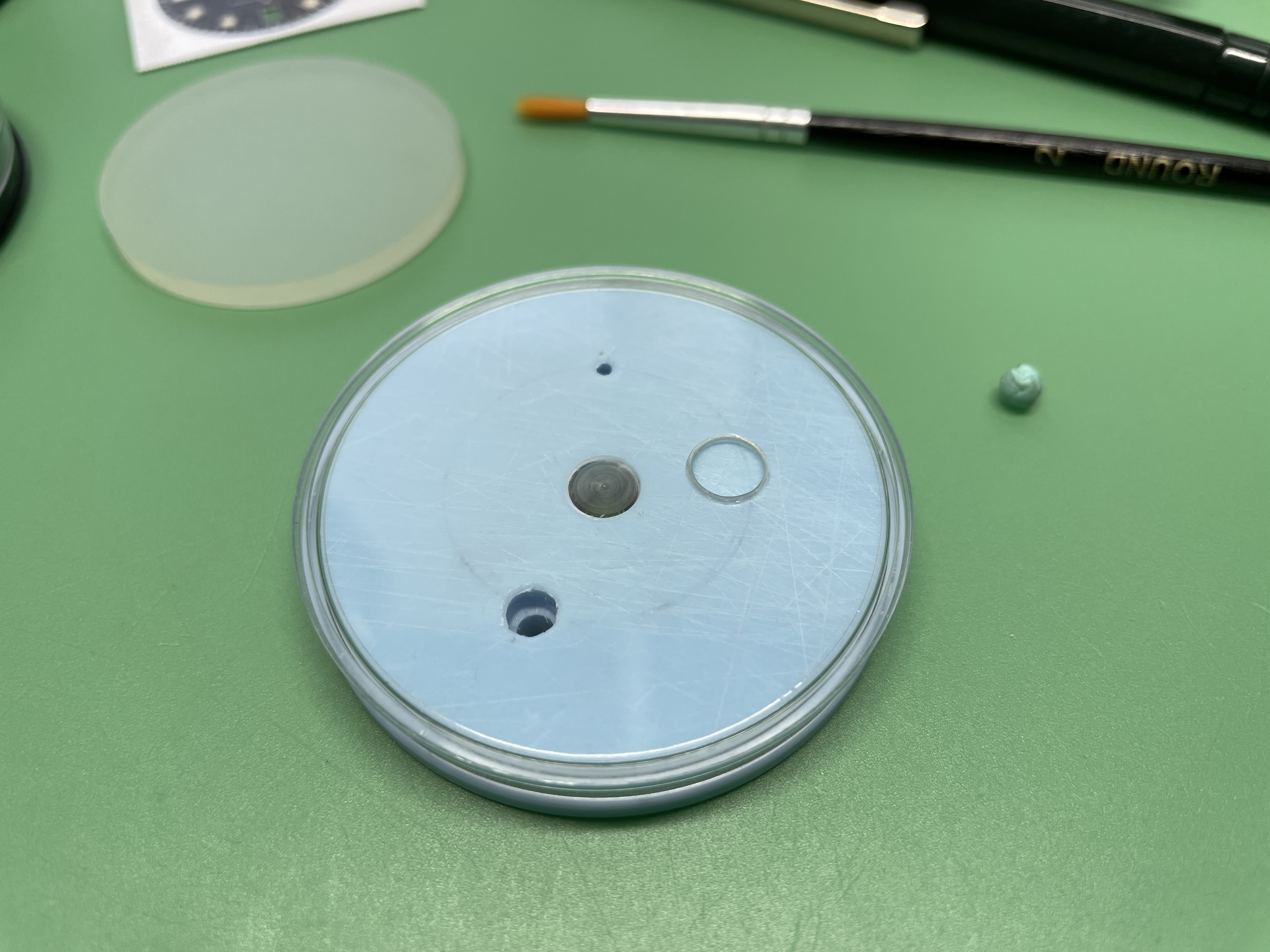 First thing I did was make a dial holder from an old poly chopping board donated by Ms JiO. Then I tried making a dial mask to protect the dial while removing the lume.
