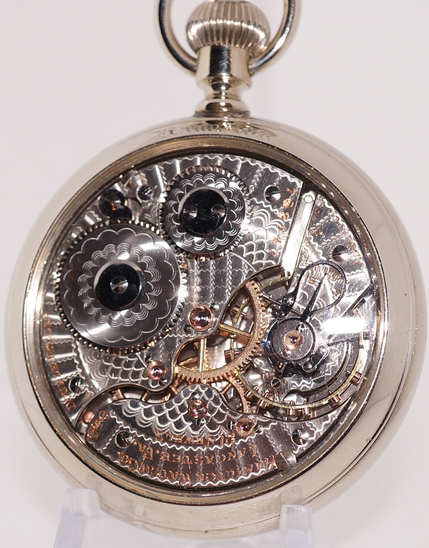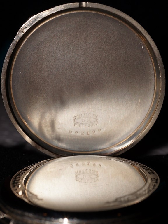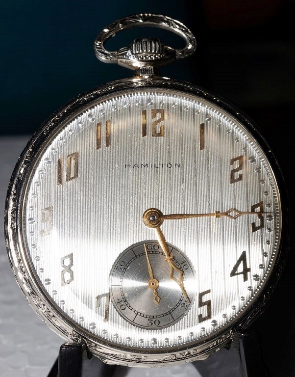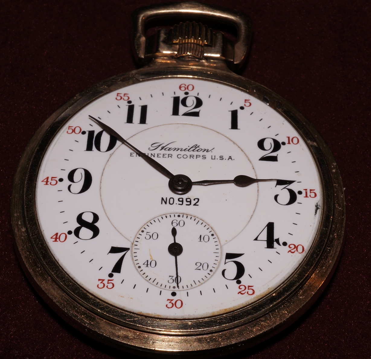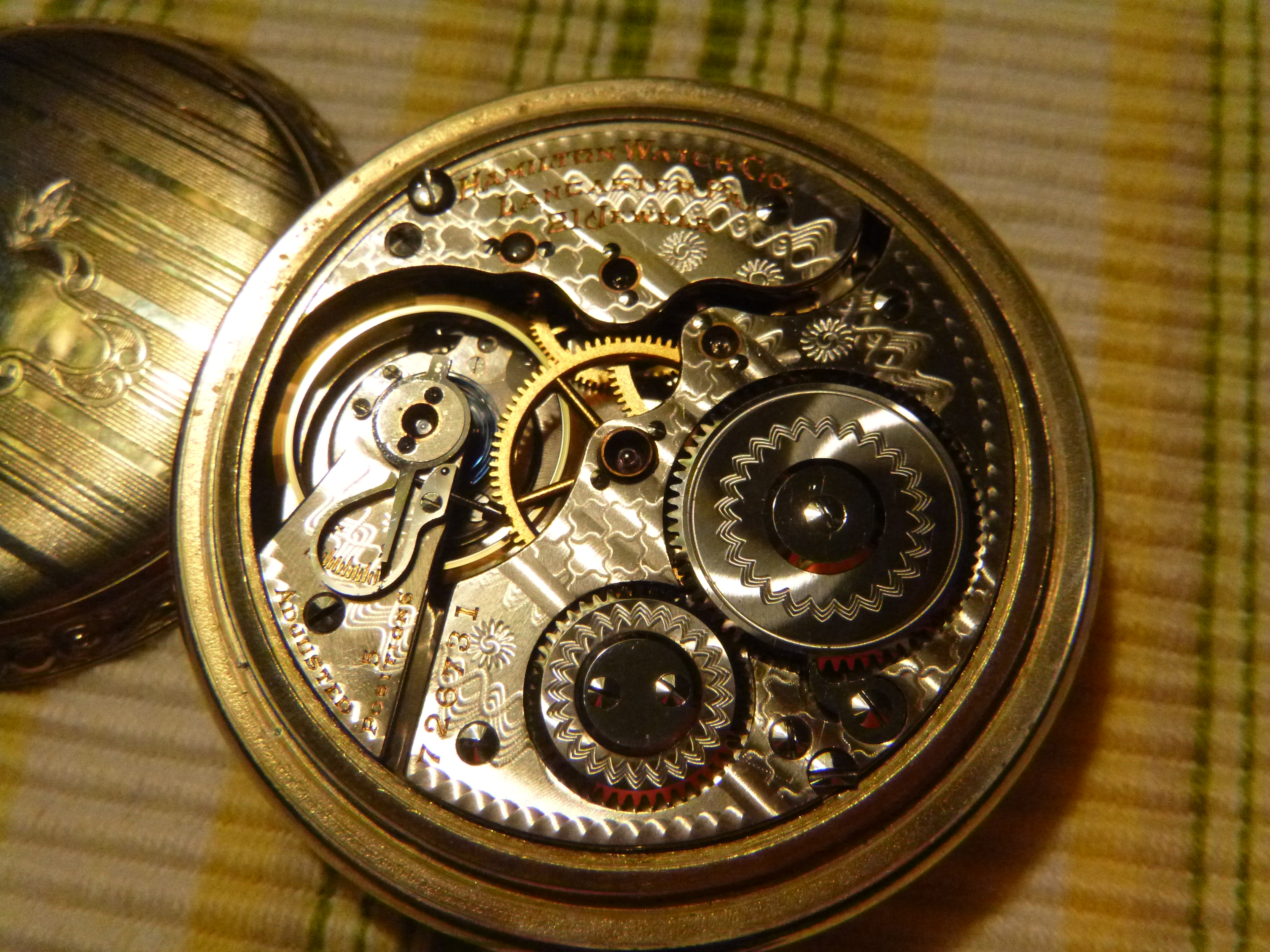 I have many Hamilton favourites. But this one is near the top. It is a grade 952, 16-size, 19-jewel version of the iconic 950, 950 E, and 950 B. The 952 came factory cased in the case shown, with hinged covers. The 952 over the 30 years I have owned this one, has surfaced as quite collectable. Compared to many Hamilton 16-size pocket watch production, the 952 is fairly scarce in good condition. There were three versions of the 952 made over the years. This is the earliest model as indicated by the one-piece barrel bridge, and two screws holding the crown wheel core.
