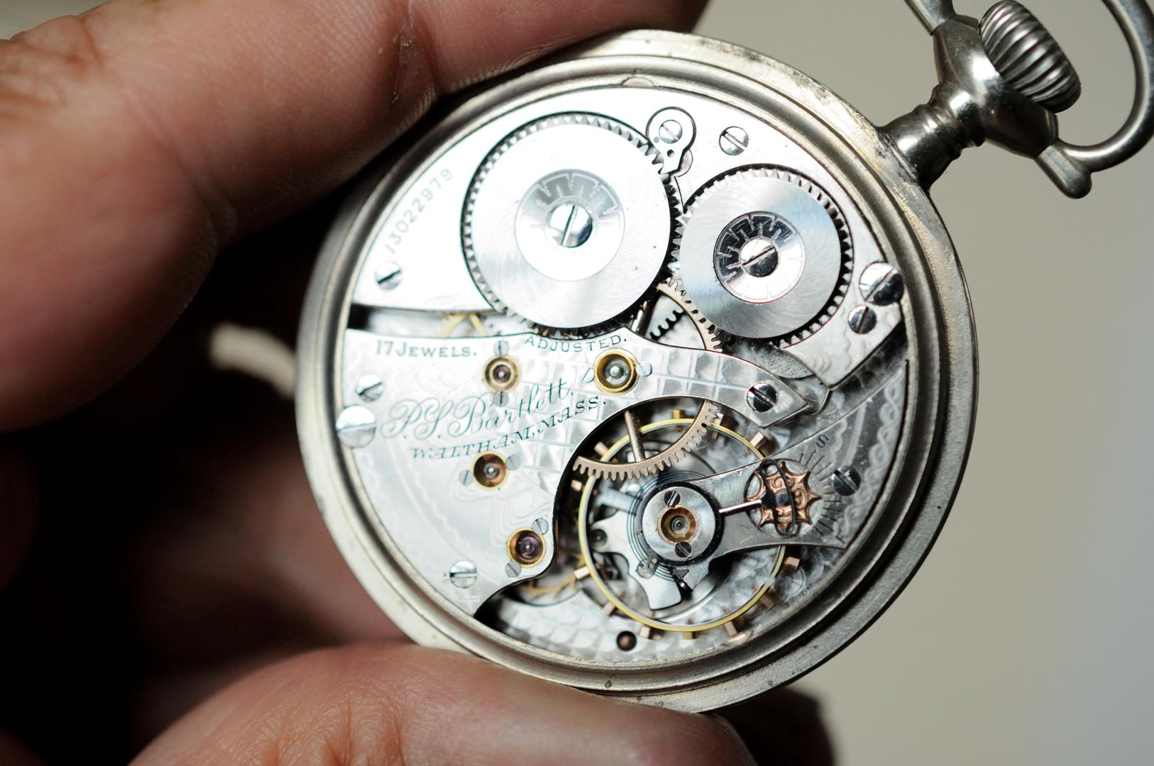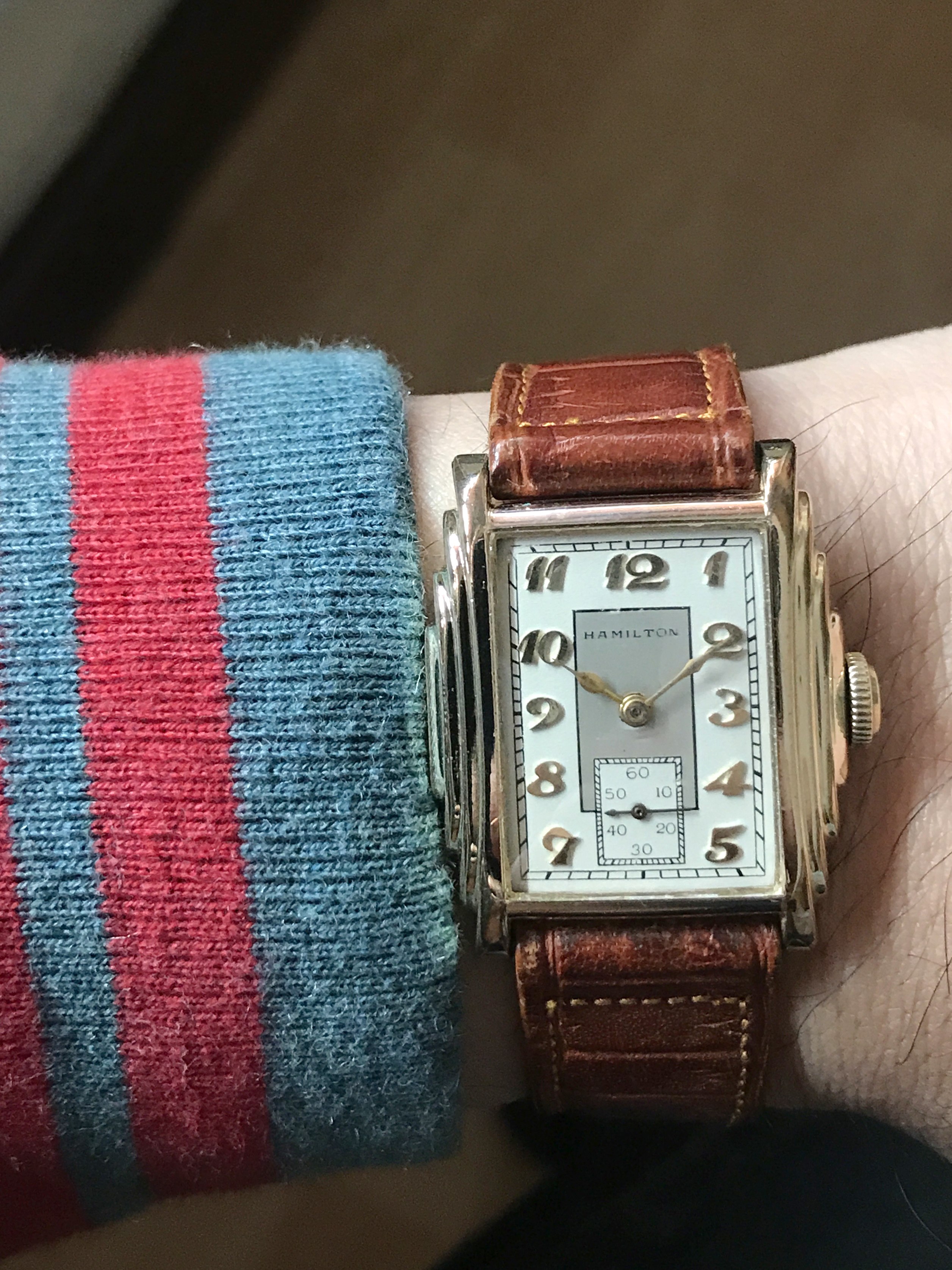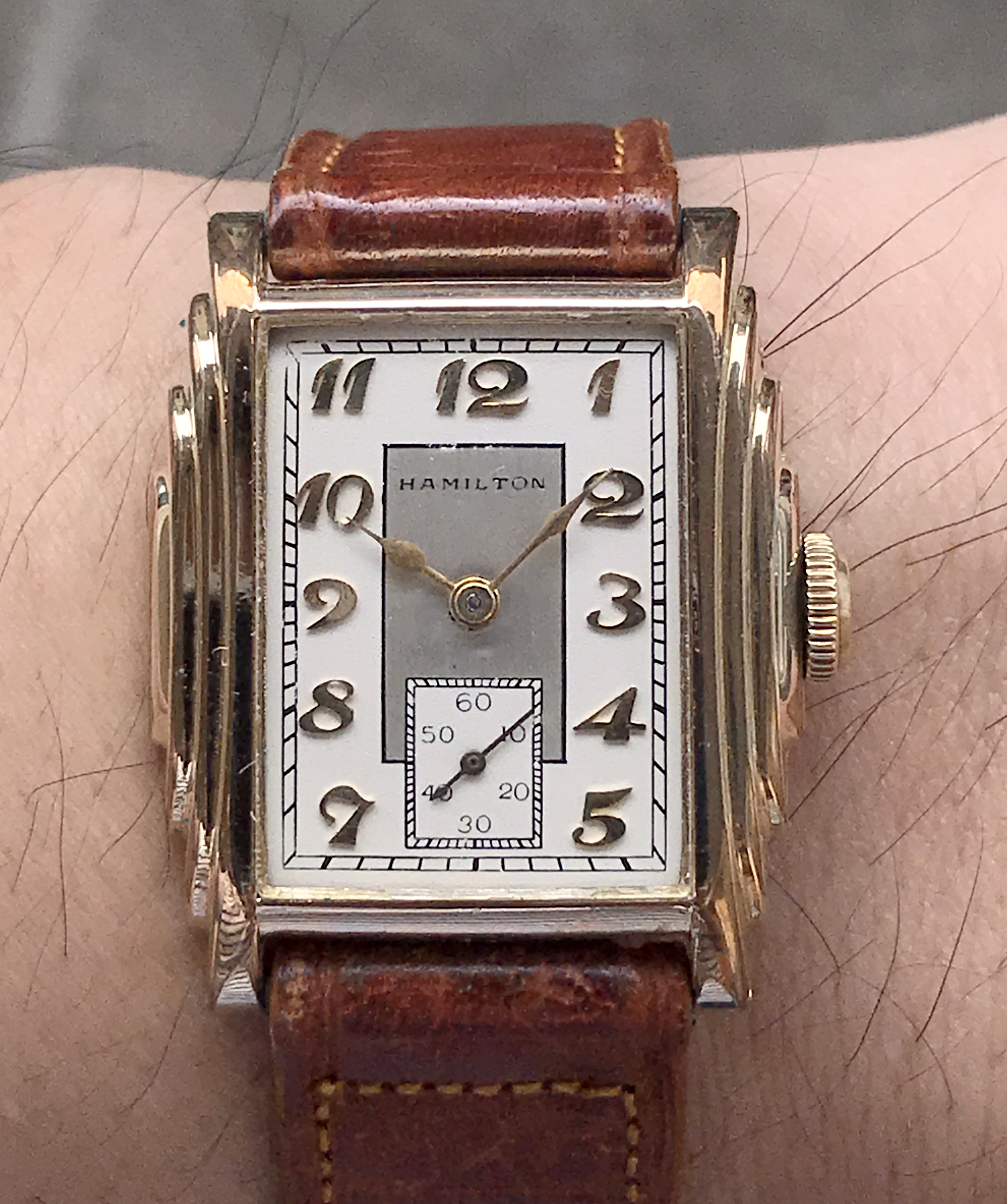 I have many Hamilton favourites. But this one is near the top. It is a grade 952, 16-size, 19-jewel version of the iconic 950, 950 E, and 950 B. The 952 came factory cased in the case shown, with hinged covers. The 952 over the 30 years I have owned this one, has surfaced as quite collectable. Compared to many Hamilton 16-size pocket watch production, the 952 is fairly scarce in good condition. There were three versions of the 952 made over the years. This is the earliest model as indicated by the one-piece barrel bridge, and two screws holding the crown wheel core.