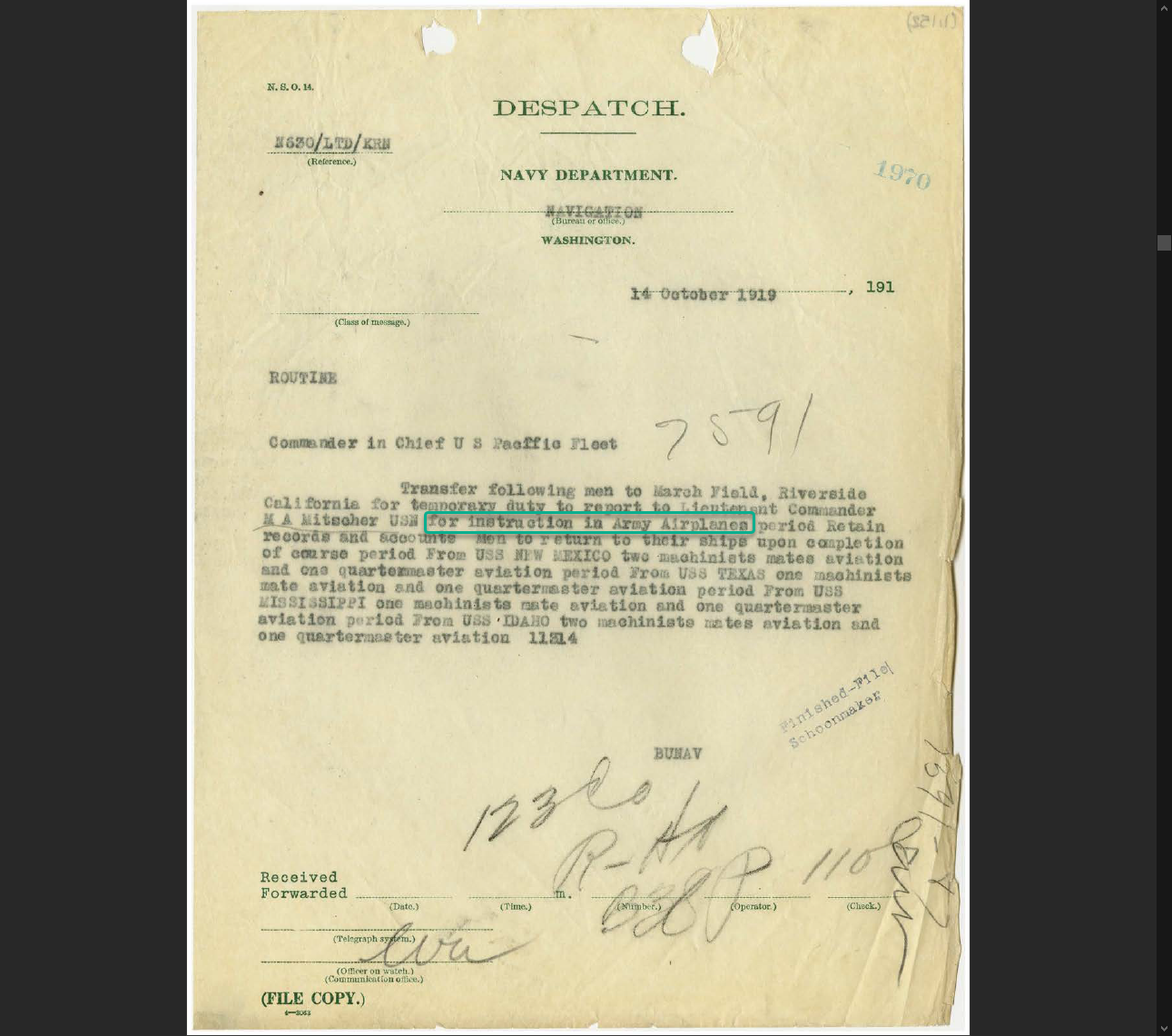 Some other interesting facts. Mitscher was an evaluator of advancements in war plane design while he worked for the BuAero and BuNav. There are many examples in his files of this type of trip.