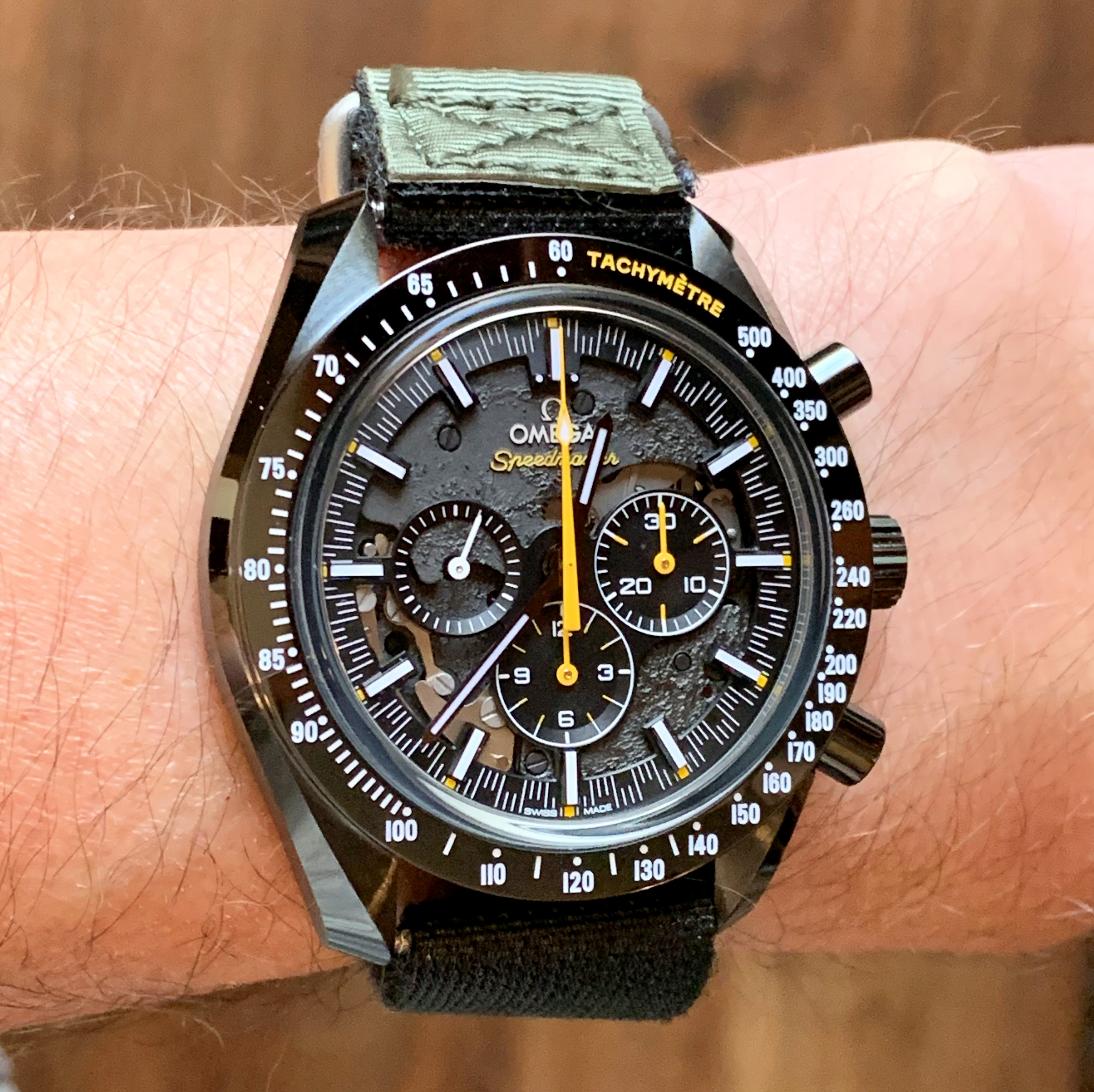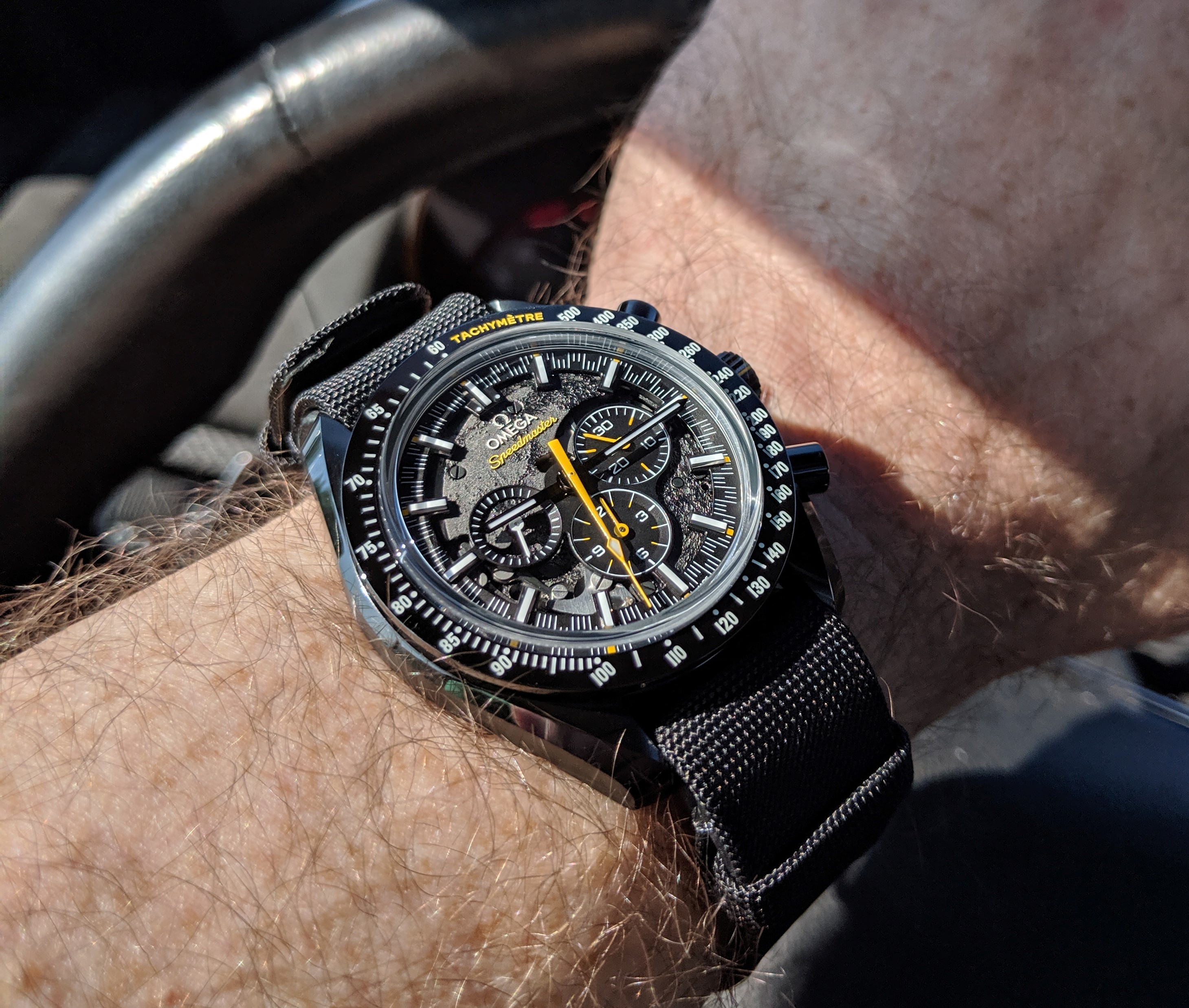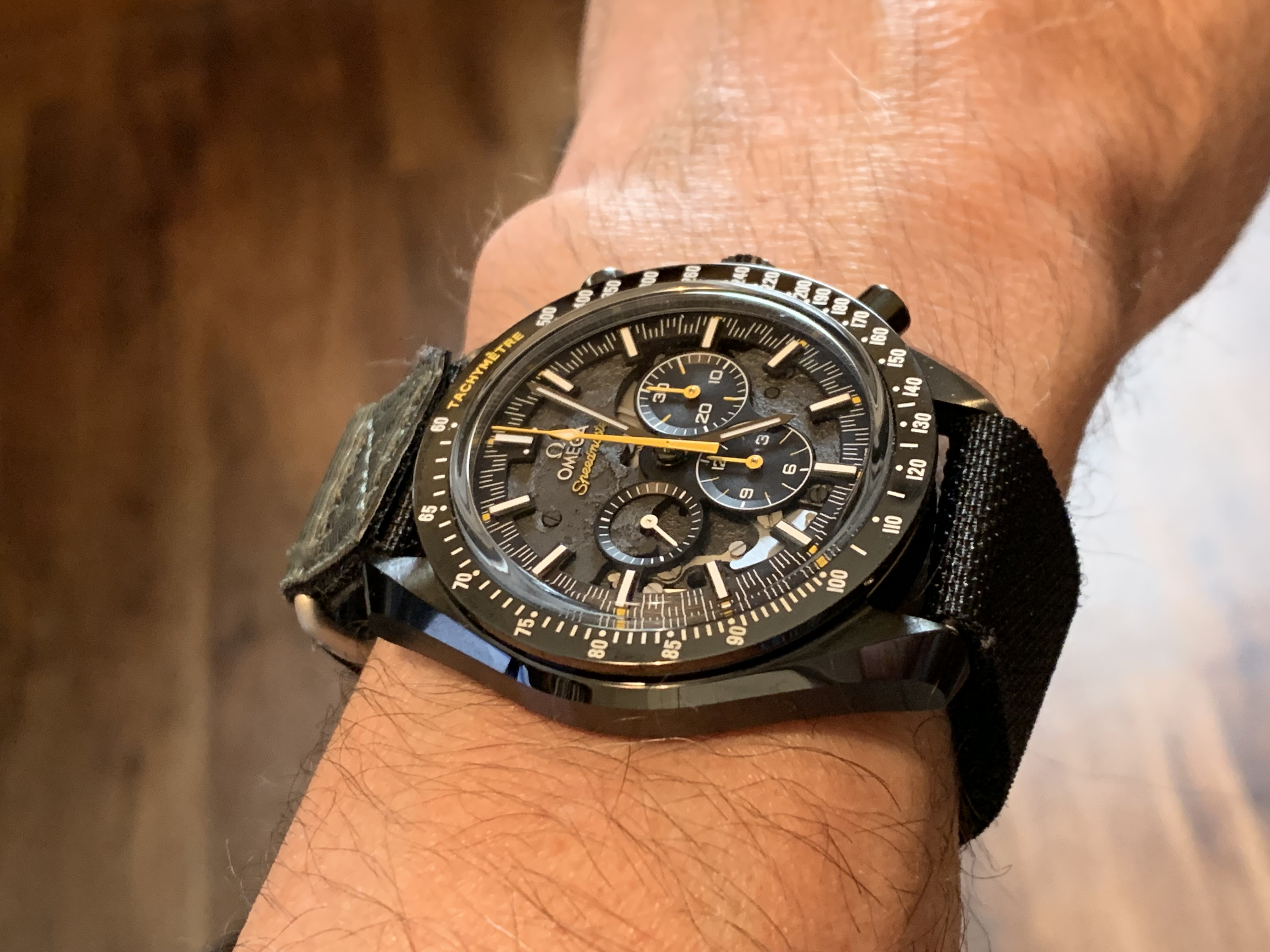 The laser ablation and blackened bridges on both sides of the dial really add depth to the look of this watch as do the way the 3 sub dials with the small seconds being smaller and less intrusive then the main chrono counter dials as they seem to float in a 3D like way. I was also drawn to the racing style minute track around the outside of the dial which harks back to its racing heritage IMO. The use of yellow is quiet subtle and not overpowering but adds some highlights to the dark dial with just the Chrono second hand and small counters having this colour as well as the 5 minute markers on the outside of the minute track and of course the Speedmaster writing below the Omega logo and name plus of course the Tachymetre on the lumed bezel.