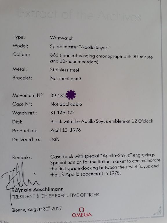 #47x with movement serial number: 39.181.0xx extract from archives - production date May the 3rd 1976 - official all original Apollo Soyuz