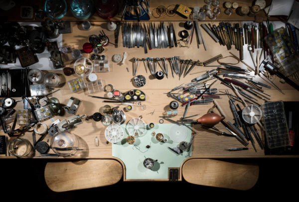 The material used on watchmaker benches is typically green. Every bench I’ve worked at in school or at brand training has been green. This material is Borco, which is the same material you find on manual drafting tables. I think that material has come in green, and it was just adapted for use on benches for watchmaking.