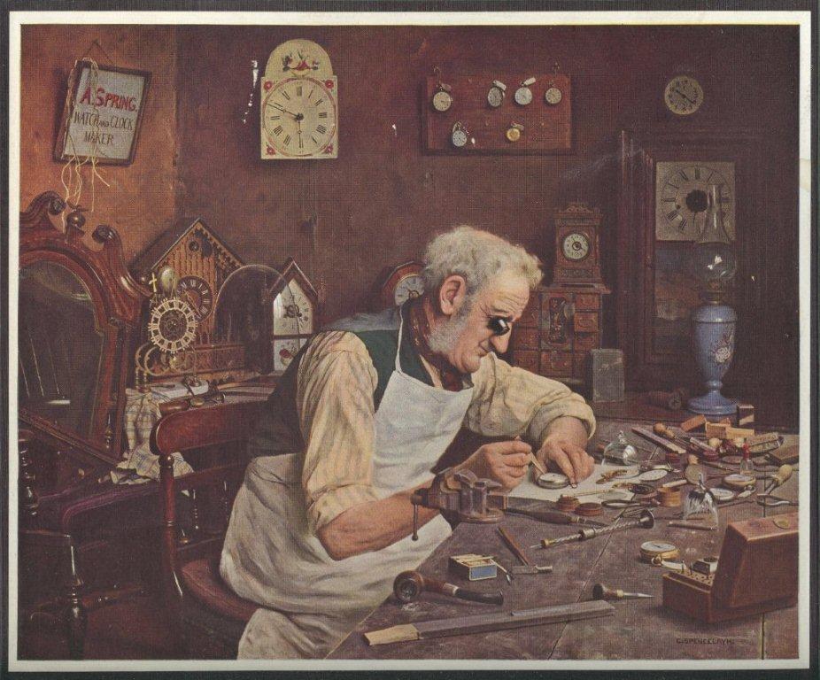“THE CRAFTSMAN”. Charles Spencelayh. 1865-1958. A watchmaker’s workbench, circa maybe 1895. Not me, not my workbench. I found this calendar at an auction in about 2005. There was one other bidder. A lady. I was bound and determined I was going home with it! This calendar is from 1940 (the year I was born, and was un-used), and was offered by a local watch material supply house (now, long since). Spencelayh is well represented at the Tate Gallery in London, but they admit that they don’t have this one.