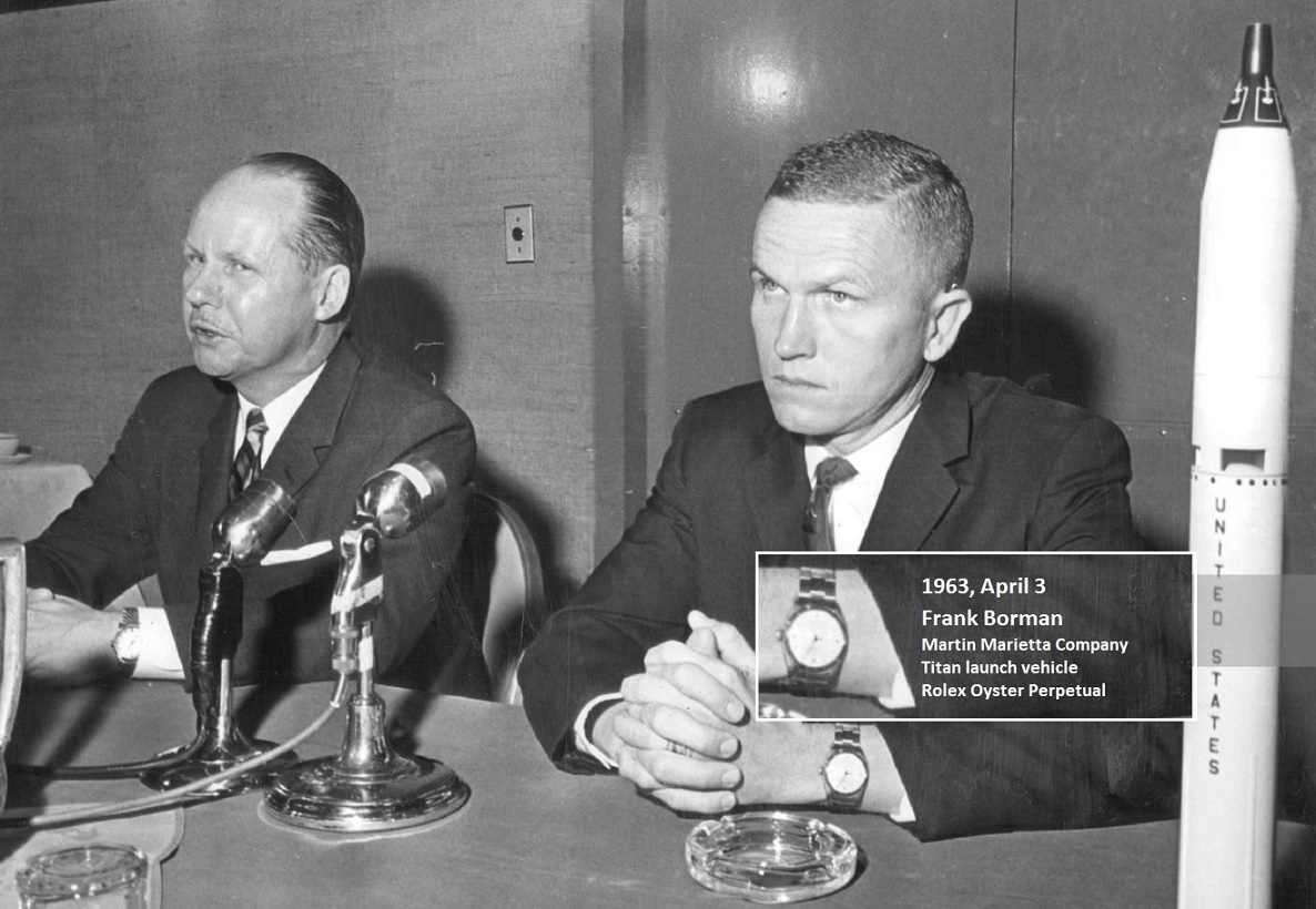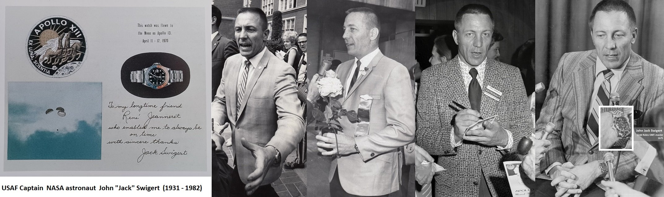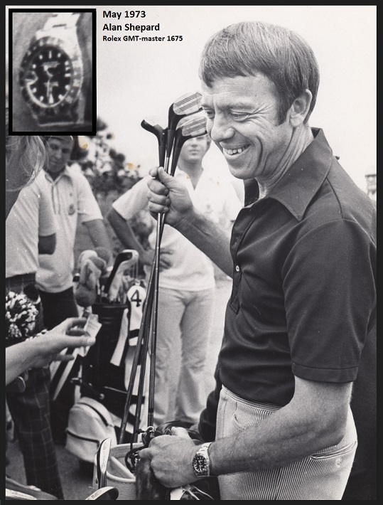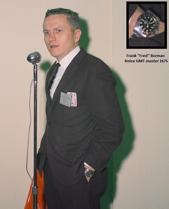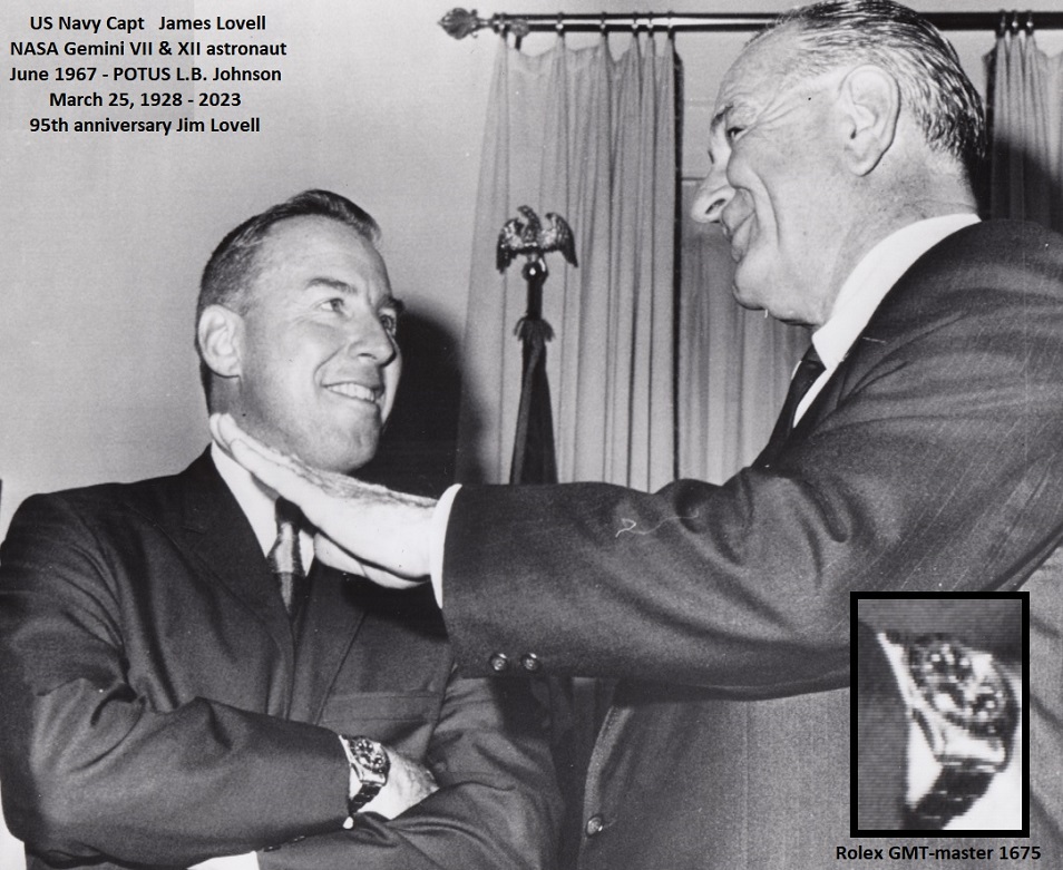Note in this JUne 1967 photo, Lovell wore his personal Rolex GMT-master 1675 aviator wrist watch on an Oyster bracelet, standing next to US President Lyndon B. Johnson.