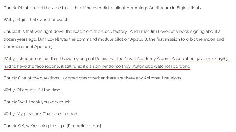 Here is a passage from the article where Schirra discusses his Rolex.