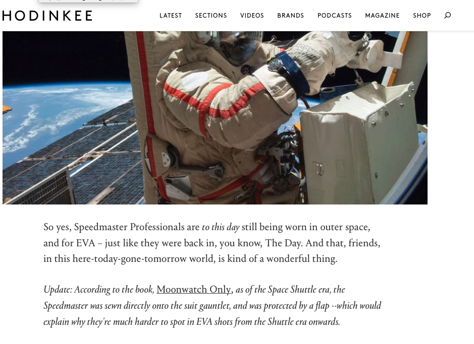 I accept your point but I did read several articles that stated the Speedmaster professional is currently worn for EVA's. I'll try to find it and post a link. Also Hodinkee did an article about the watch still being worn and they point out that the newer space suits have the watch sewn Ito the gauntlet with a matching white flap covering it. see pic attached.