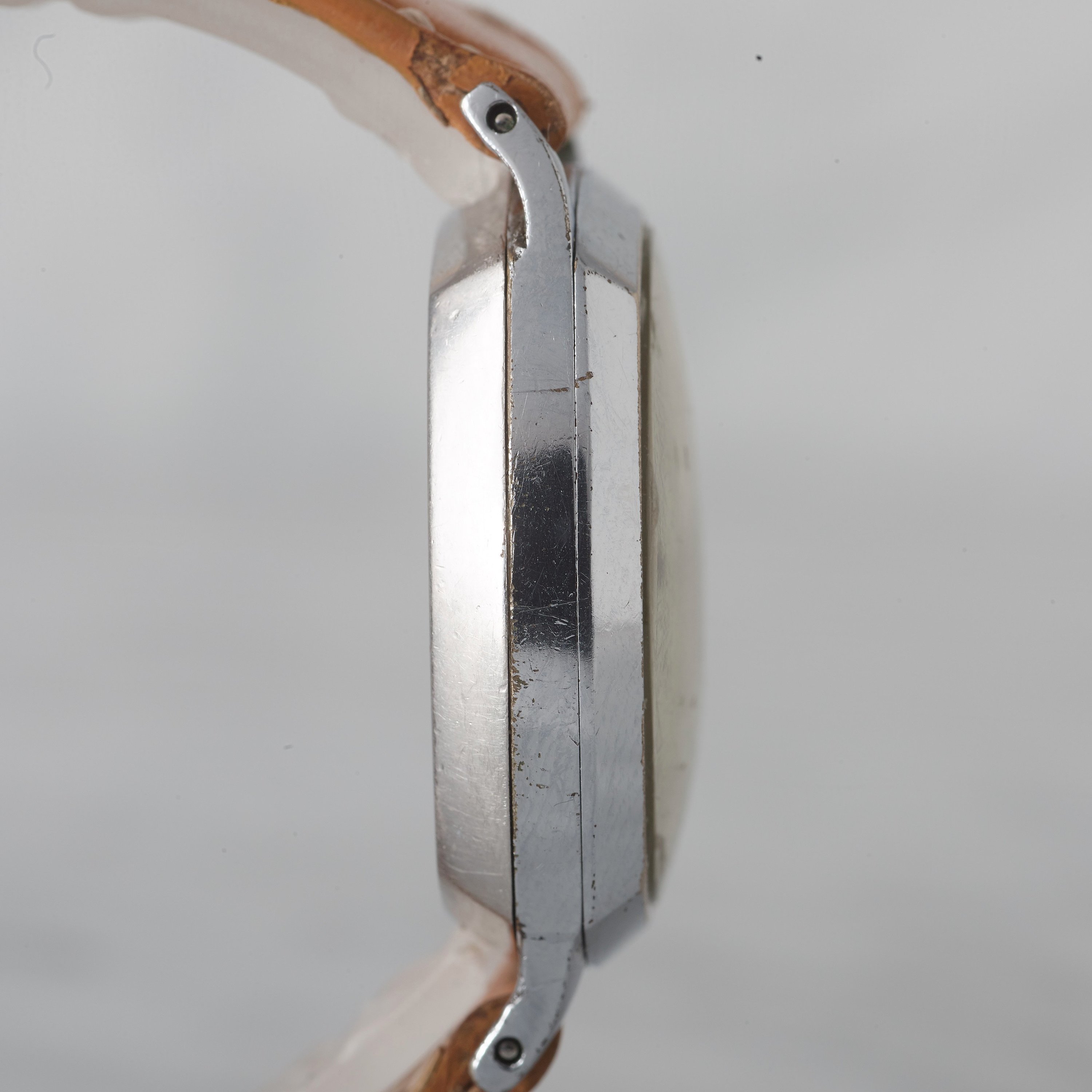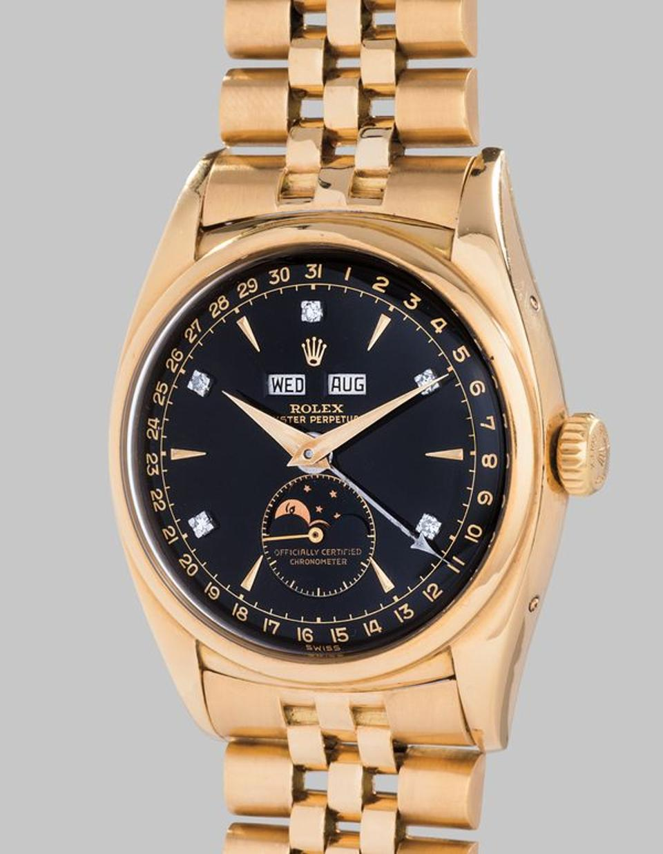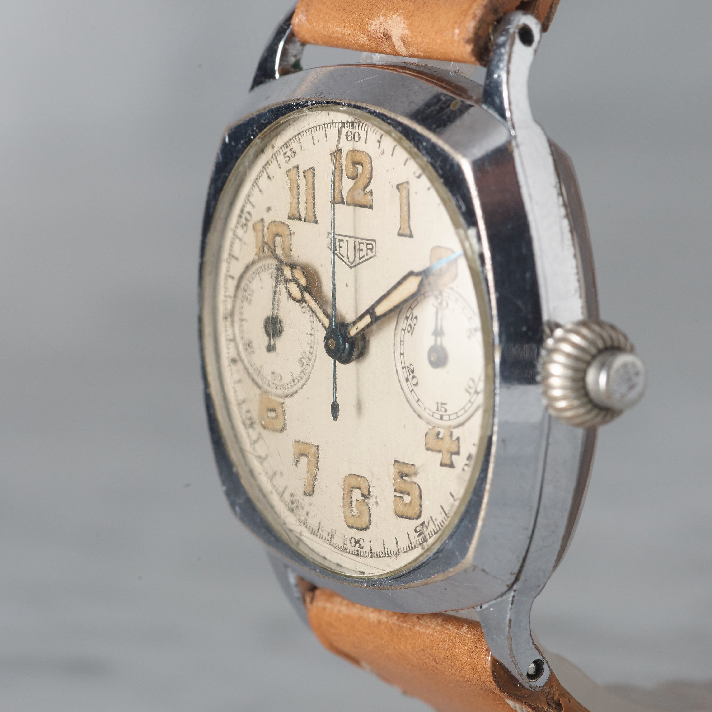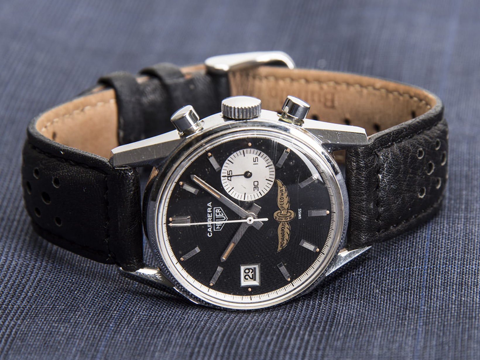 The seller emphasizes the provenance of this reference 3147N, which came from an estate in Indianapolis that included a lot of other Indy 500 memorabilia; its former owner worked at the Speedway during the Indy 500 race. The watch looks in better than honest condition, with the necessary aging that proves that the dial does not come from new stock. The hands are original, and have a very nice patina, which matches the lume plots. Lastly, the manual winding Landeron 189 chronograph movement is said to work well, although the pusher action is described as a bit sluggish.