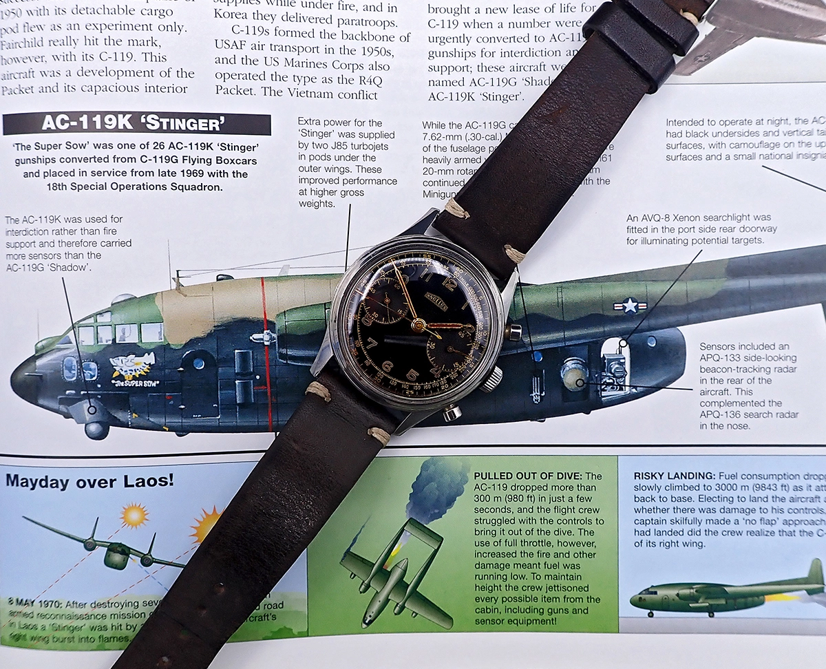 STRAP: This cool Angelus chrono comes on a lightly used distressed Italian leather aviator’s strap in a very complementary espresso color, with rugged off-white stitching at the lug ends that suits the watch perfectly. This large Angelus has a lug width of 20mm.