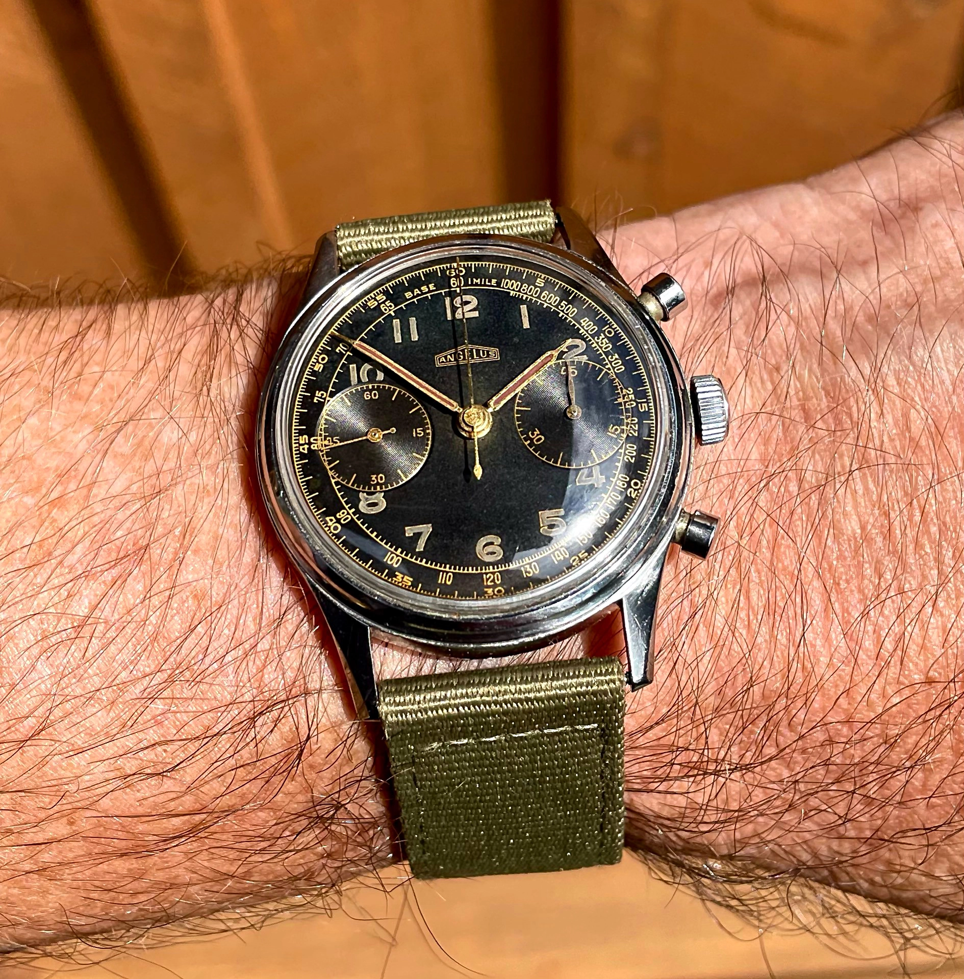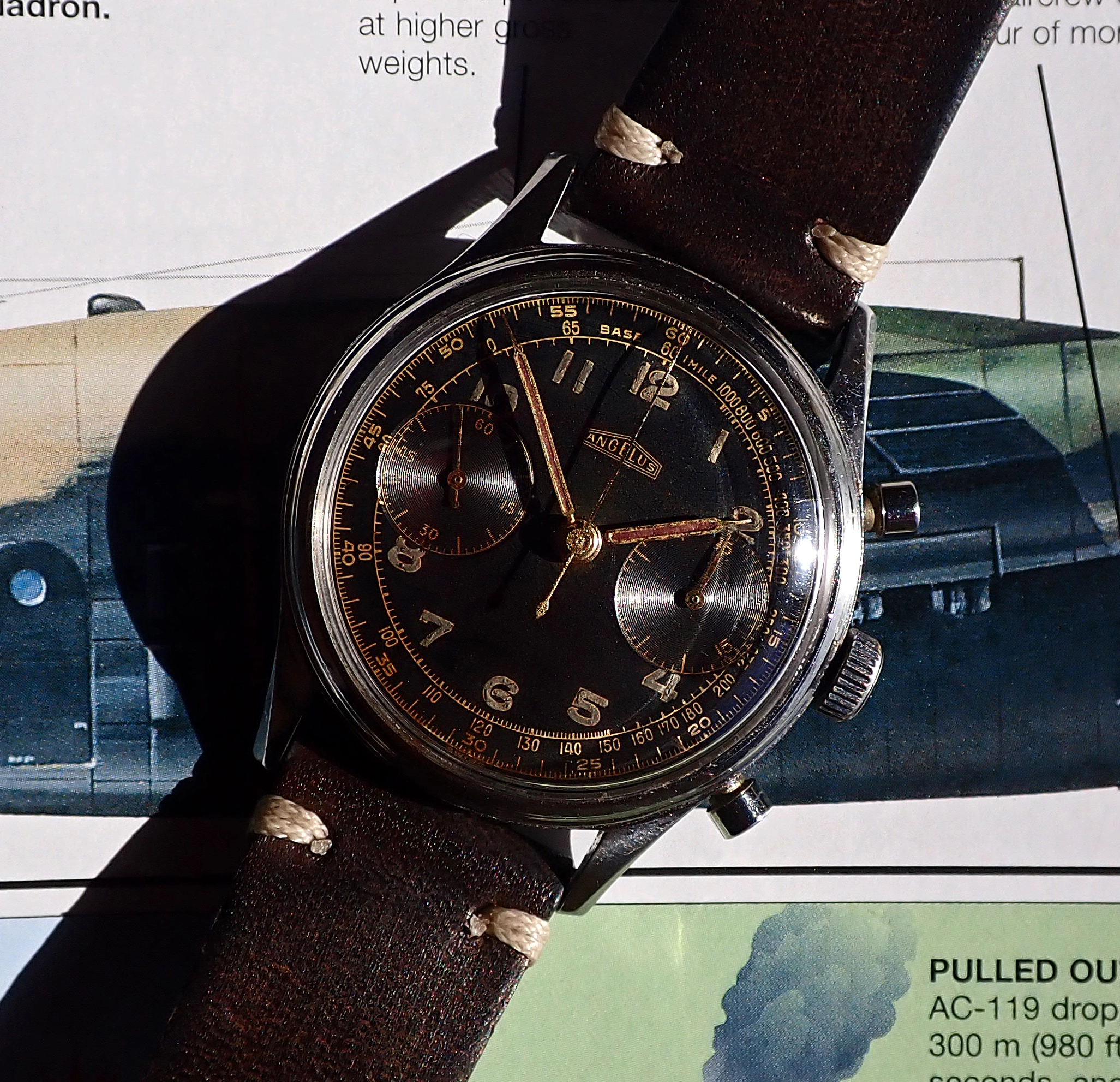 ·Up for sale is this large and beautiful circa 1940s-50s Angelus chronograph in all-stainless steel case with stunning dark brown tropical gilt dial, powered by the in-house Angelus cal. 215 movement. A famed maker of movements for others, Angelus came into their own in the middle of the twentieth century, when the demand for chronographs for military and civilian use reached a fever pitch. In addition to their famed Chronodato models, Angelus also produced aviator & military-style chronographs to meet the demand of the WWII and post-War era, like this one, which is exactly the same model as the “L.E.” marked Hungarian Air Force-issued version. This example has no issue marks but is notable not only for the large and sought after 38mm case but the stunning original gilt dial with “big eye” sub-dials and original radium luminous Arabic numerals that has also aged to a very beautiful and even deep brown tropical tone. This oversized Angelus military-style chronograph is pure vintage charm on the wrist.