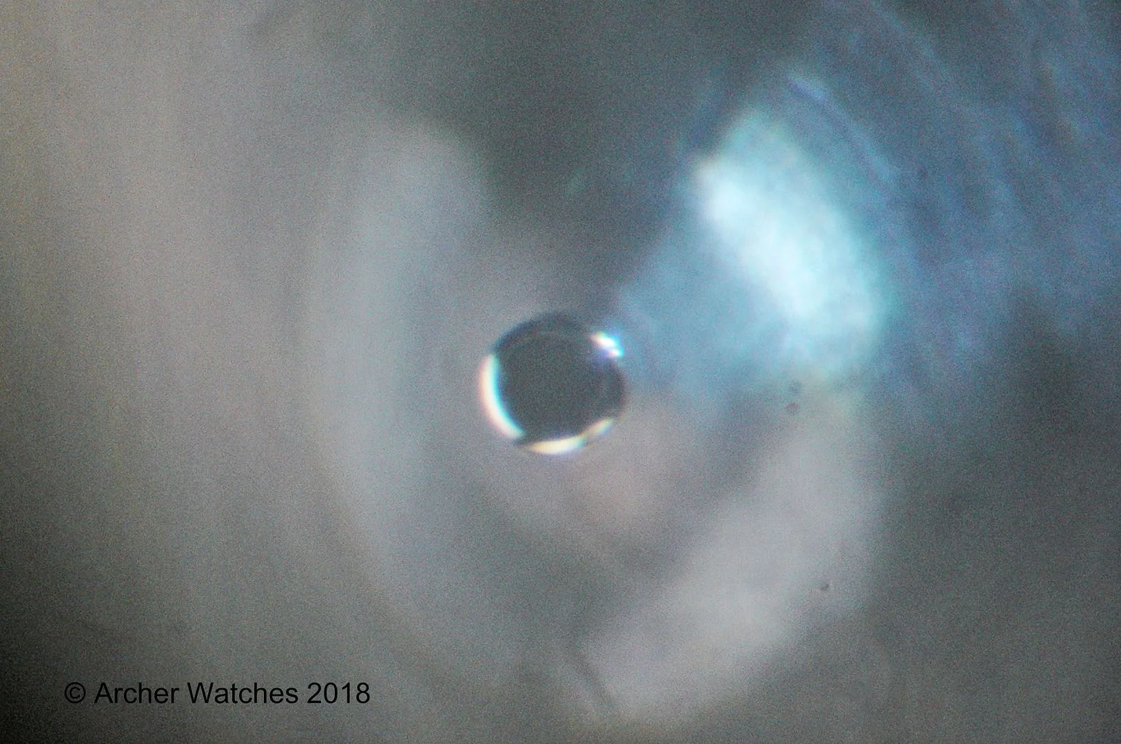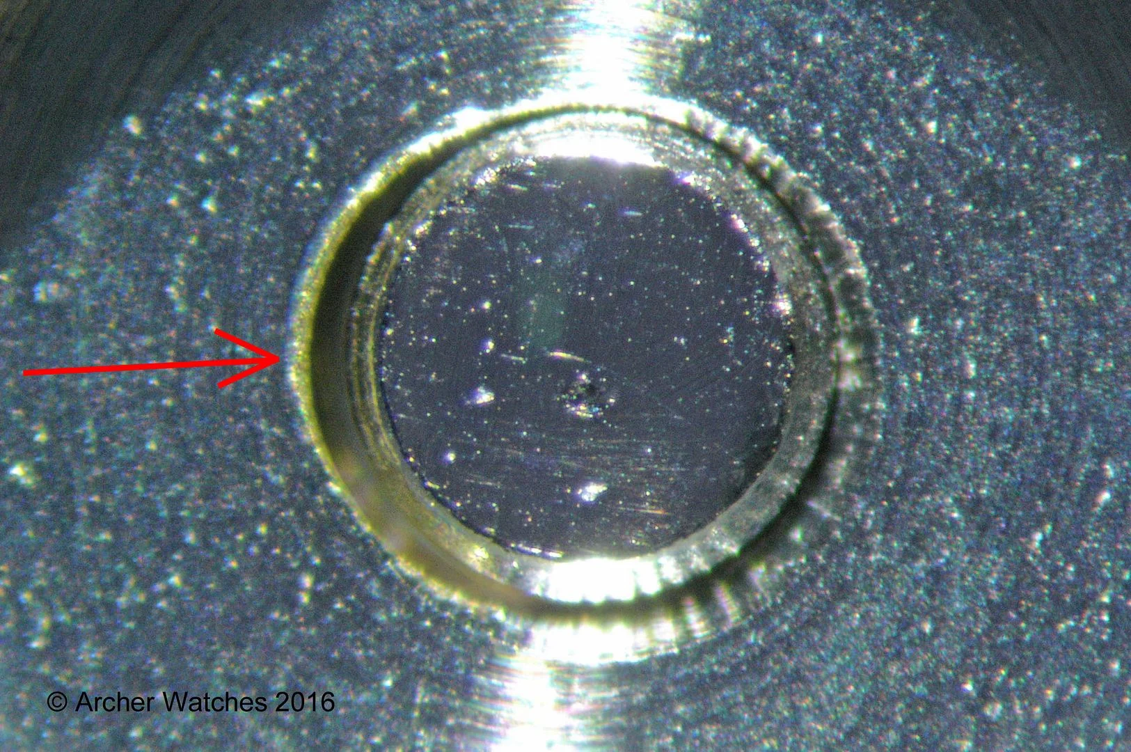 You rarely see this damage on corresponding hole in the barrel lid, because this is damage caused by a watchmaker, rather than wear. This is some watchmaker making a very ham fisted attempt at installing the barrel arbor, and in the process the hardened steel arbor has caused damage to the soft brass of the mainspring barrel. The damage here can cause a lot of problems with lost balance amplitude and erratic running, because when the mainspring unwinds, the barrel spins around that arbor. If there are burrs here it's going to cause added drag. This damage can be repaired (cleaned up) to a certain extent, but if it's really bad, a new barrel drum is needed.
