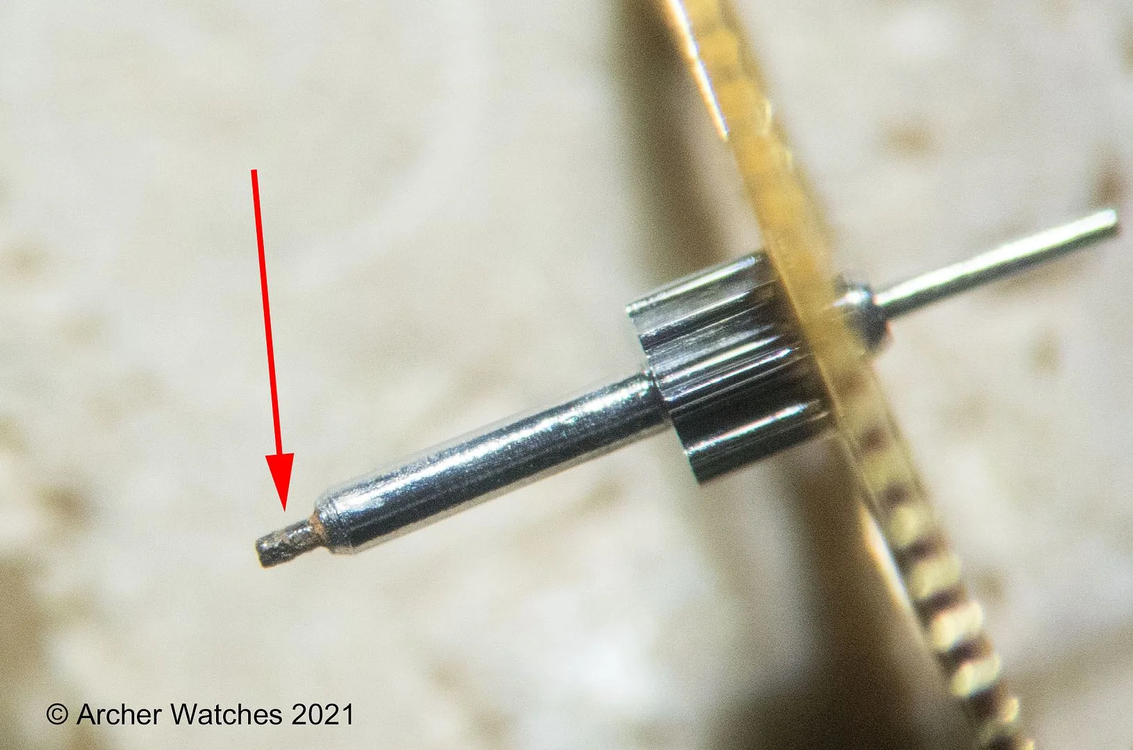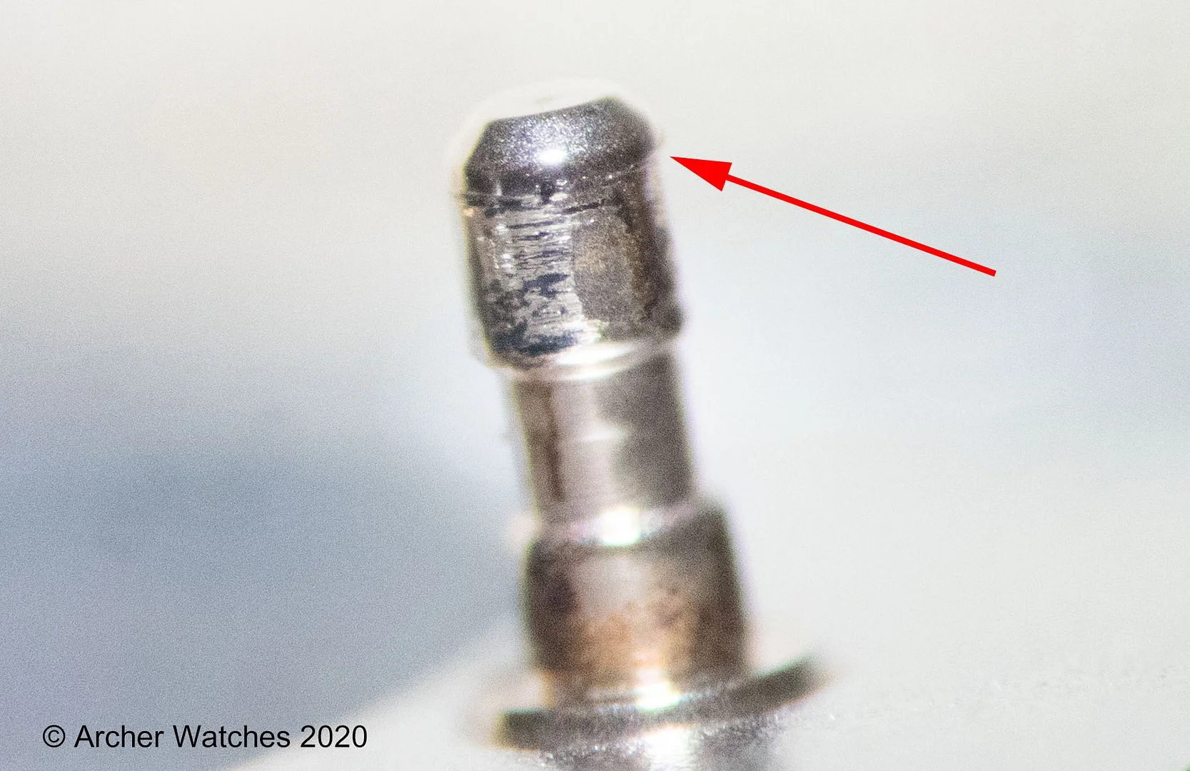 Even if a part is readily available, I will sometime repair it if it makes economic sense. This is a worn post on a 7750 based Omega movement: