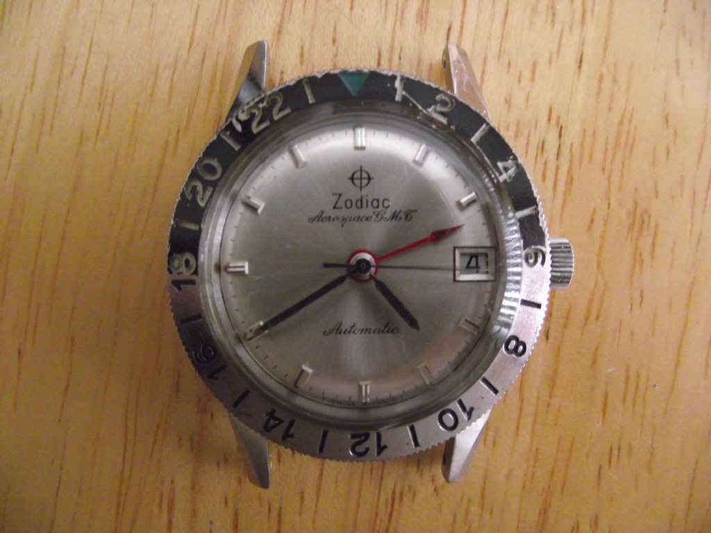 ·I have been wanting a GMT watch for awhile, thought about selling or trading my "Soccer Timer" but decided agaisnt that idea. So I bought a Zodiac Aerospace GMT. As our daughter graduates and goes off to college in Aug the money is not really there for a Broad Arrow... yet... This one is an early one. very much original except for no band. (which are about impossible to find for Zodiacs) The pictures for some reason make the hands look black when in fact they are silver. Still learning the camera..