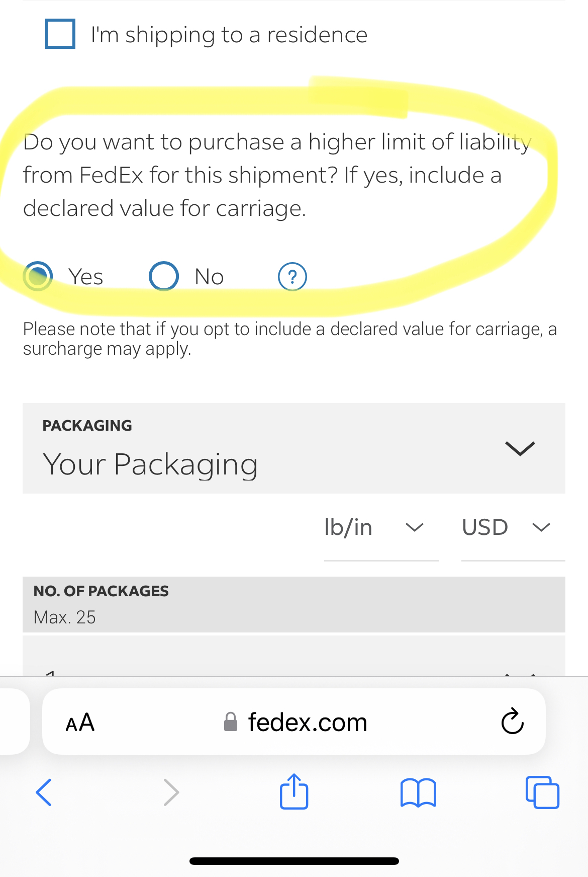 thabks. You can insure through FedEx…no need to use a private company. You just check the dot that I circled in the image and then input your insured value.