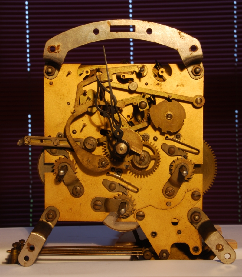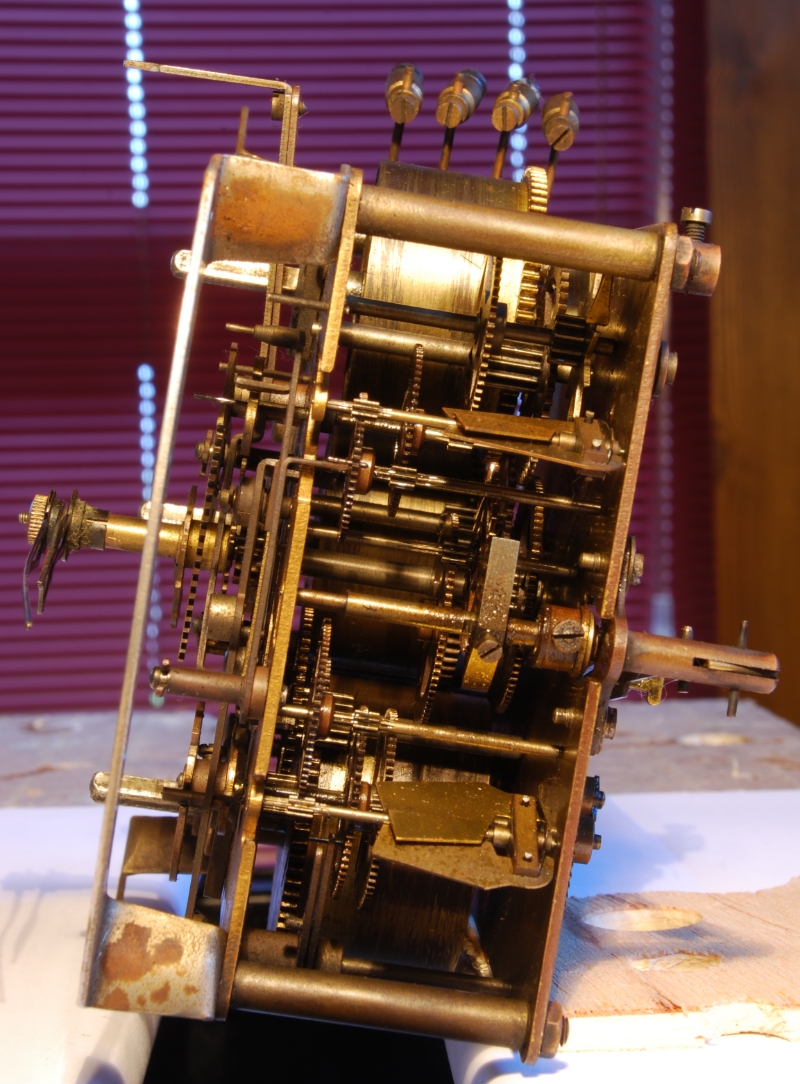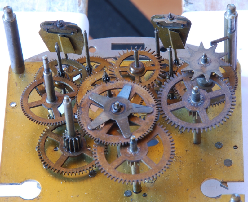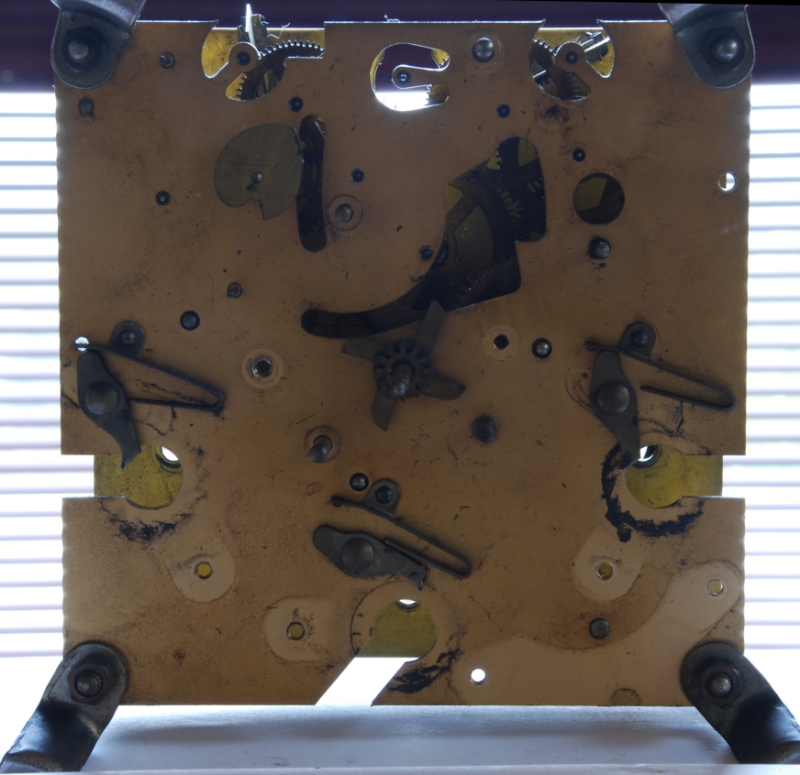 A rear view showing the train for the chimes on the left and the long bar on the right works the hour striking on three of the four notes. In the middle is where the pendulum attaches. Plenty of WD40 here....