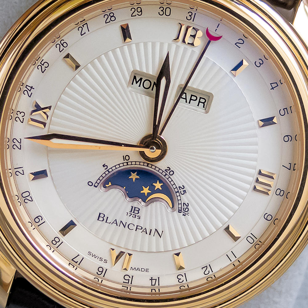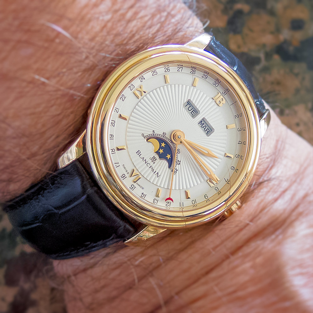 I recently acquired this 260th Anniversary model. Although I don't need a dress watch, I wanted the Moon-Phase complication and my wife liked the guilloche dial. The wife liked part made this all possible. I've since ordered new Blancpain strap in brown to go with the Rose Gold case.