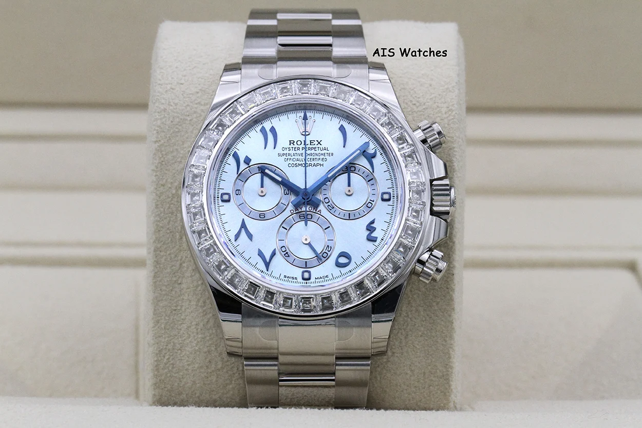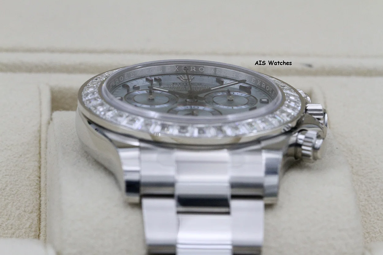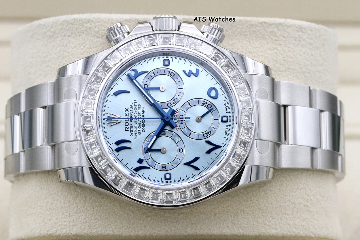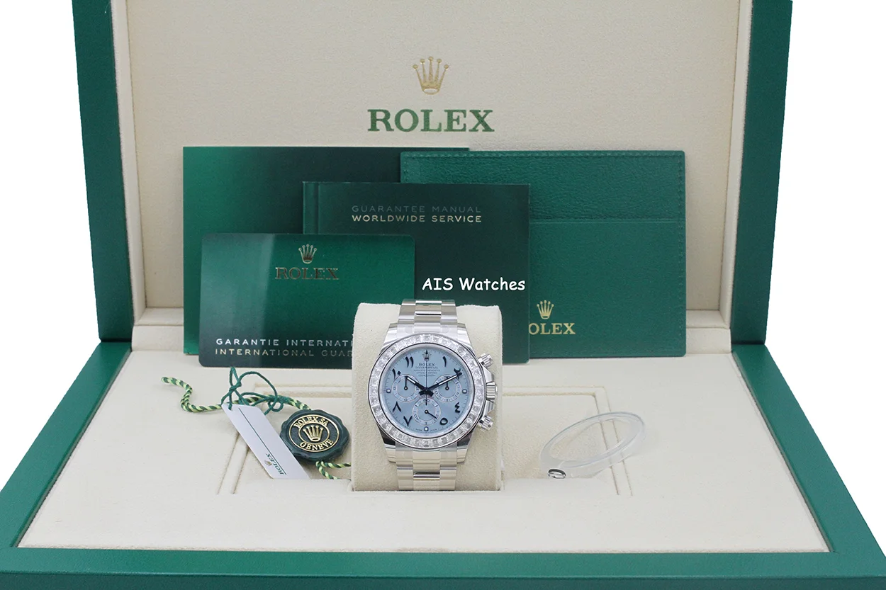 ** BNIB Rolex 116576TBR Platinum Daytona Cosmograph Ice Blue Arabic Dial Baguette Diamond Bezel