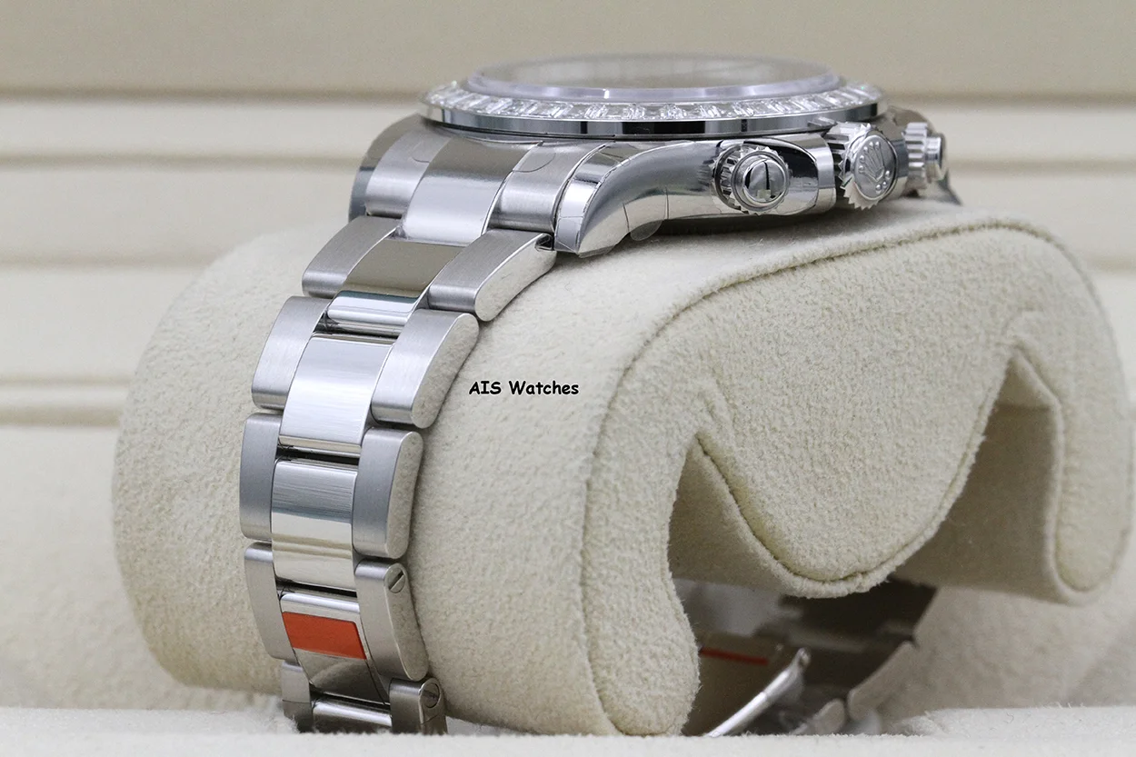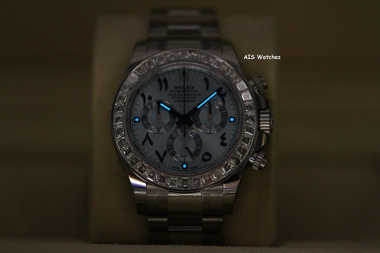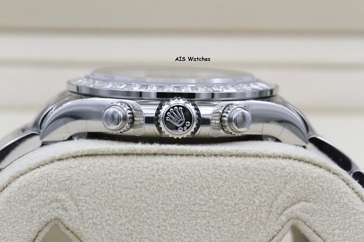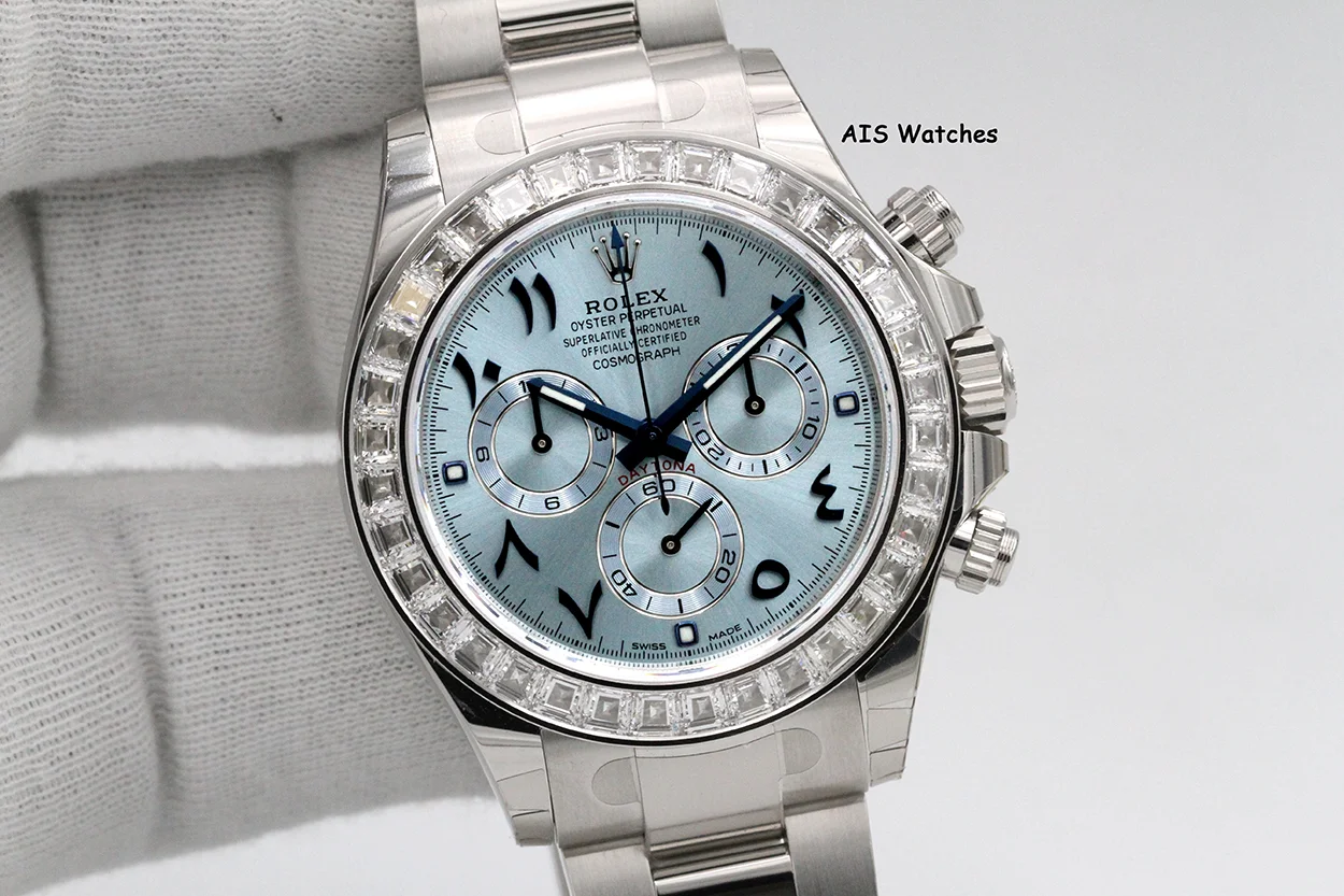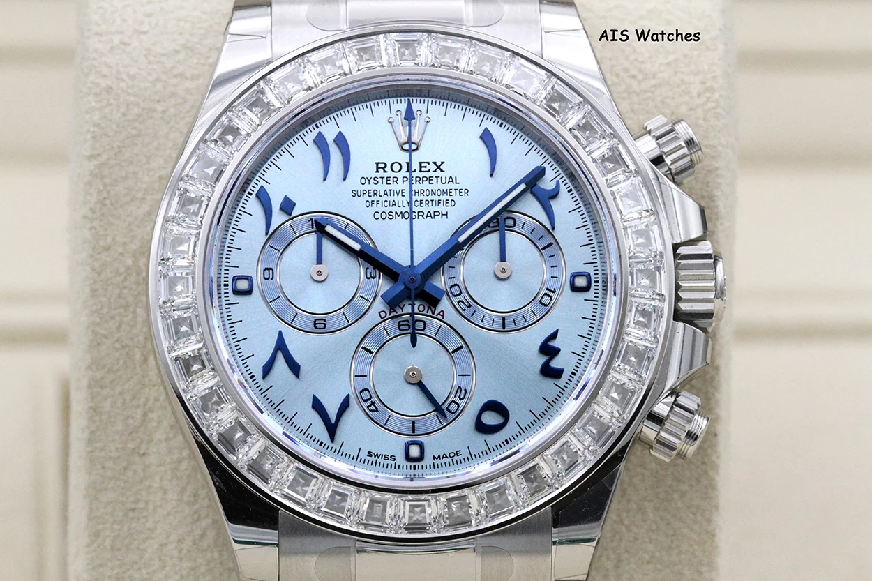 ** BNIB Rolex 116576TBR Platinum Daytona Cosmograph Ice Blue Arabic Dial Baguette Diamond Bezel