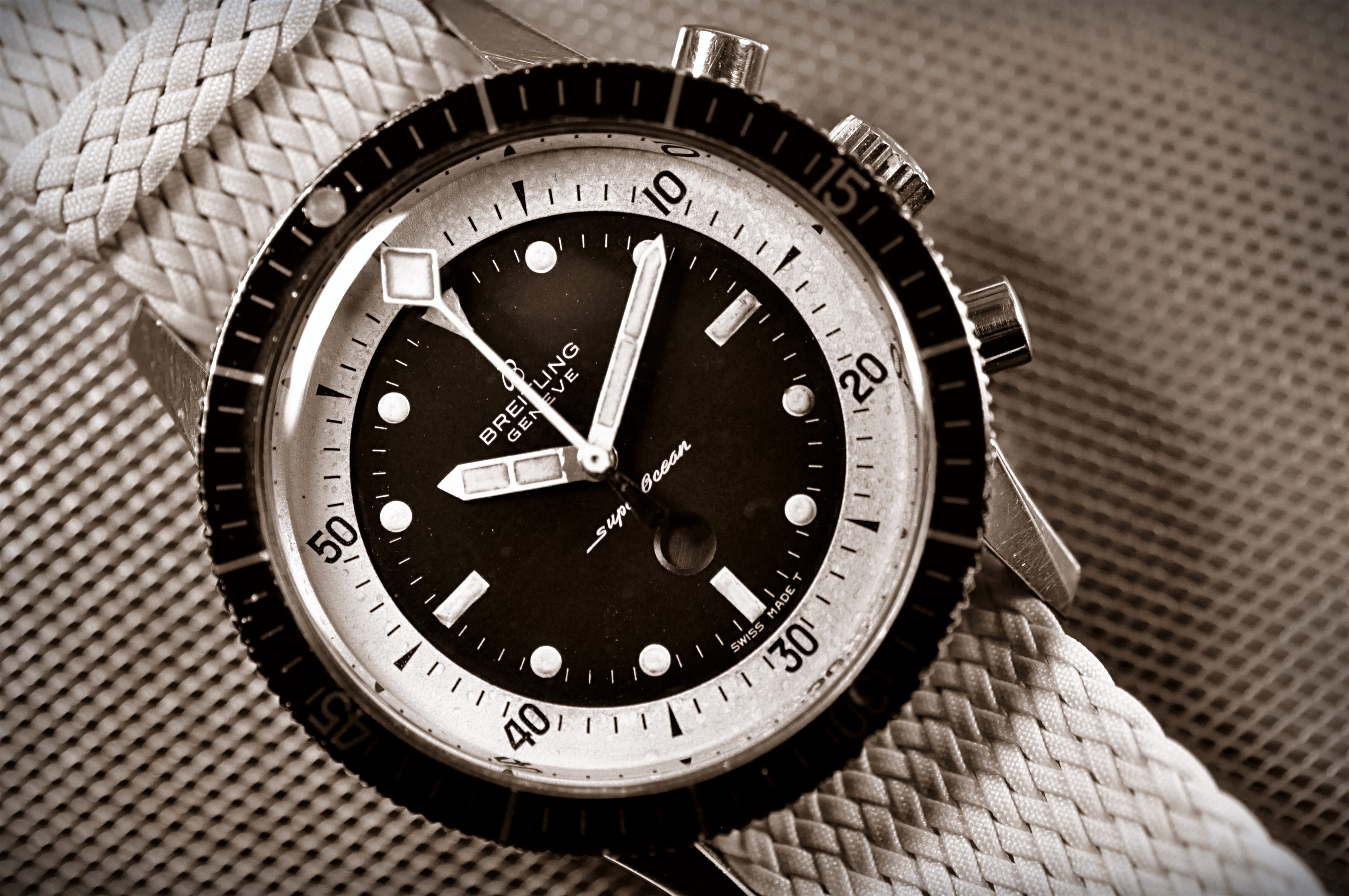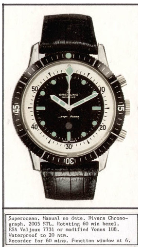 Posts 430 Likes 5,490 primabaleron ·Dec 11, 2016 Unique slow motion chronograph. Breitling Superocean ref 2005 with the movement Valjoux 7331. Sweep hand shows the minutes for the diver. The hole on the dial shows the chronograph mode. Beautiful piece of history of time 😀