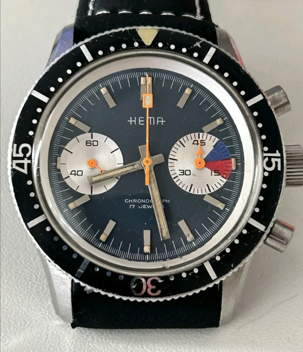 This has the common "Aquagraph" case, also very common dial style and bezel and Landeron 248 movement. Could have been made by anyone in Switzerland. Hema certainly had a range of watches that look a lot like many other brands, they even had what I am sure is a Hema signed Heuer Camaro.