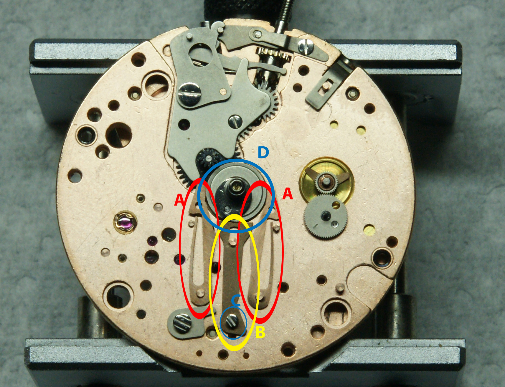 When the chronograph is not running, the minute recording driver "D" is locked in position by the two clamps "A". Starting the chronograph, a lever pulls on the eccentric "C" mounted on the Valet for Minute Recorder Clamp "B", moving it downwards and forcing the clamps apart, thus allowing the minute recorder to rotate. Stopping the chronograph moves the valet back upwards, letting the clamps back in against the runner. Now, here is the clever bit; when you push the reset, the runner has to be free to move so the clamps are forced apart just before the reset hammer strikes the heart mounted on the runner. That was a real pain to adjust just right but needless to say, I got there in the end......
