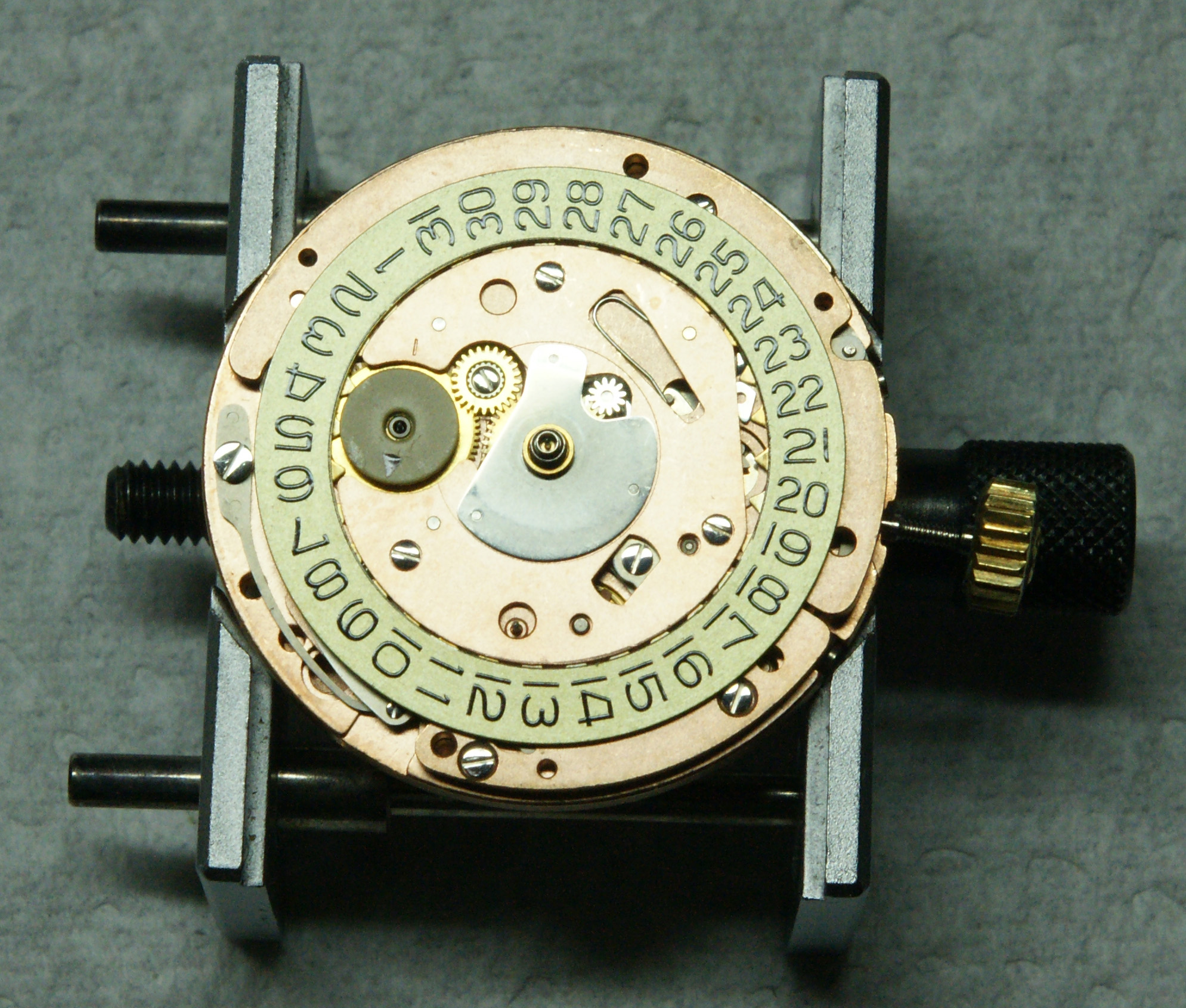 This is where I encountered the first problem. The screw in the middle of the small wheel, next to the day/night indicator, was broken off and had been glued back on. This struck me as strange because it is not expensive to replace a screw. The more eagle-eyed will see the end of the screw, still in the plate in this next photo that also shows the complicated date change mechanism.