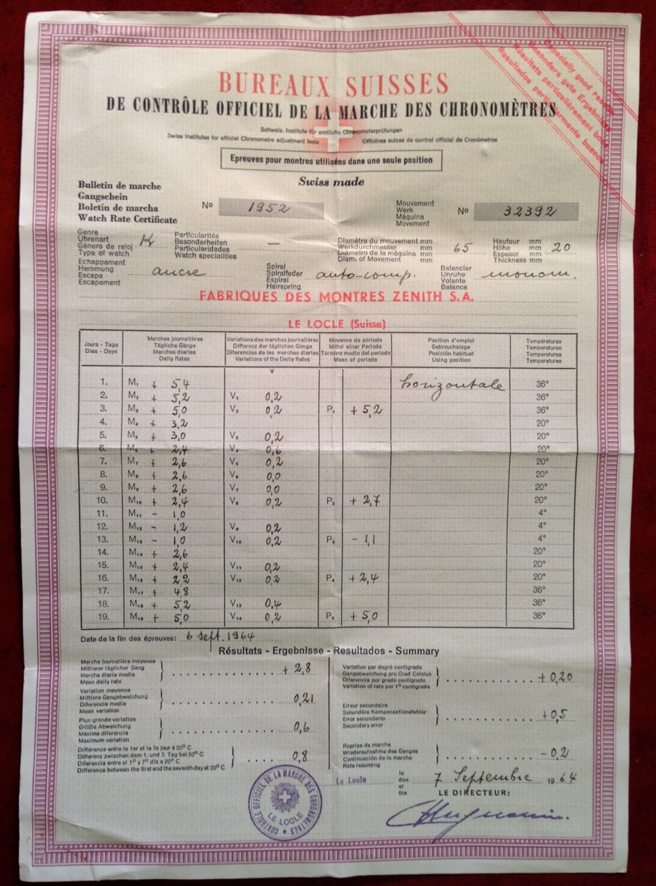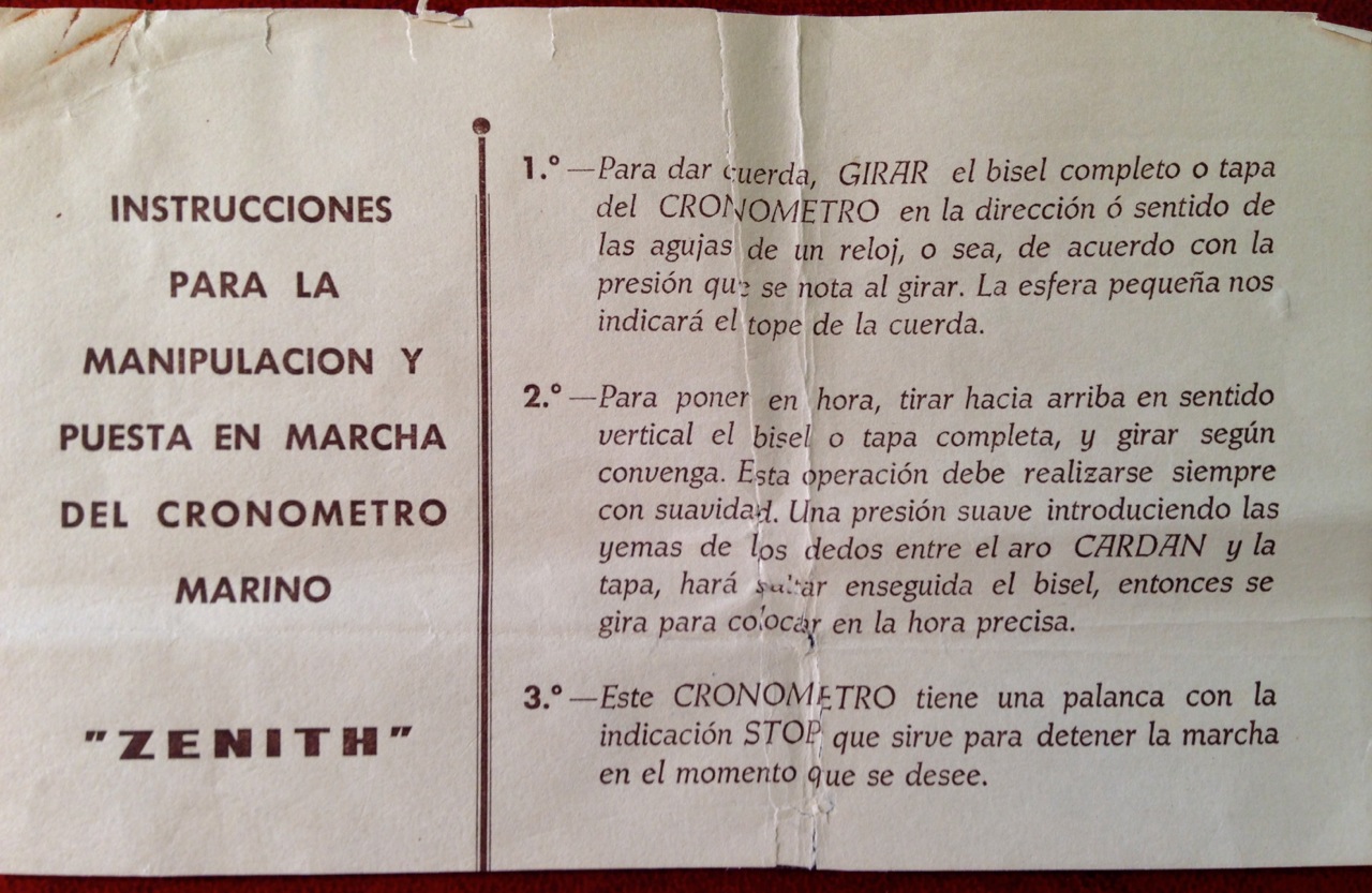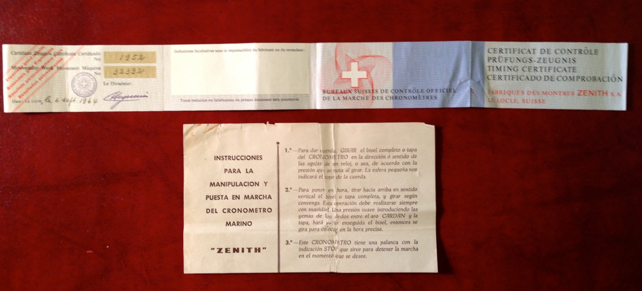 Also illustrated is the timing certificate from 1964 and the original instructions in Spanish for the Zenith 'Cronometro Marino'. I found it in Madrid.