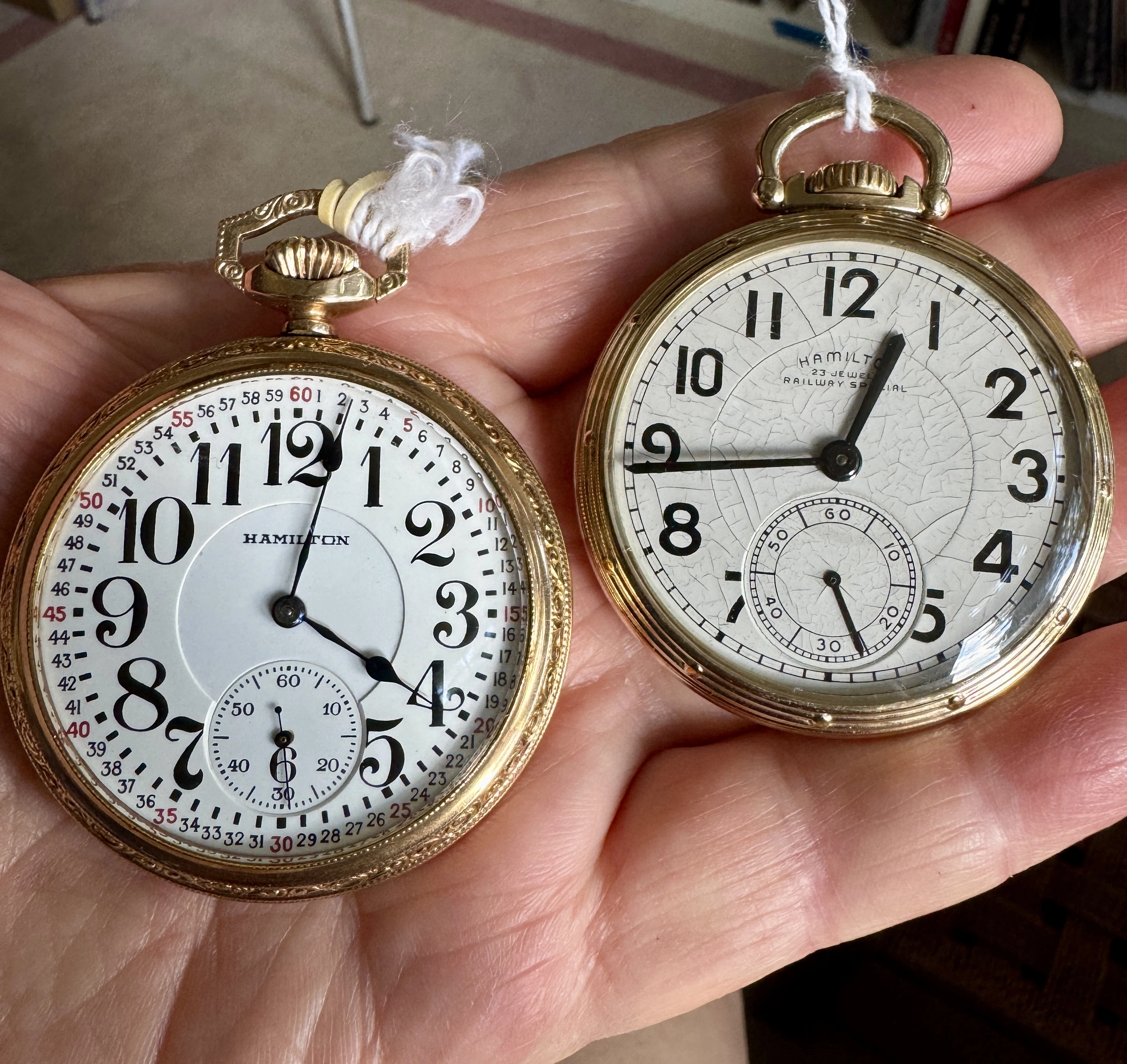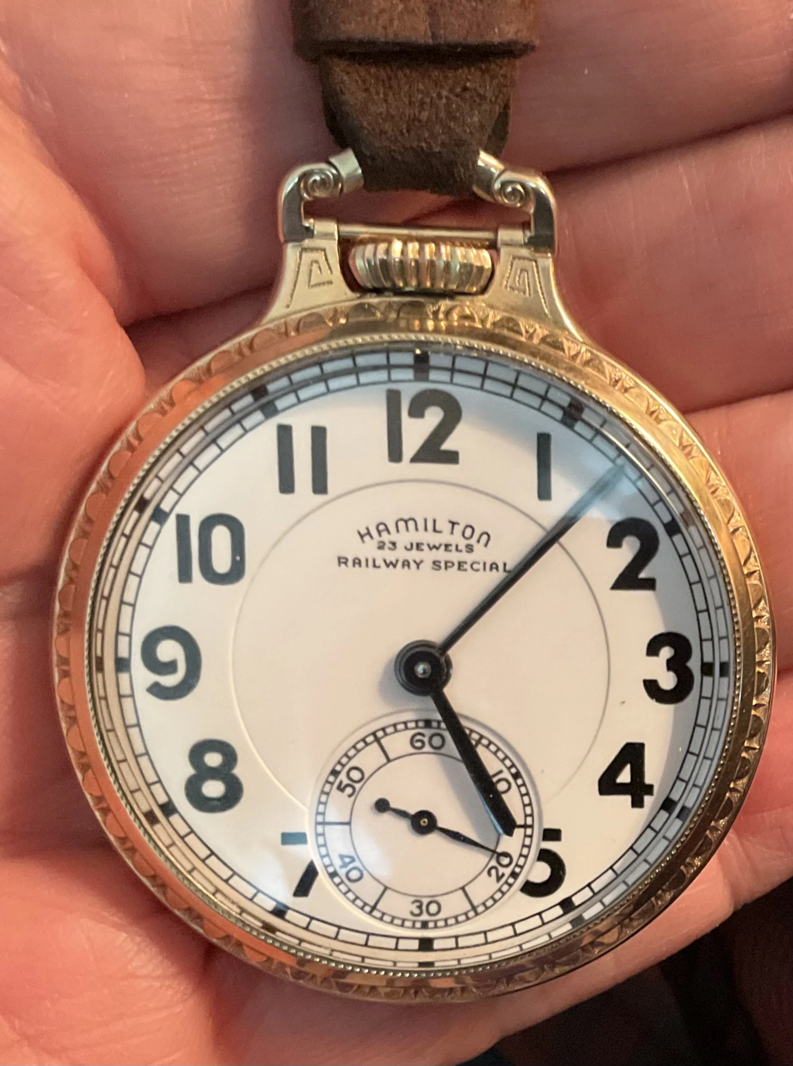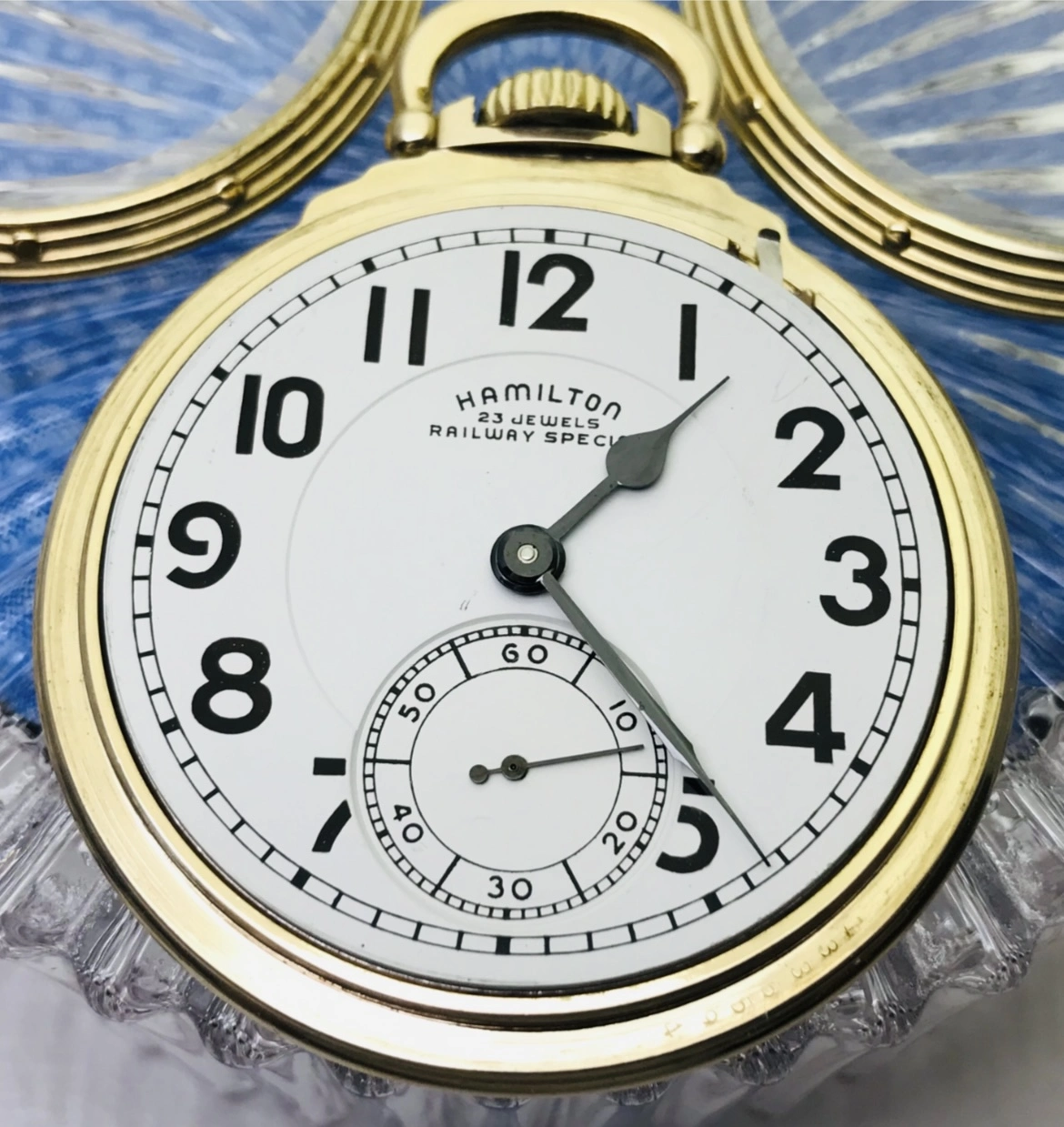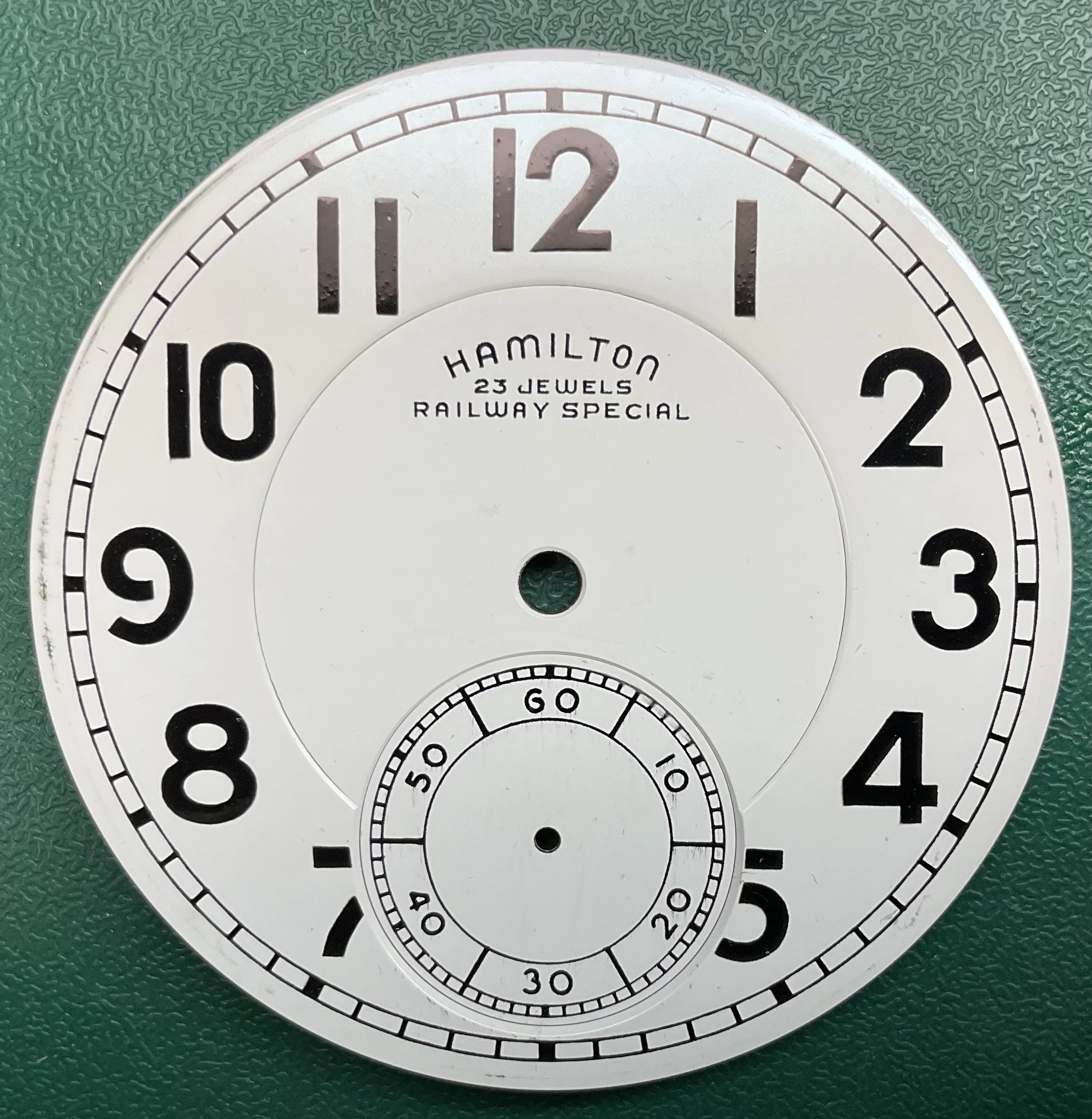 Earlier in this thread, I posted a picture of my Hamilton 950B which has had a double sunk vitreous enamel dial fitted to it. It came to me with a melamine dial which was factory original. When the vitreous enamel dial became available, I liked it better. I have saved the original melamine dial. I am showing my Hamilton 950B with the vitreous enamel dial again, along with a picture of the original melamine dial. The 950B posted by