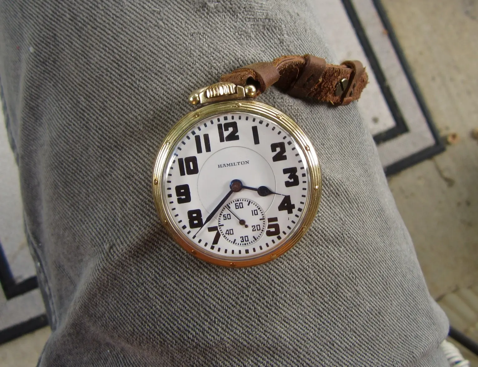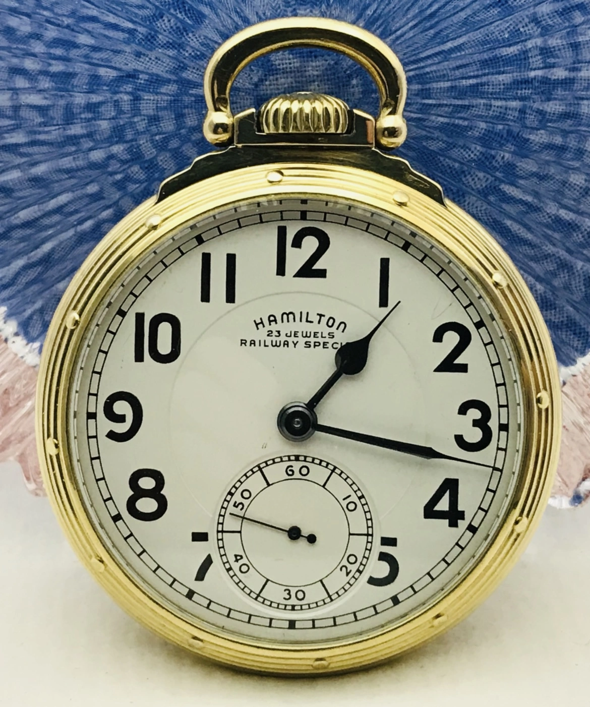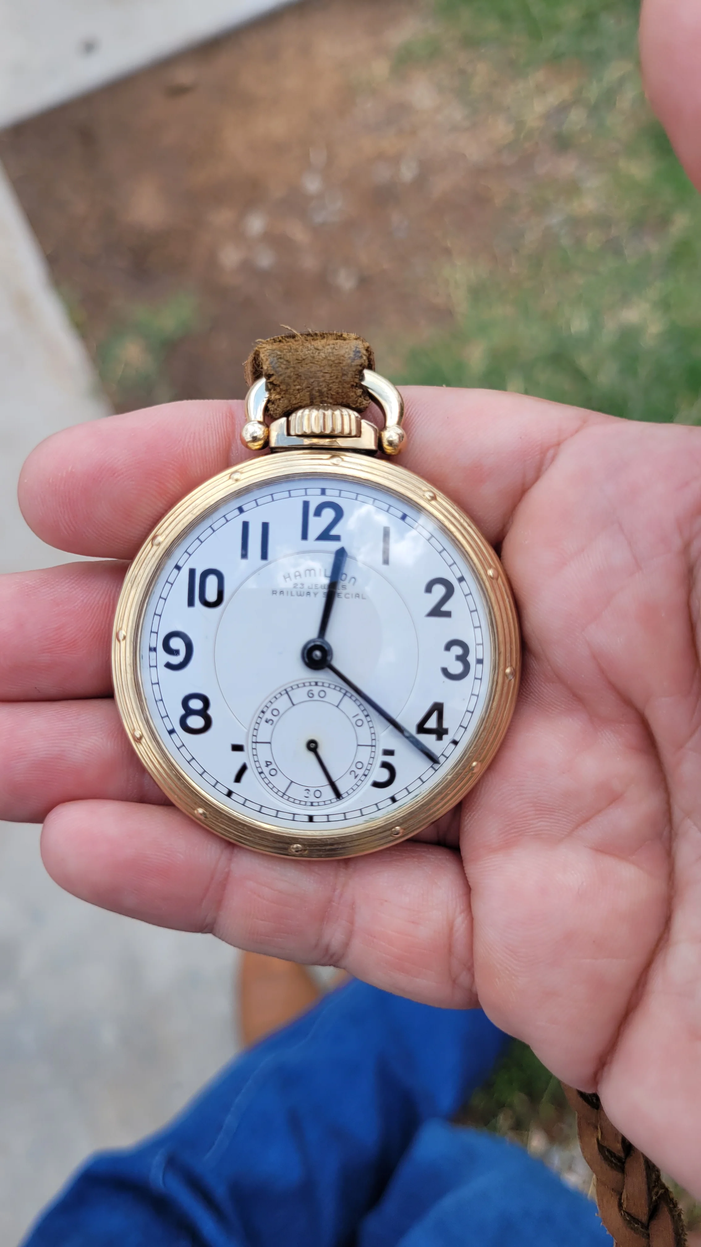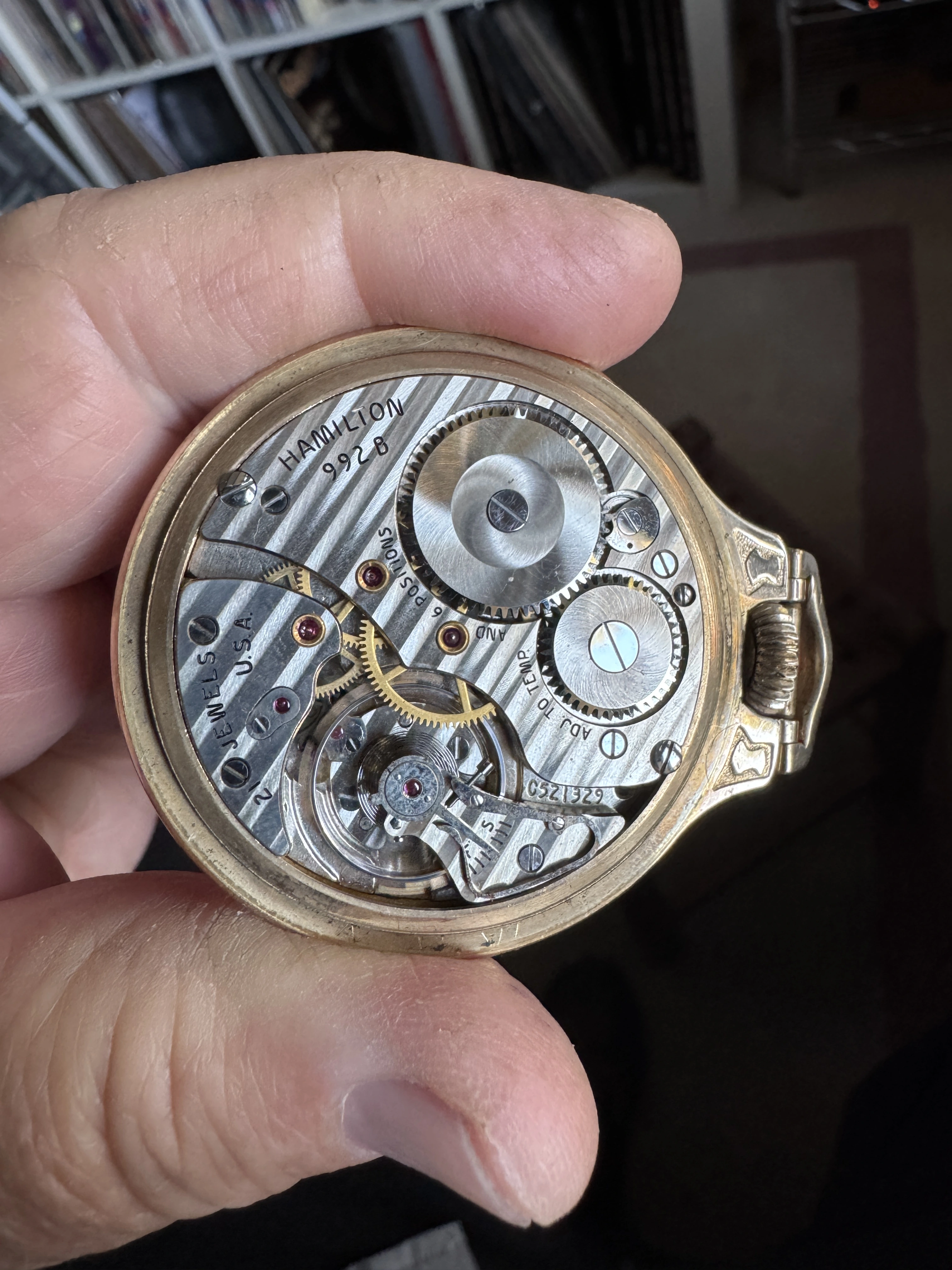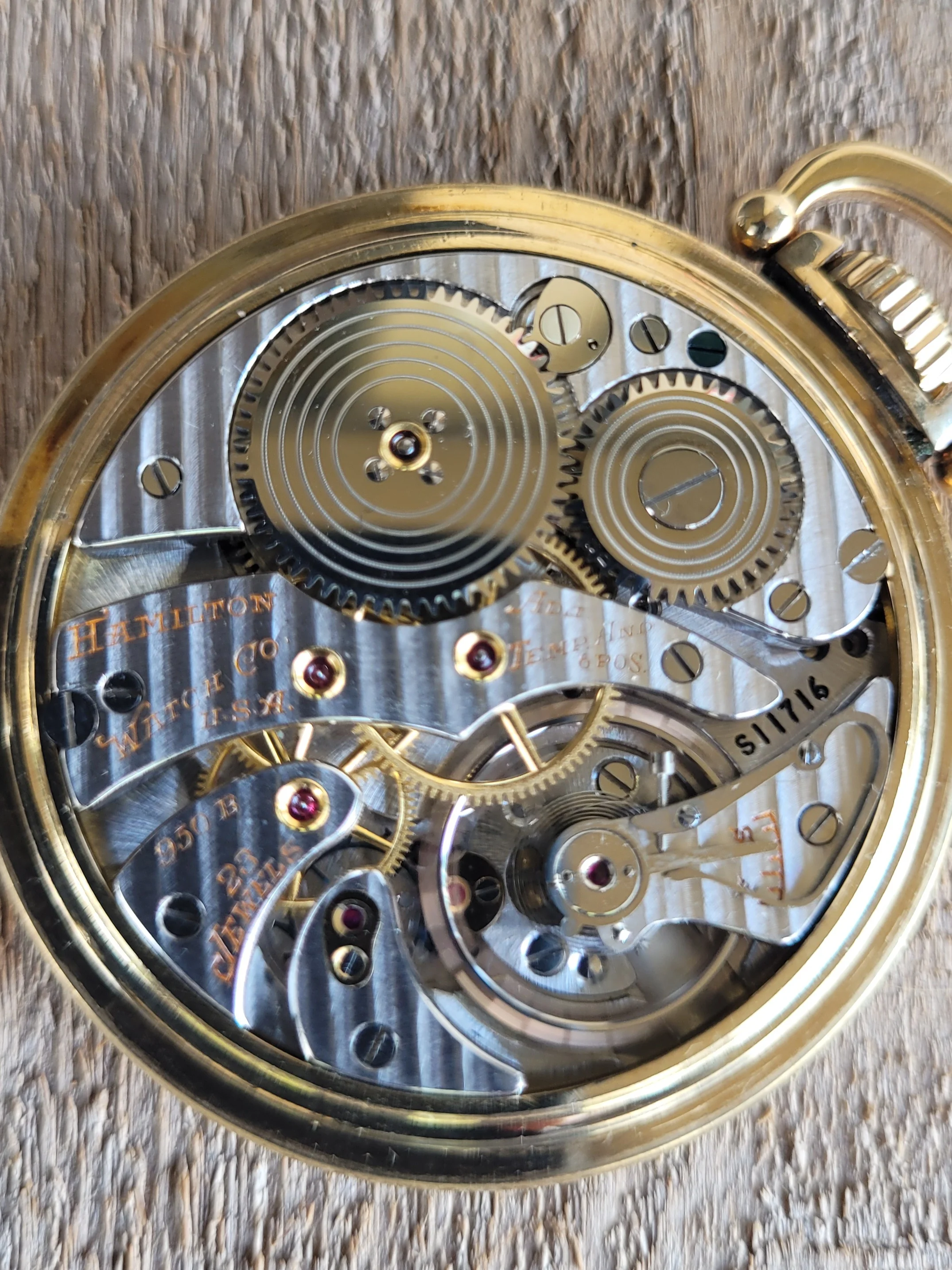 Earlier in this thread, I posted a picture of my Hamilton 950B which has had a double sunk vitreous enamel dial fitted to it. It came to me with a melamine dial which was factory original. When the vitreous enamel dial became available, I liked it better. I have saved the original melamine dial. I am showing my Hamilton 950B with the vitreous enamel dial again, along with a picture of the original melamine dial. The 950B posted by