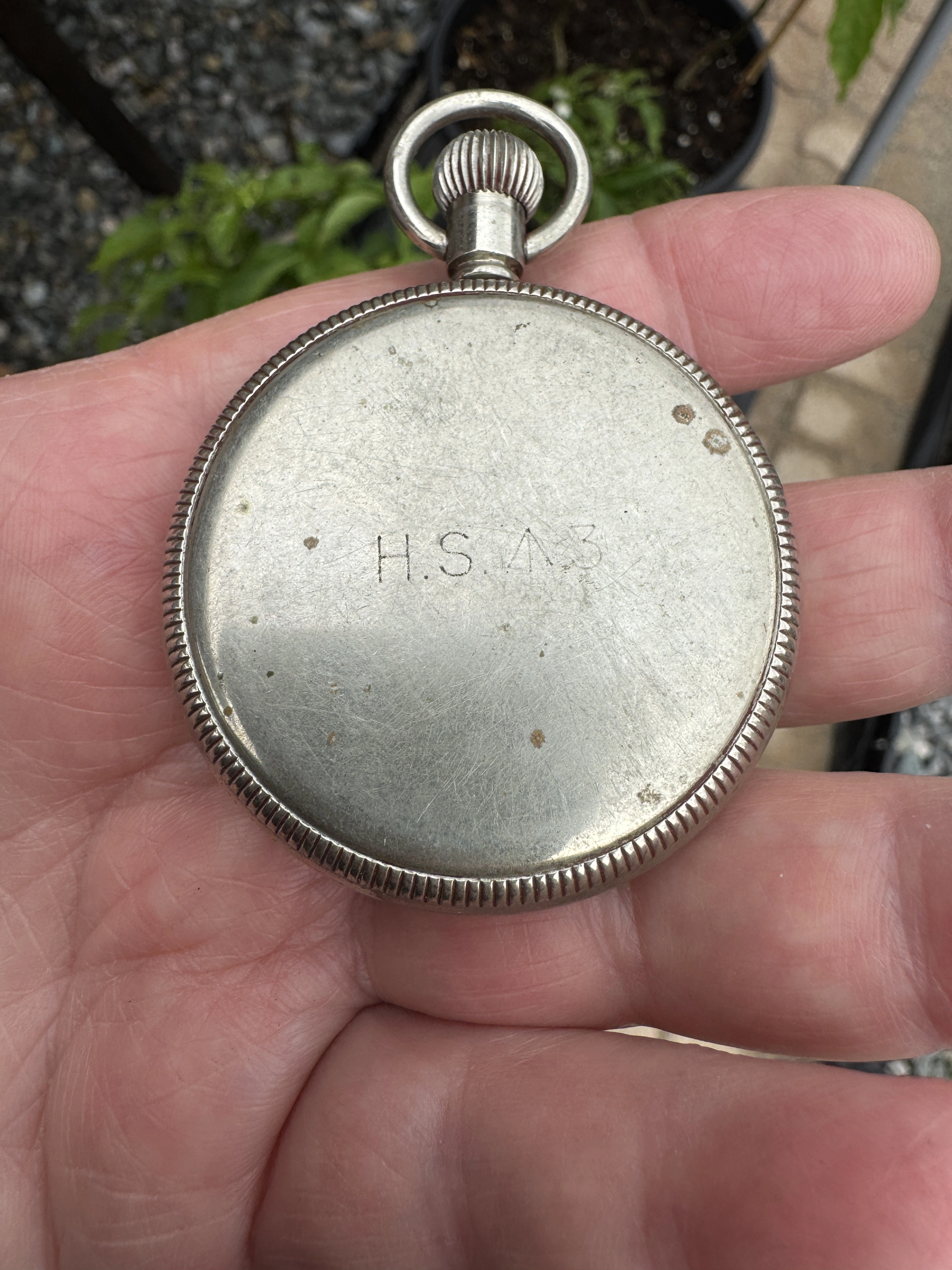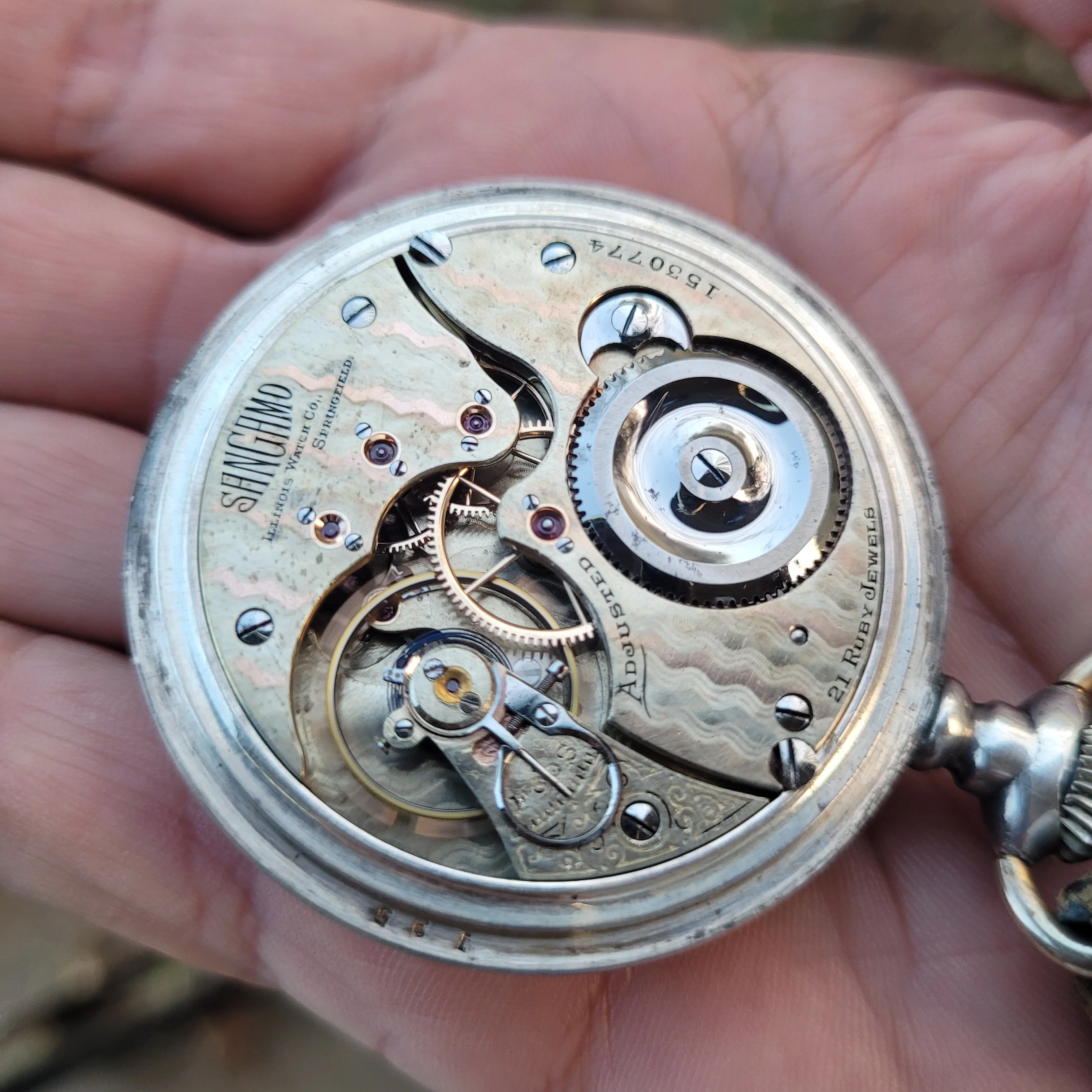 I'm wearing this circa 1900 Illinois Sangamo in a sterling case today. My favorite thing about this one is the two tone ribbon dameskeening.