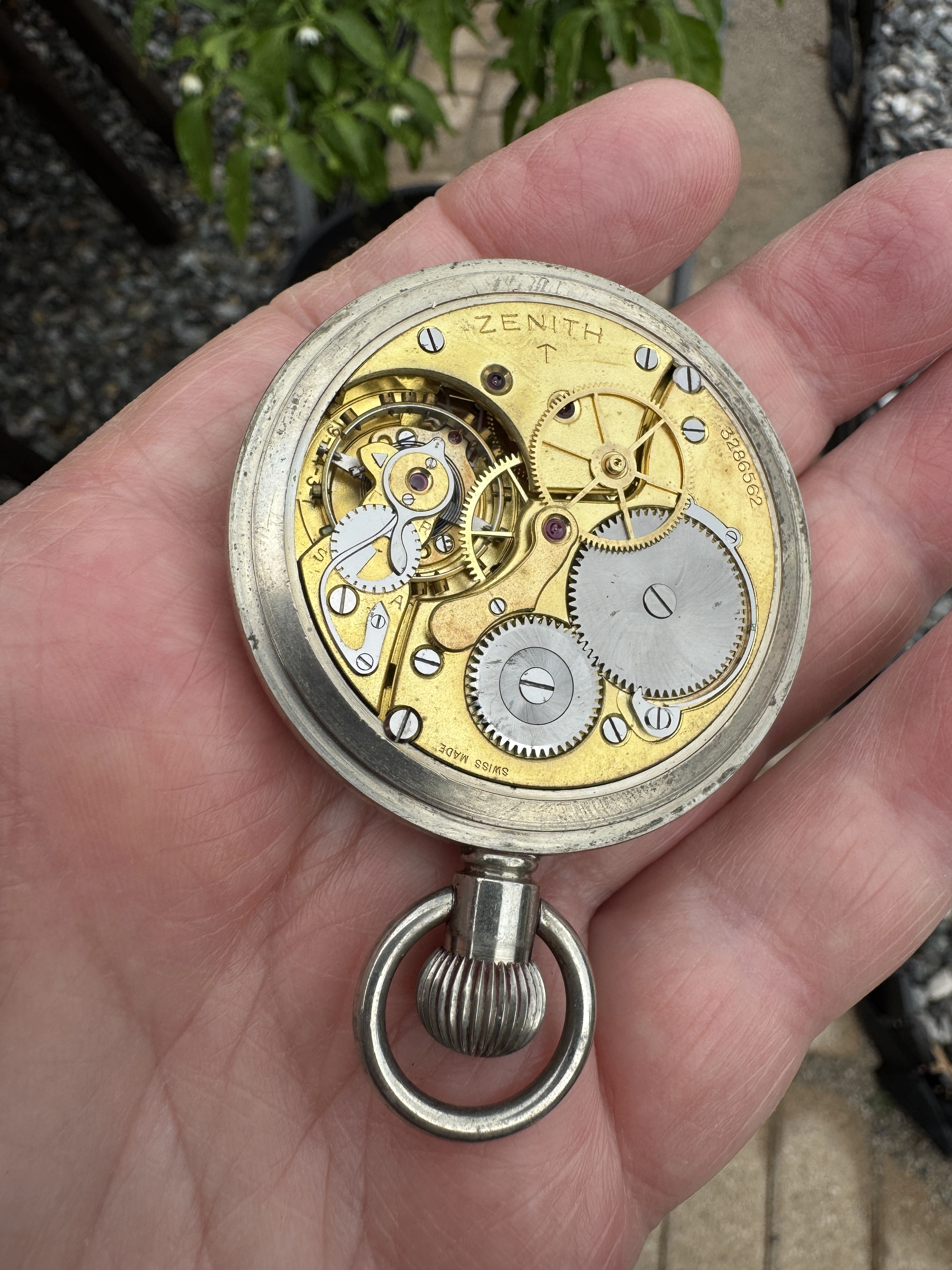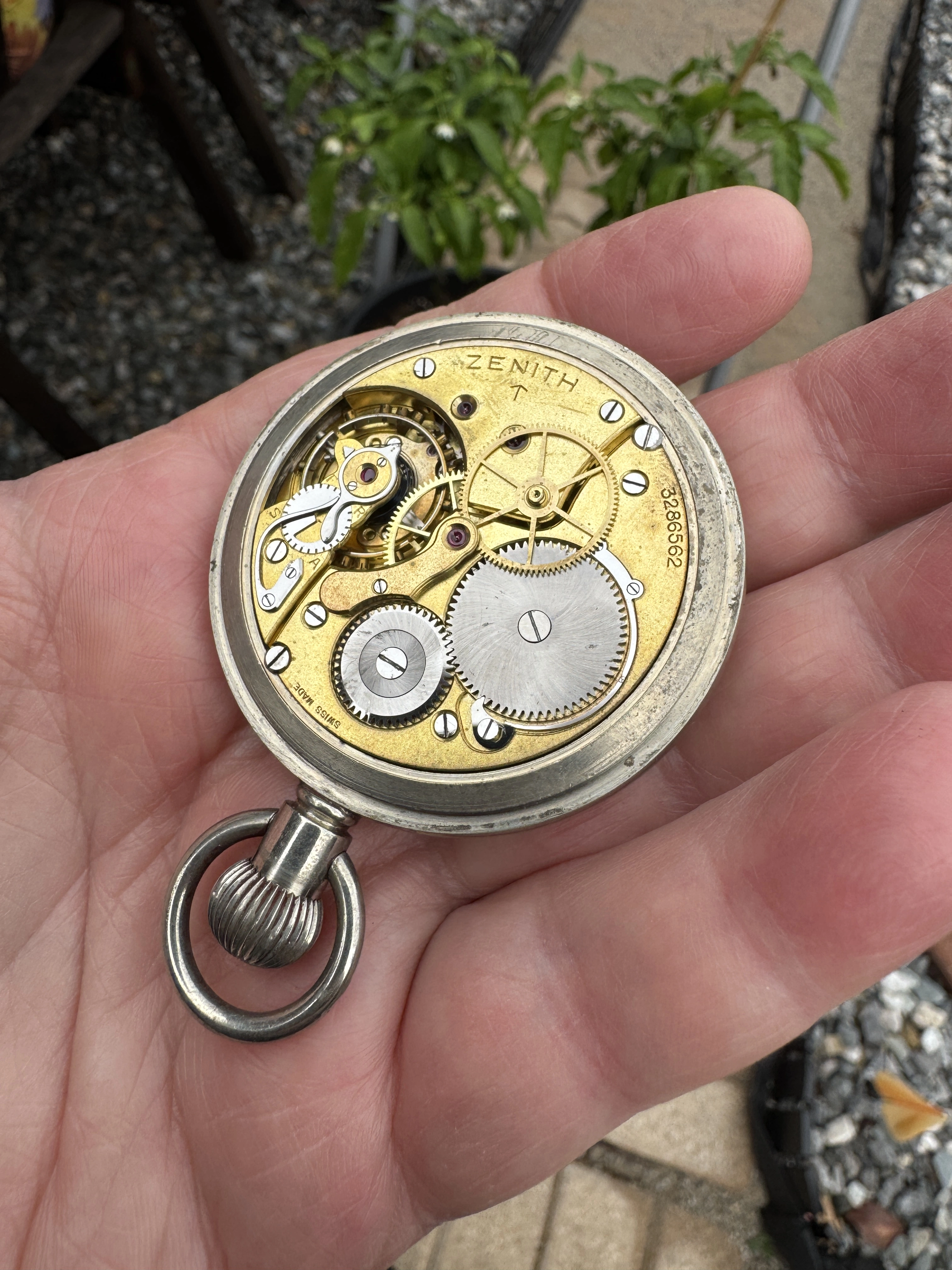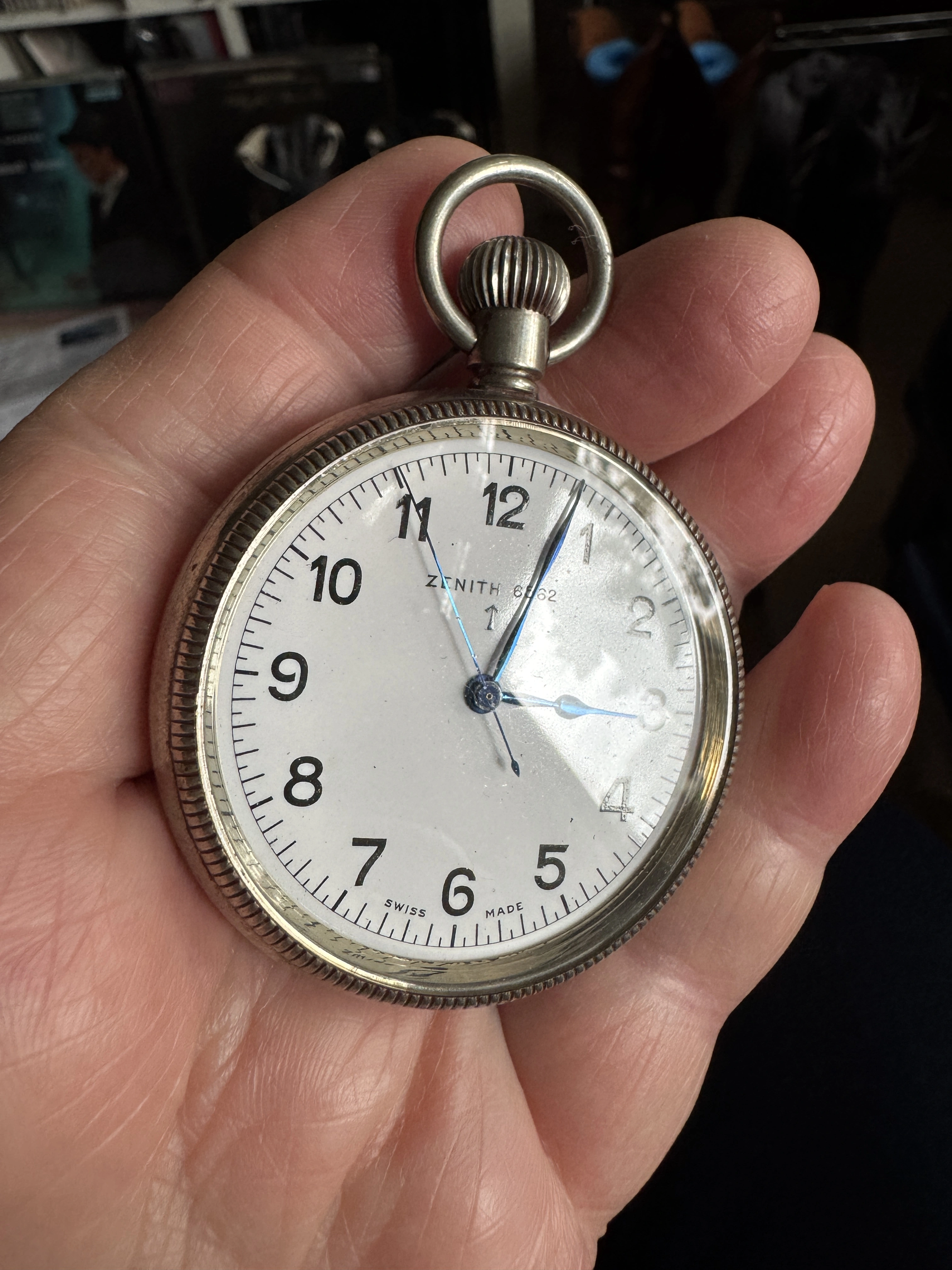That would match the Hamilton 3992B. The 16-size Zenith calibre 5 was approved for use on Canadian railroads. I am unaware if sweep seconds hands were ever approved for use on Canadian railroads. The Hamilton 3992B (like the subject Zenith) was primarily aimed at the navy. The only Swiss made pocket watch approved for use on U S railroads was the Ball grade 435 (B & C).