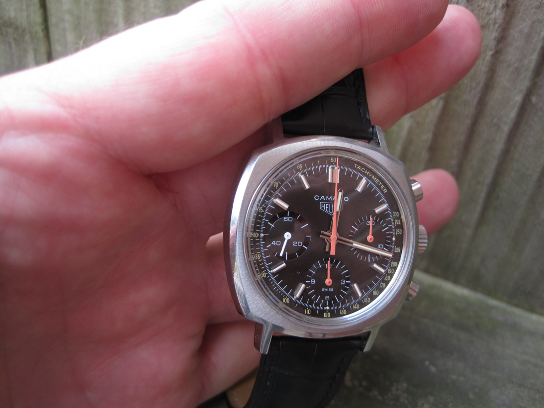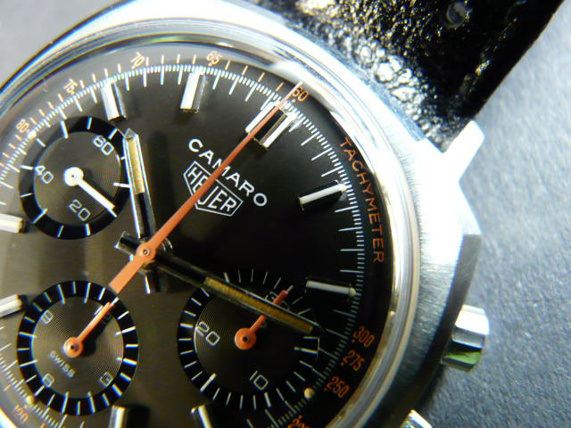 The dial has a nice chocolate finish to it and the hands are a vibrant orange. The white seconds hand has a minor scratch near the post but that was about all I could find. The case looks to be in good condition with some drawer storage scratches but otherwise it looks very good (at least to me).